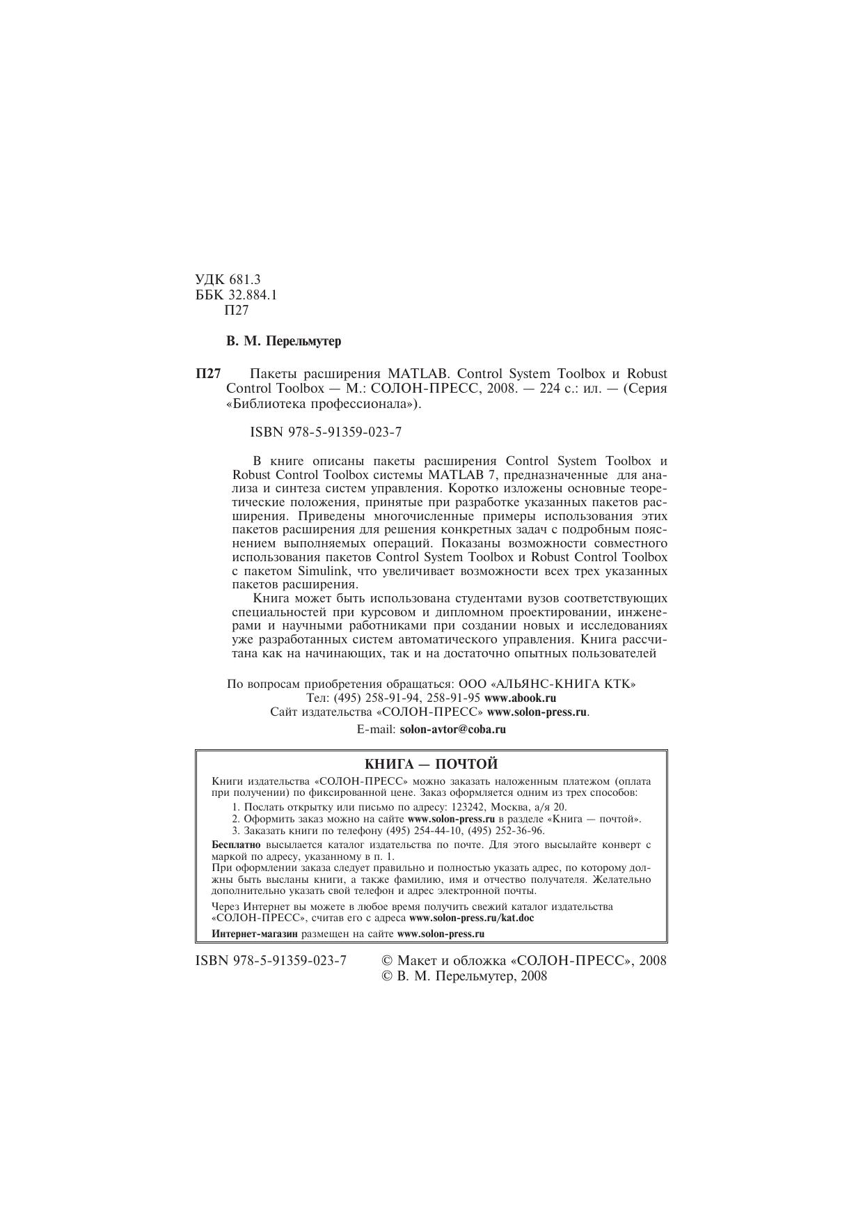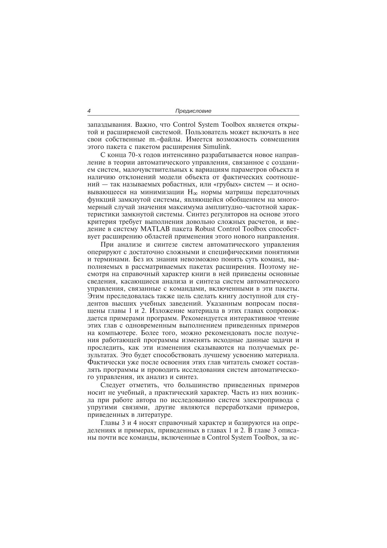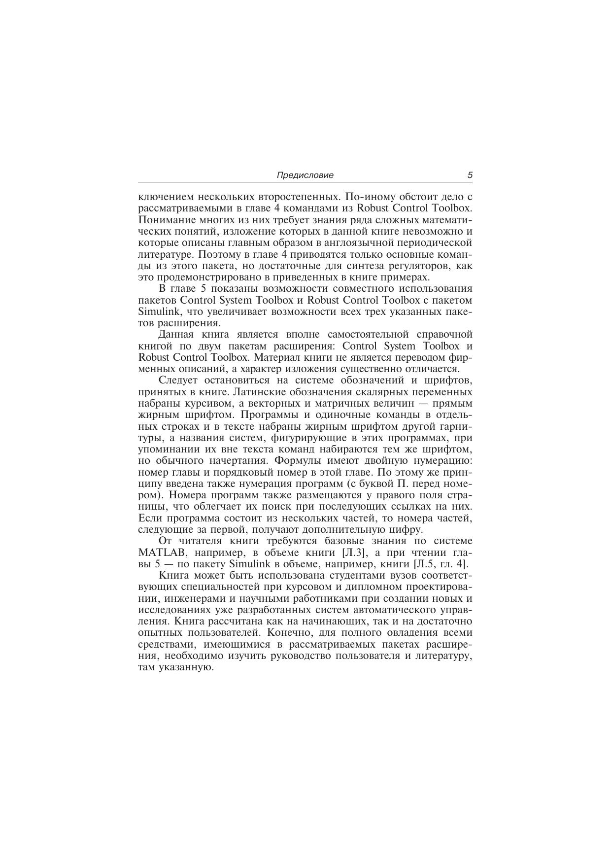 В книге описаны пакеты расширения Control System Toolbox и Robust Control Toolbox системы MATLAB 7, предназначенные для анализа и синтеза систем управления. Коротко изложены основные теоретические положения, принятые при разработке указанных пакетов расширения. Приведены многочисленные примеры использования этих пакетов расширения для решения конкретных задач с подробным пояснением выполняемых операций. Показаны возможности совместного использования пакетов Control System Toolbox и Robust Control Toolbox с пакетом Simulink, что увеличивает возможности всех трех указанных пакетов расширения.Книга может быть использована студентами вузов соответствующих специальностей при курсовом и дипломном проектировании, инженерами и научными работниками при создании новых и исследованиях уже разработанных систем автоматического управления. Книга рассчитана как на начинающих, так и на достаточно опытных пользователей