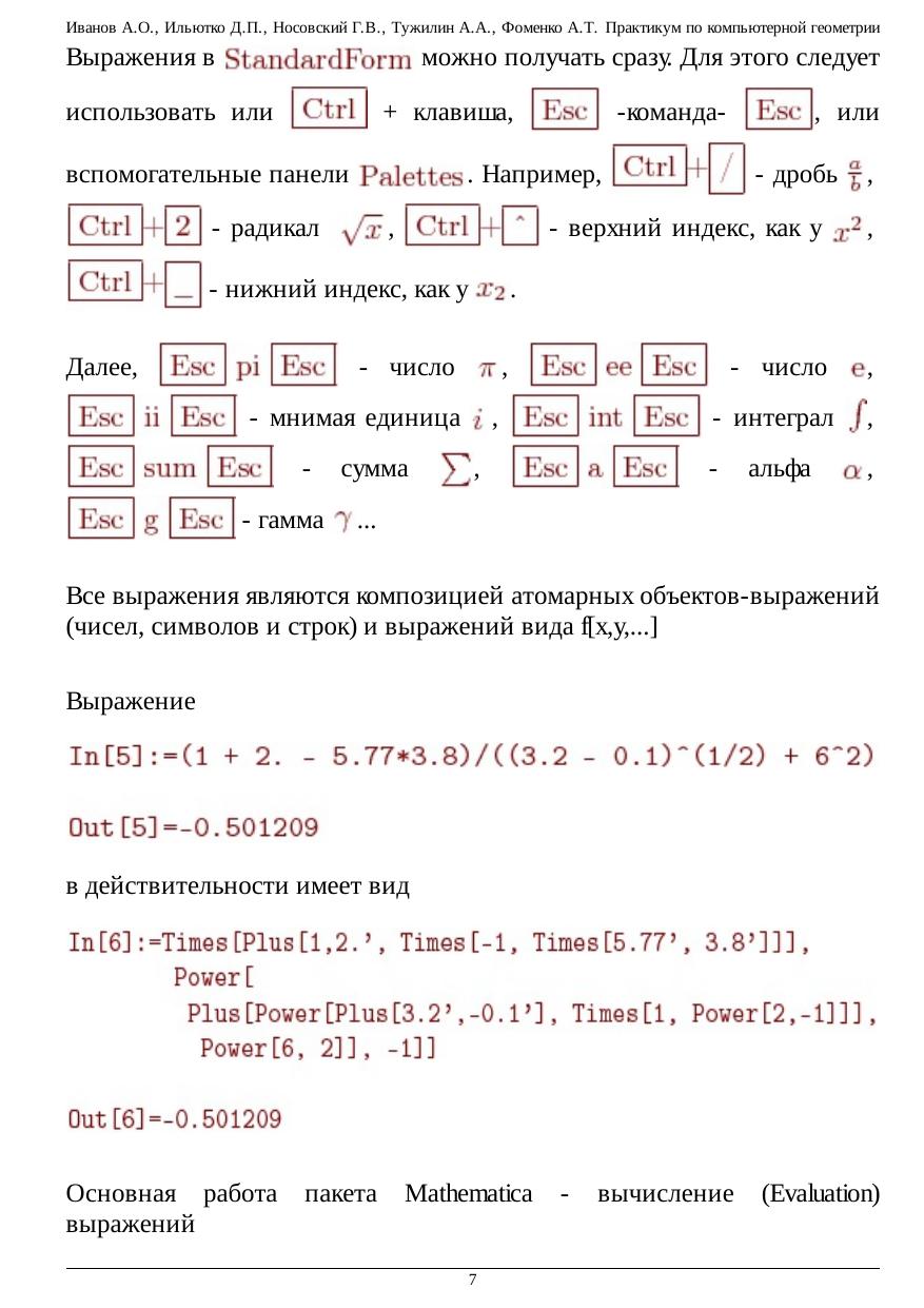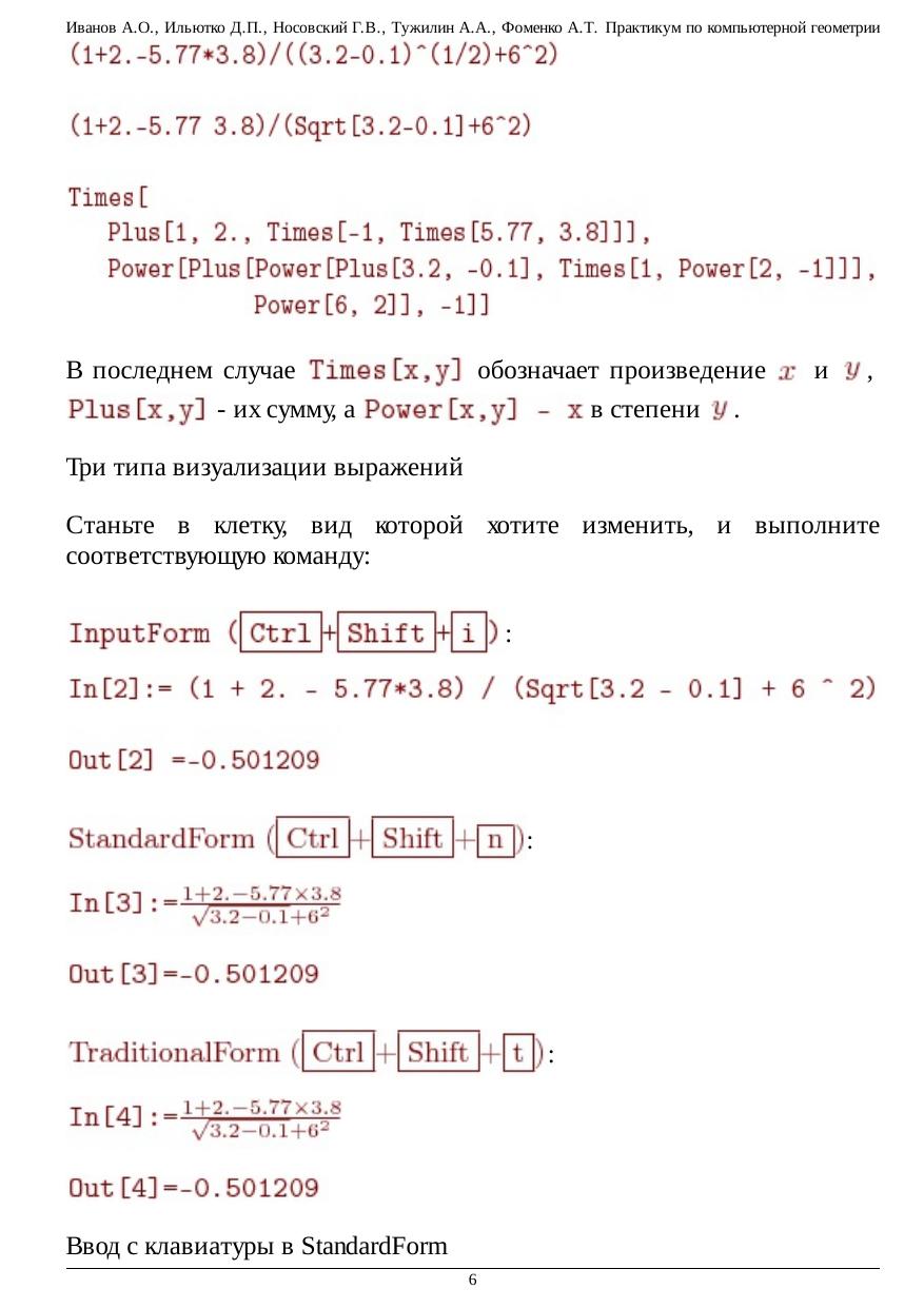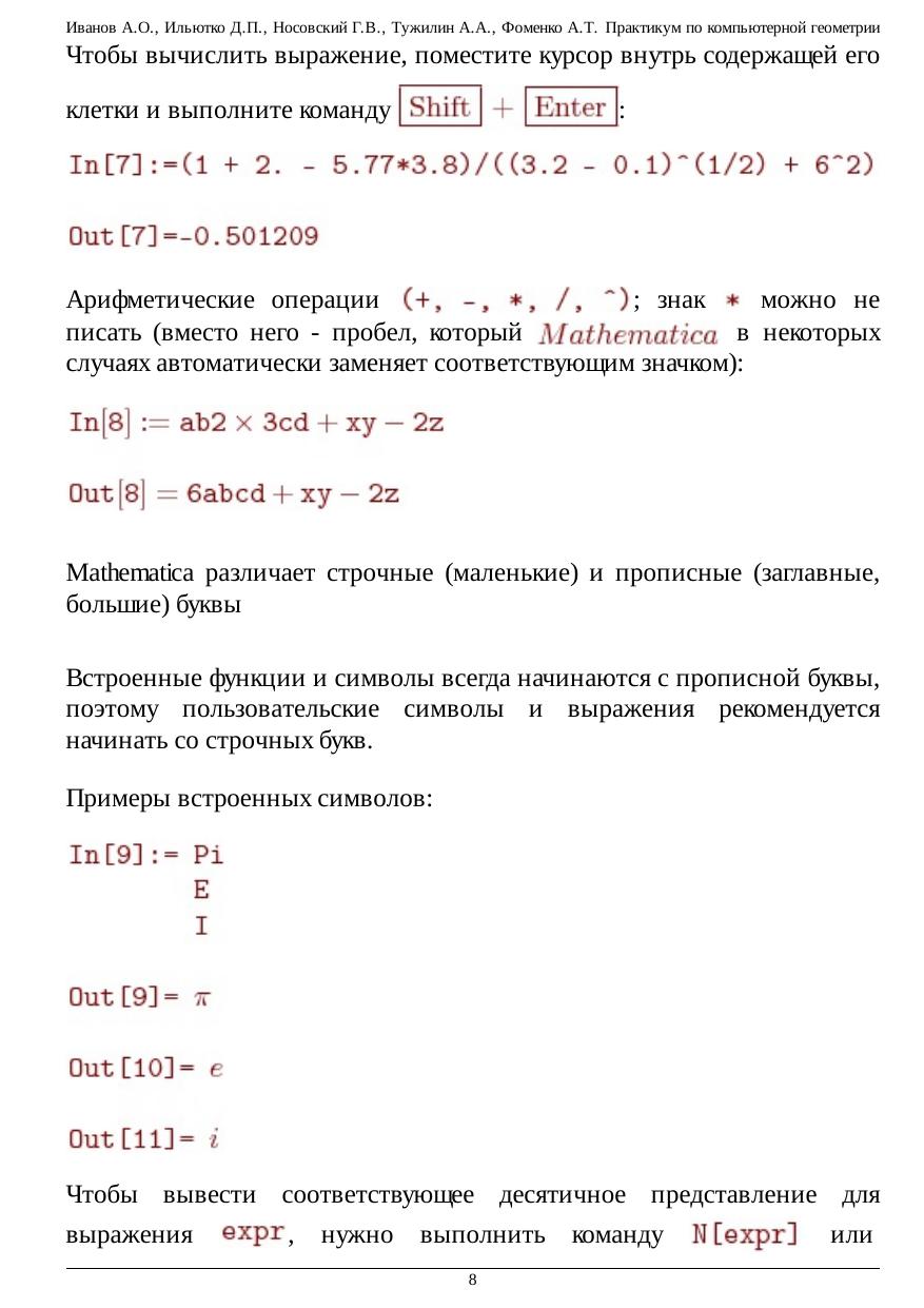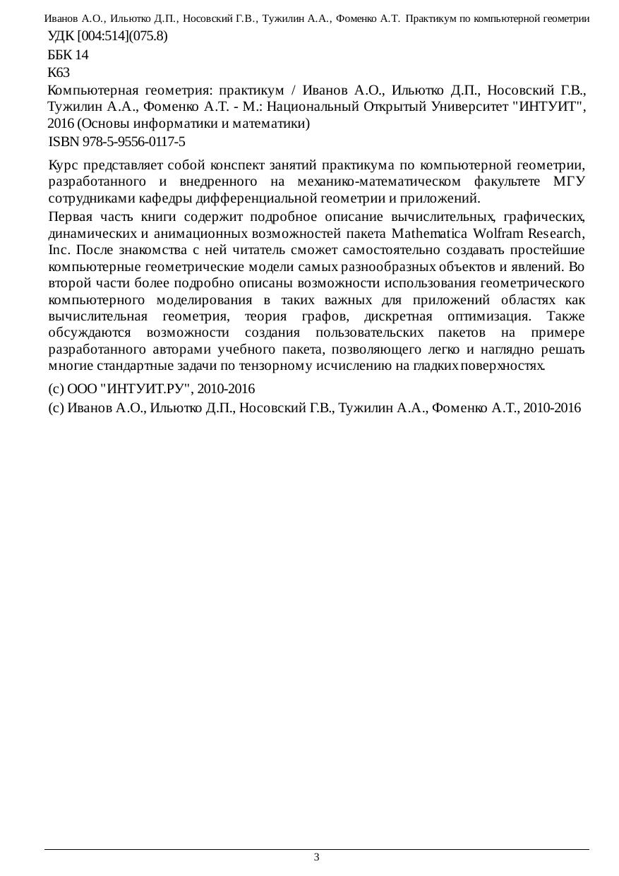 Курс представляет собой конспект занятий практикума по компьютерной геометрии, разработанного и внедренного на механико-математическом факультете МГУ сотрудниками кафедры дифференциальной геометрии и приложений. Первая часть книги содержит подробное описание вычислительных, графических, динамических и анимационных возможностей пакета Mathematica Wolfram Research, Inc. После знакомства с ней читатель сможет самостоятельно создавать простейшие компьютерные геометрические модели самых разнообразных объектов и явлений. Во второй части более подробно описаны возможности использования геометрического компьютерного моделирования в таких важных для приложений областях как