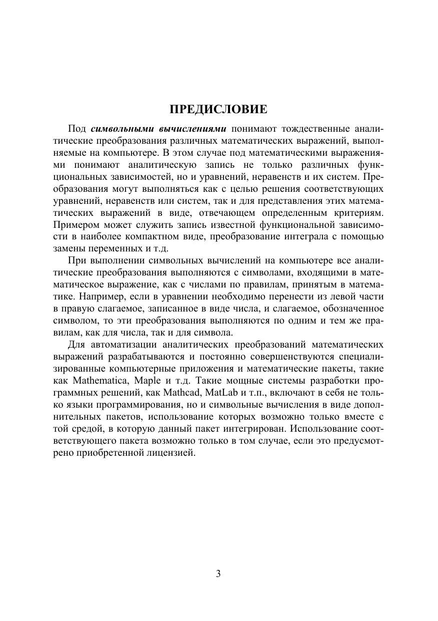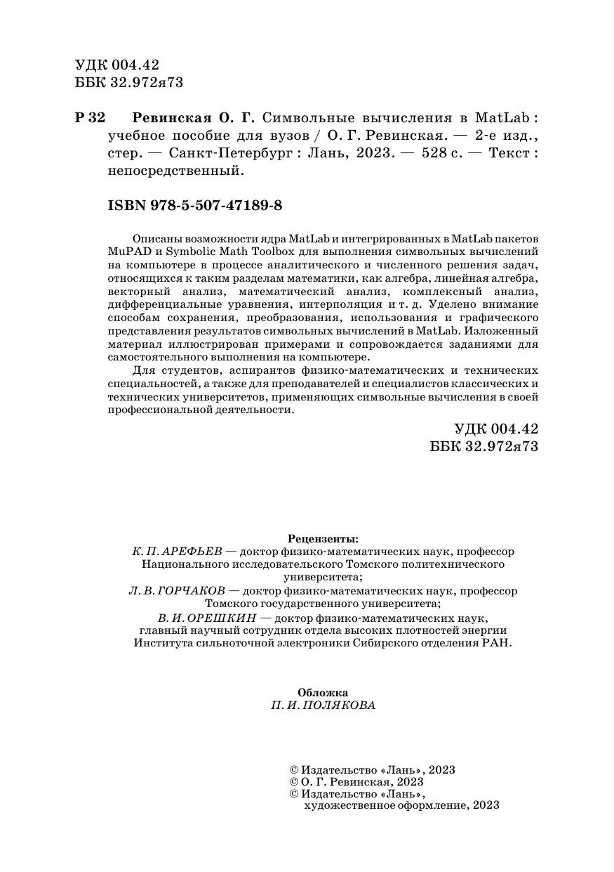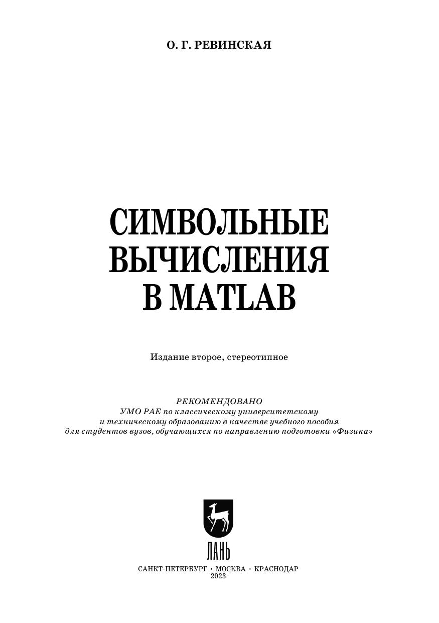 Описаны возможности ядра MatLab и интегрированных в MatLab пакетов MuPAD и Symbolic Math Toolbox для выполнения символьных вычислений на компьютере в процессе аналитического и численного решении задач, относящихся к таким разделам математики как алгебра, линейная алгебра, векторный анализ, математический анализ, комплексный анализ, дифференциальные уравнения, интерполяция и т. д. Уделено внимание способам сохранения, преобразования, использования и графического представления результатов символьных вычислений в MatLab. Изложенный материал иллюстрирован примерами и сопровождается заданиями для самостоятельного выполнения на компьютере. Для студентов, аспирантов физико-математических и технических специальностей, а также для преподавателей и специалистов классических и технических университетов, применяющих символьные вычисления в своей профессиональной деятельности.