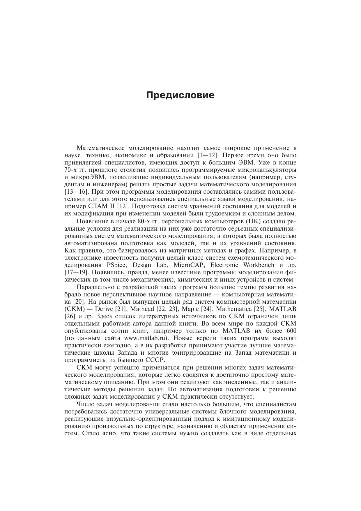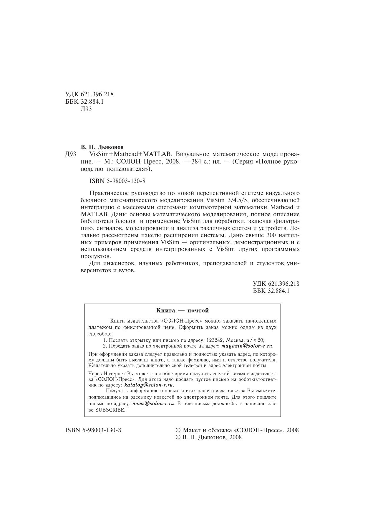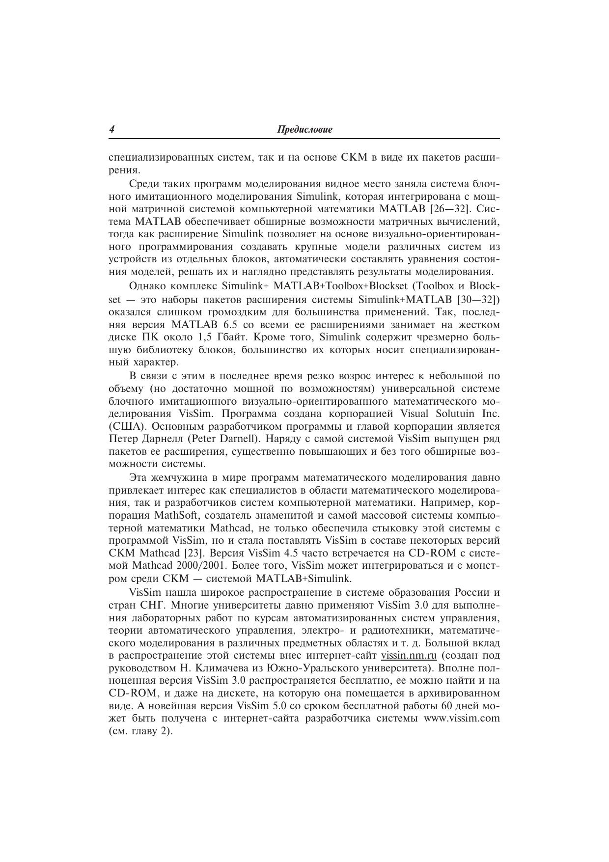 Практическое руководство по новой перспективной системе визуального блочного математического моделирования VisSim 3/4.5/5, обеспечивающей интеграцию с массовыми системами компьютерной математики Mathcad и MATLAB. Даны основы математического моделирования, полное описание библиотеки блоков и применение VisSim для обработки, включая фильтрацию, сигналов, моделирования и анализа различных систем и устройств. Детально рассмотрены пакеты расширения системы. Дано свыше 300 наглядных примеров применения VisSim — оригинальных, демонстрационных и с использованием средств интегрированных с VisSim других программных продуктов.Для инженеров, научных работников, преподавателей и студентов университетов и вузов.