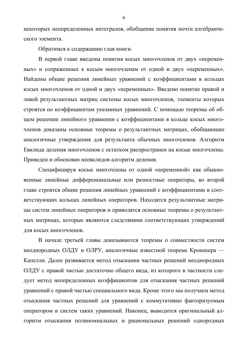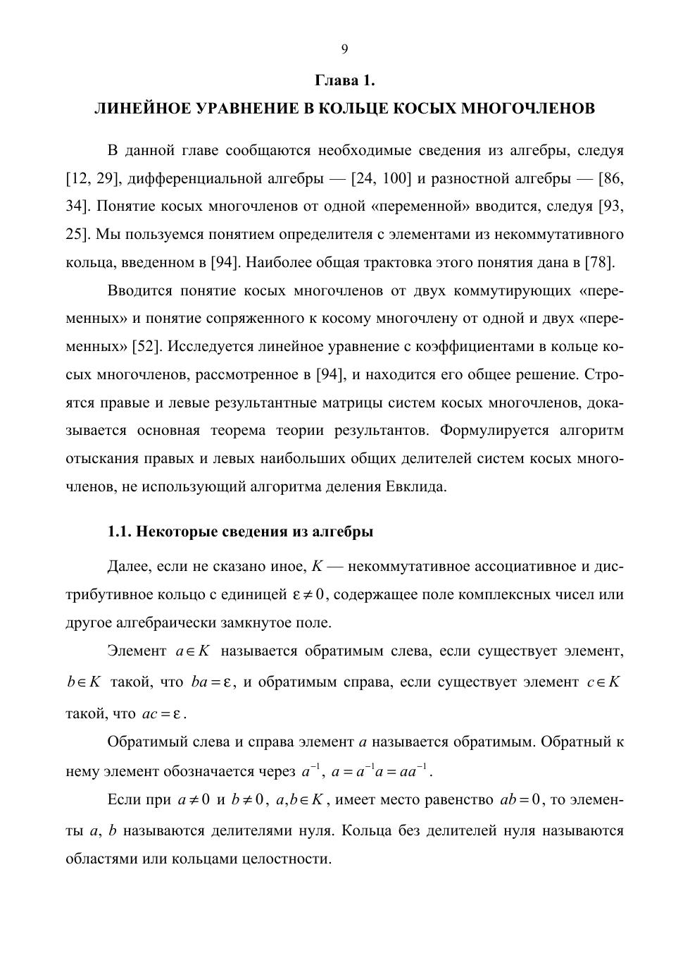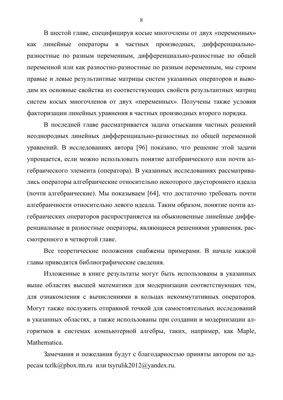 В книге вводятся понятия косых многочленов от двух коммутирующих «переменных» и сопряженных к косым многочленам от одной и двух «переменных». Исследуется линейное уравнение с коэффициентами в алгебре с делением и находится его общее решение. Строятся правые и левые результантные матрицы систем косых многочленов. Рассматриваются некоторые их свойства. Доказывается теорема о связи рангов результантных матриц с порядком их правого (ПНОД) и левого (ЛНОД) наибольшего общего делителя и наименьшего общего кратного, формулируется алгоритм вычисления ПНОД и ЛНОД системы косых многочленов, отличный от известных алгоритмов.