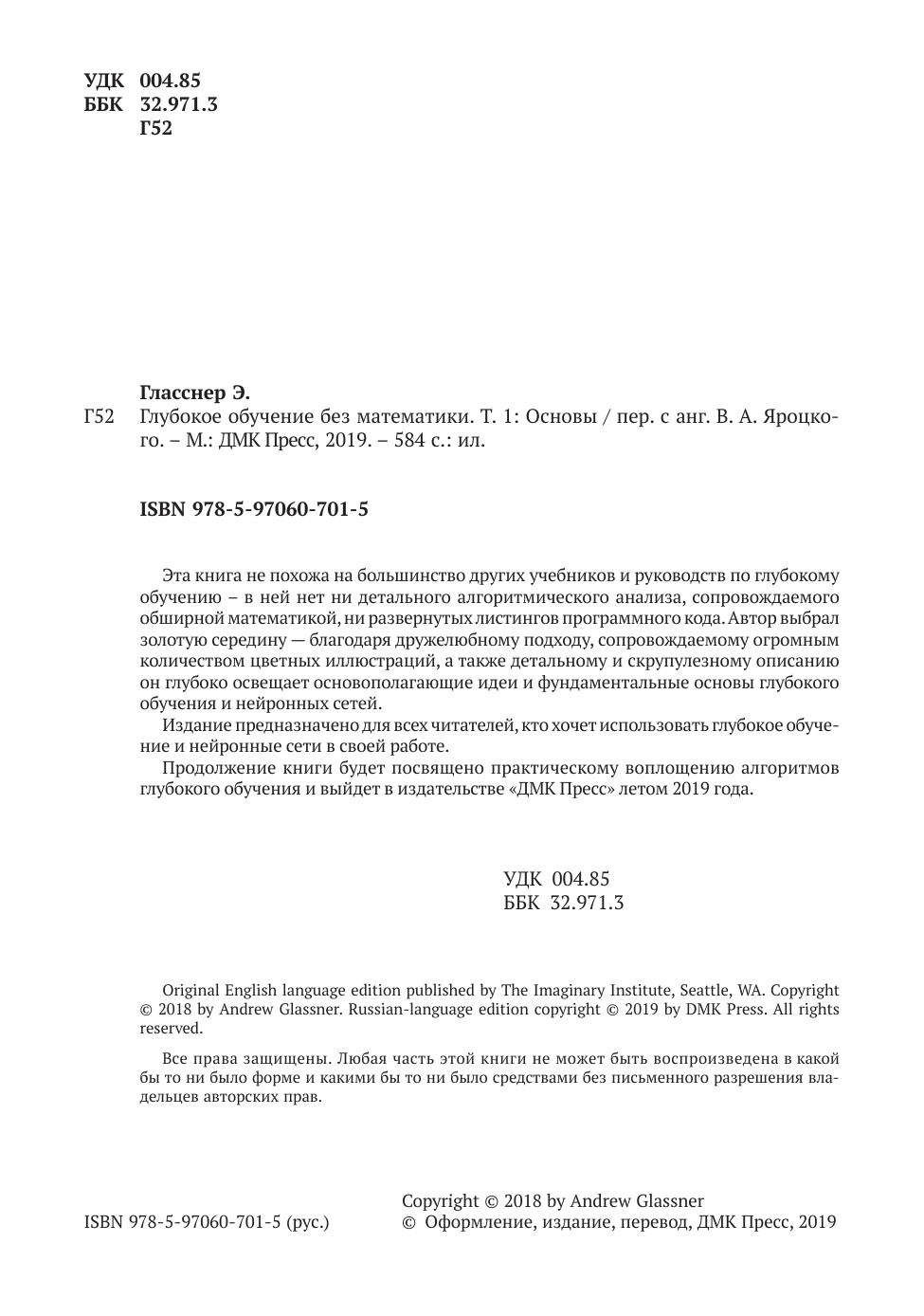 Издание предназначено для всех читателей, кто хочет использовать глубокое обучение в своей работе. Это программисты, инженеры, ученые, руководители, музыканты, врачи и все, кто хочет работать с большими объемами данных, извлекая из них полезную информацию или формируя новые данные.