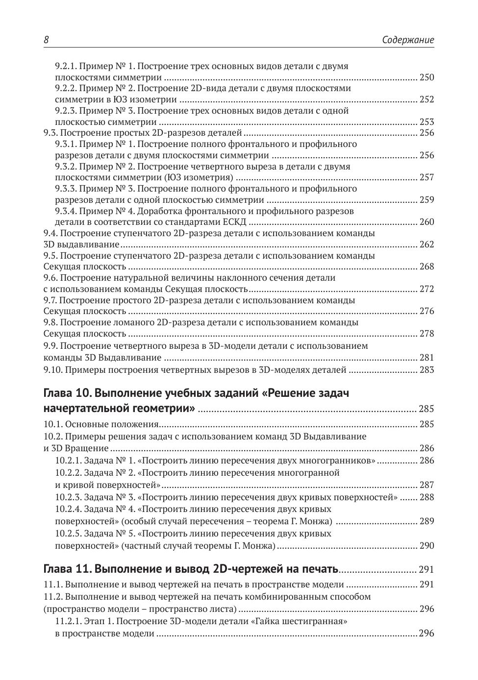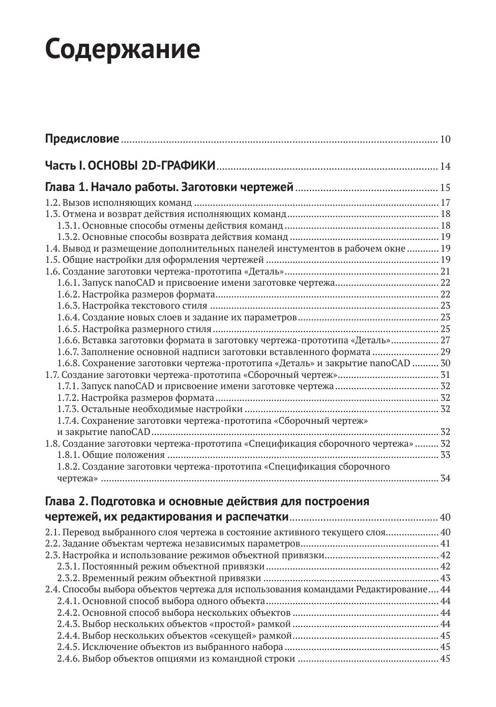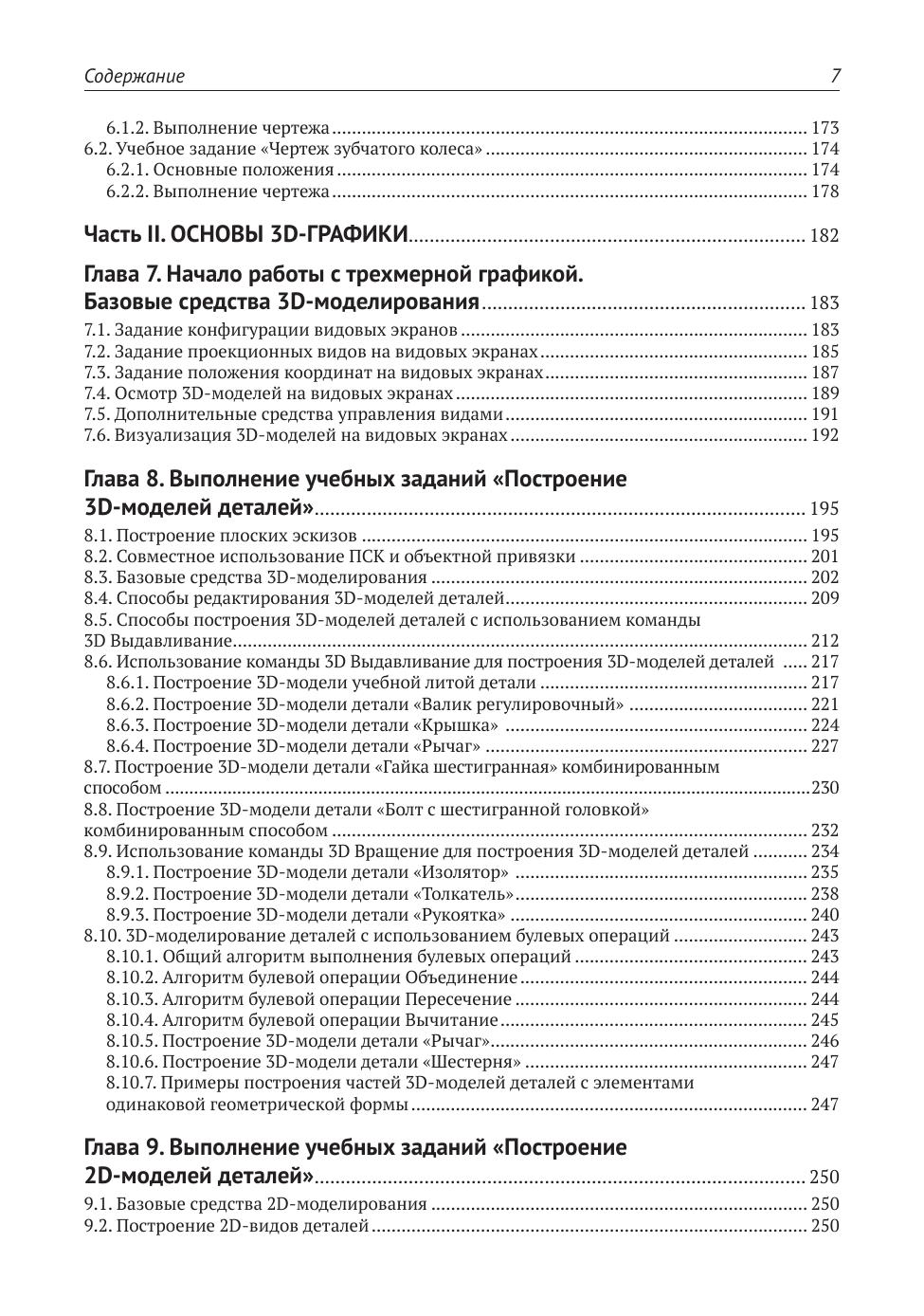 В части I «Основы 2D-графики» и в части II «Основы 3D-графики» на многочисленных примерах натурных образцов учебных и реальных деталей рассмотрена методика выполнения заданий по дисциплине «Компьютерная графика». Из учебного курса «Начертательная геометрия» разобраны примеры построения линий пересечения поверхностей.