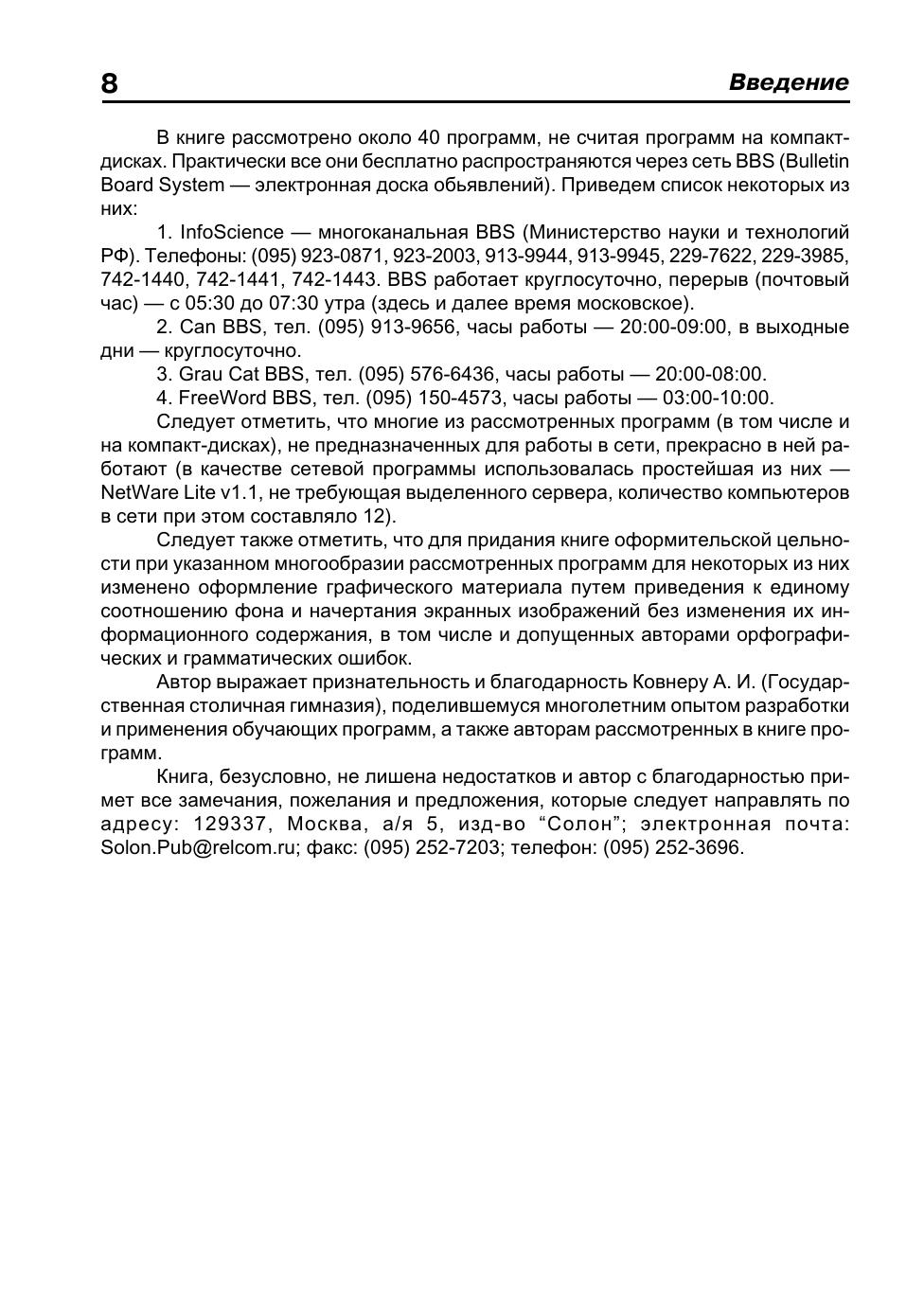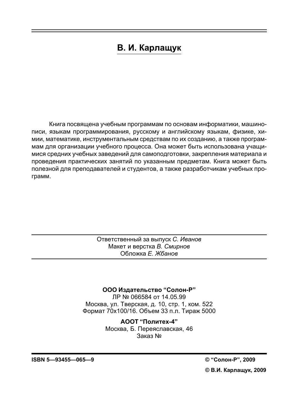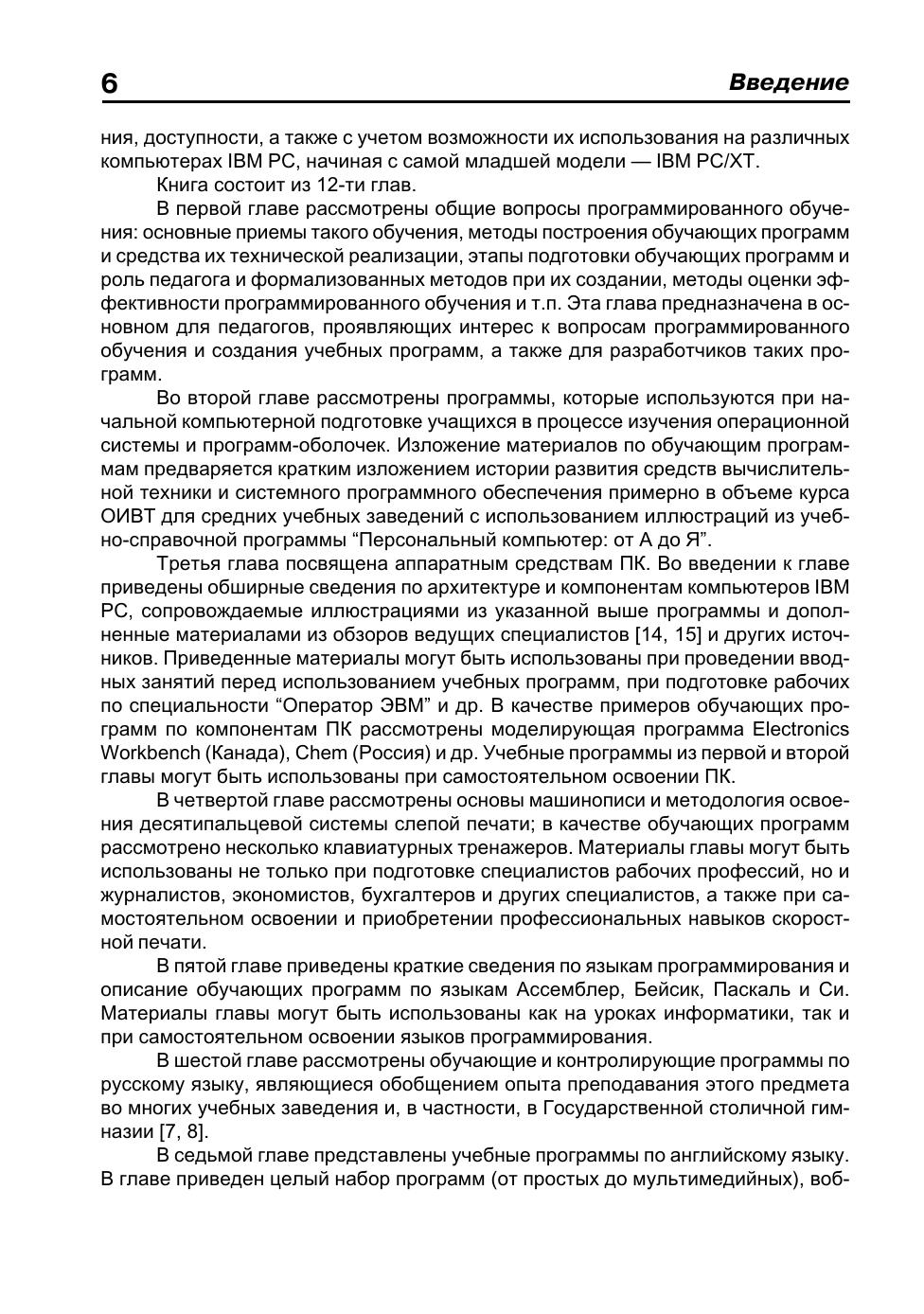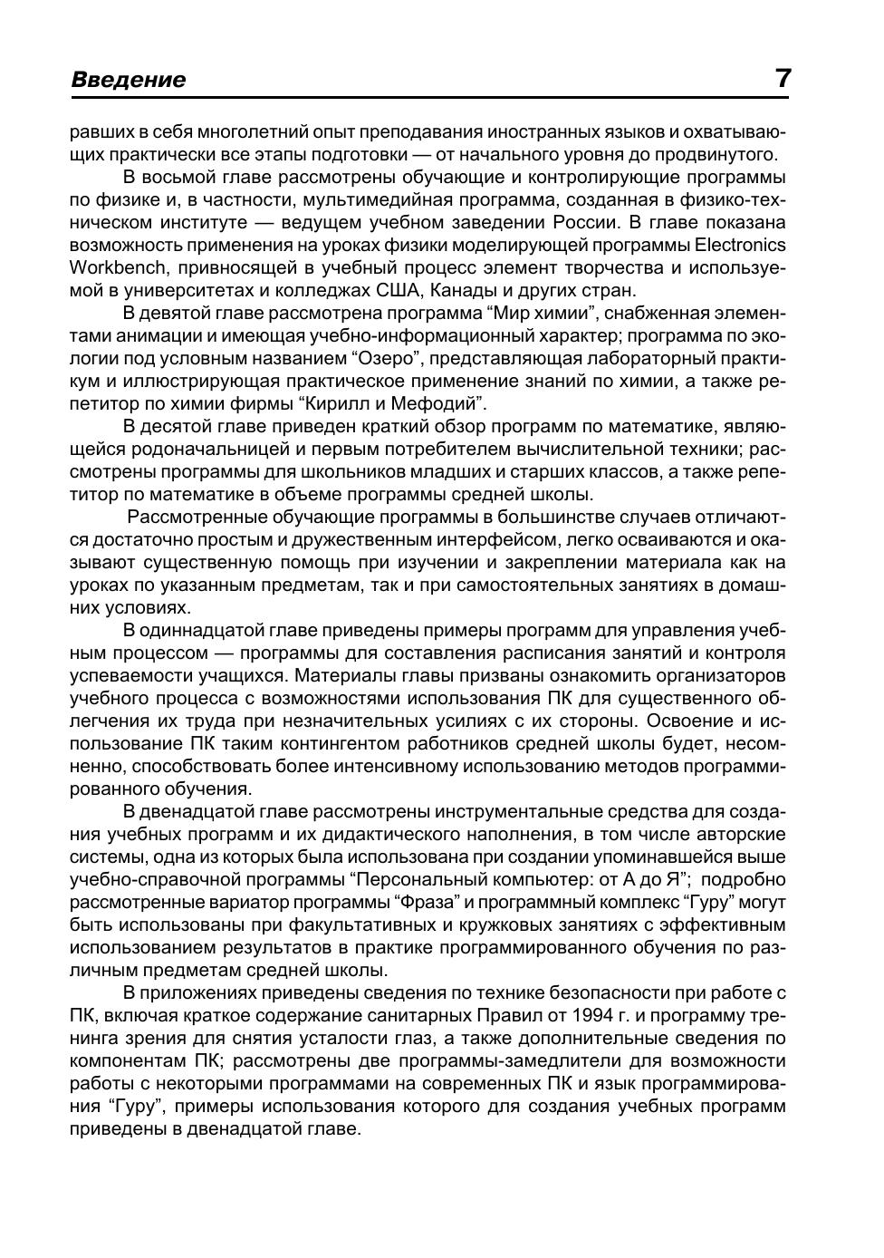 Книга посвящена учебным программам по основам информатики, машинописи, языкам программирования, русскому и английскому языкам, физике, химии, математике, инструментальм средствам по их созданию, а также программам для организации учебного процесса.