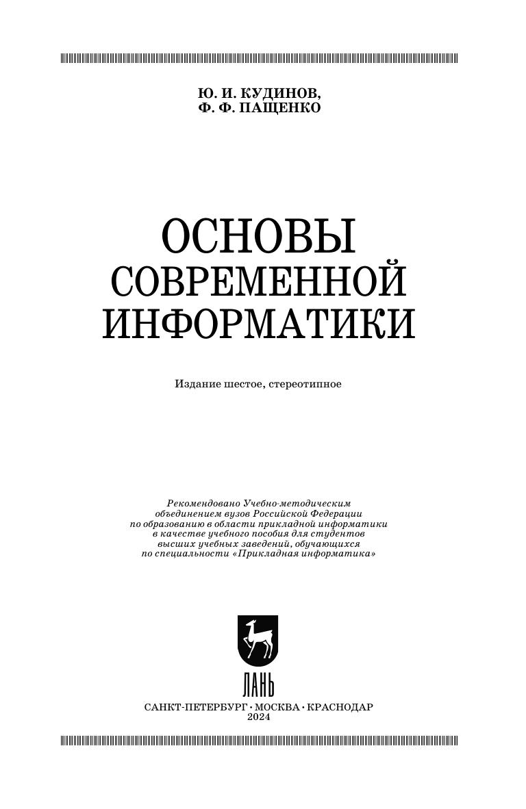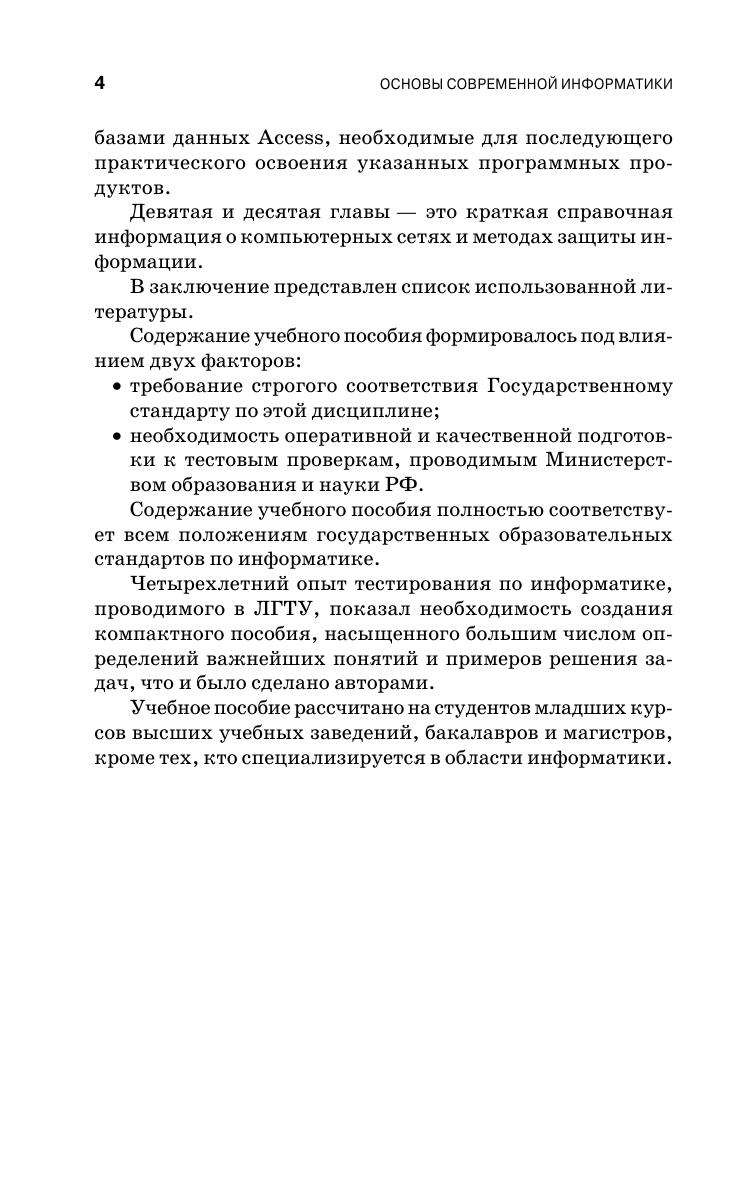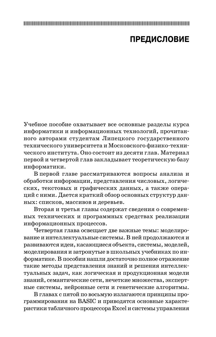 В учебном пособии представлены все разделы информатики, определяющие современный уровень подготовки специалистов в системе высшего образования. По своему содержанию книга полностью соответствует требованиям государственных стандартов. Пособие предназначено для студентов всех специальностей и направлений подготовки, исключая тех, кто специализируется в области информатики.