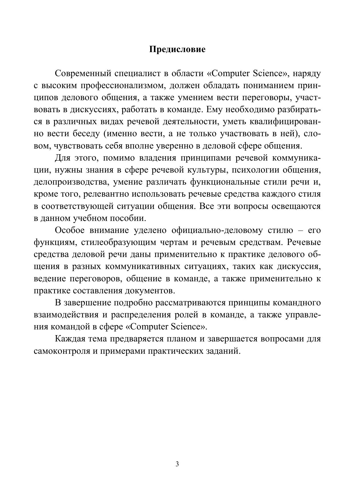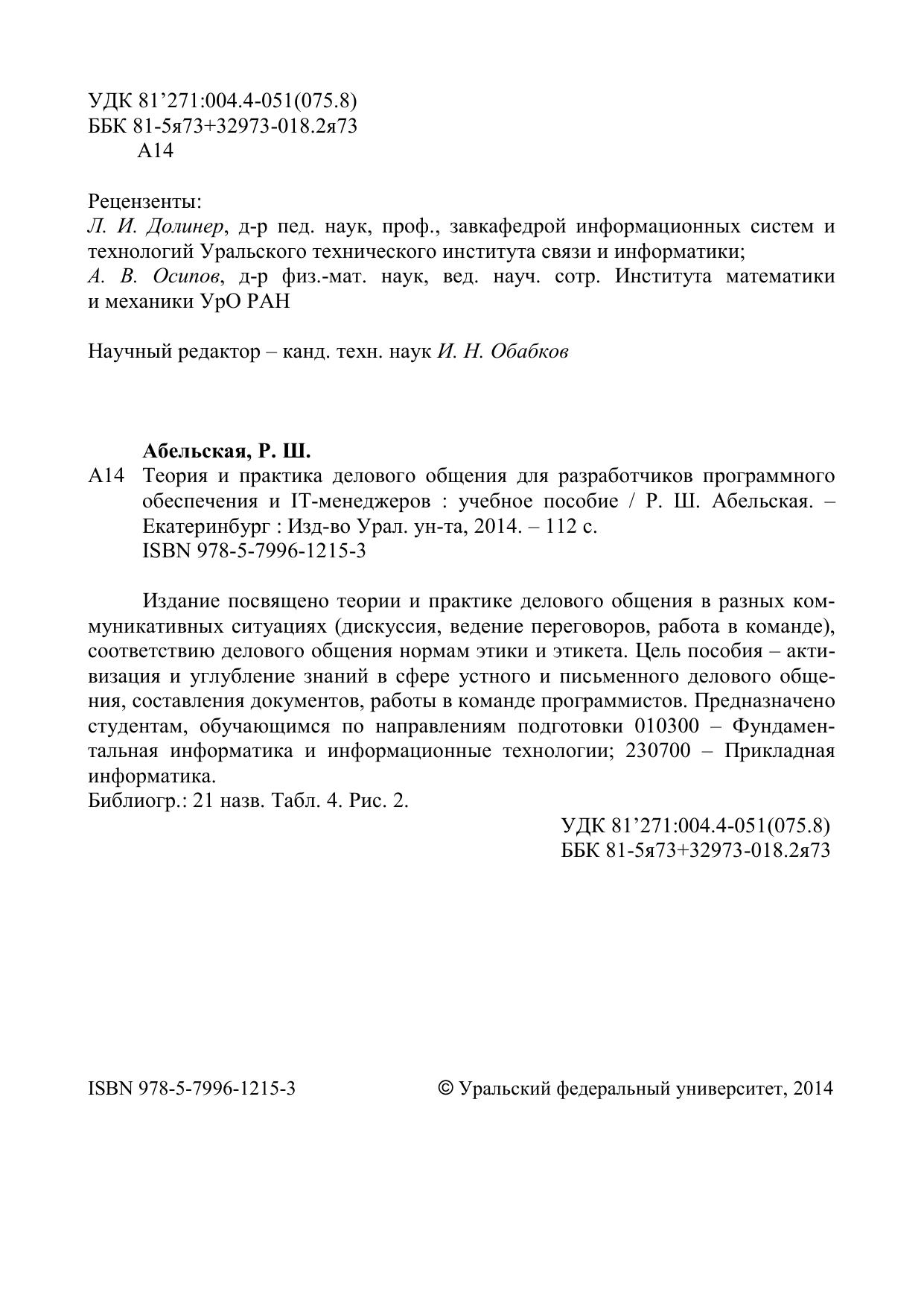 Издание посвящено теории и практике делового общения в разных коммуникативных ситуациях (дискуссия, ведение переговоров, работа в команде), соответствию делового общения нормам этики и этикета. Цель пособия – активизация и углубление знаний в сфере устного и письменного делового общения, составления документов, работы в команде программистов. Предназначено студентам, обучающимся по направлениям подготовки 010300 – Фундаментальная информатика и информационные технологии; 230700 – Прикладная информатика. Библиогр.: 21 назв. Табл. 4. Рис. 2.
