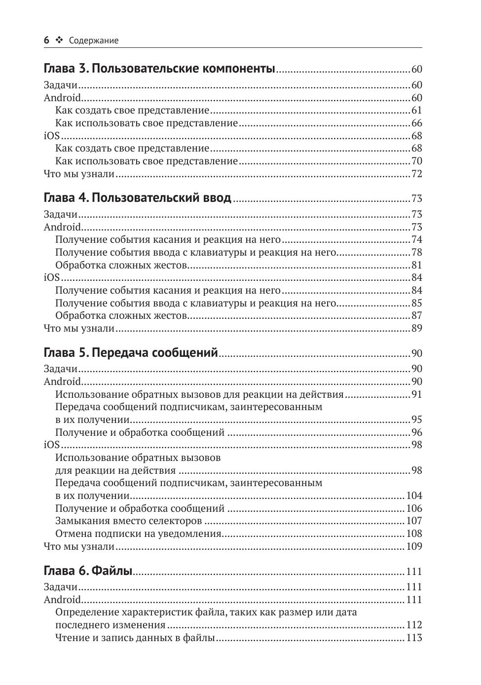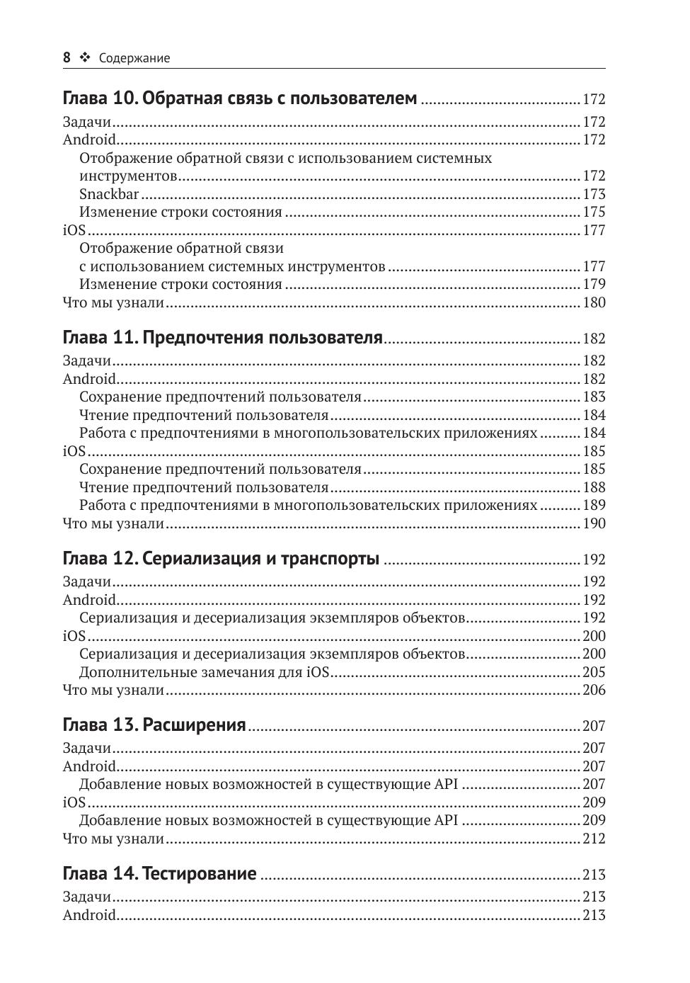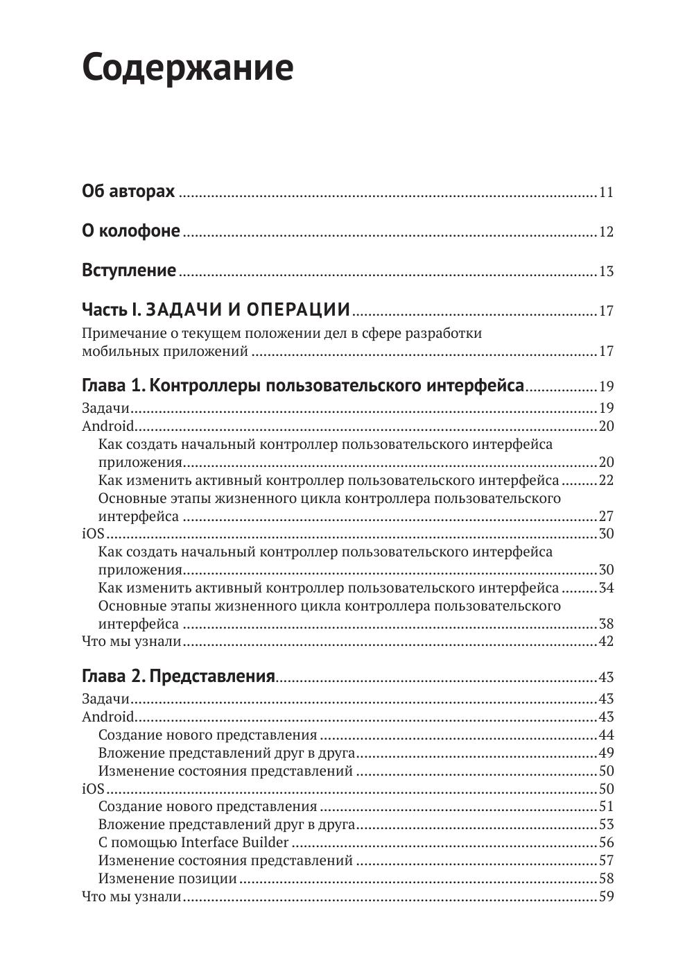 В первой части представлены решения распространенных задач, которые приходится решать на любой платформе, таких как запись файла в локальное хранилище или создание HTTP-запроса. Вторая часть описывает процесс создания приложения на каждой платформе с использованием приемов из первой части. Примеры кода для Android представлены на двух языках – Java и Kotlin, поэтому книга может служить перекрестным справочником не только между iOS и AOSP, но и между Java и Kotlin для разработчиков на Android.