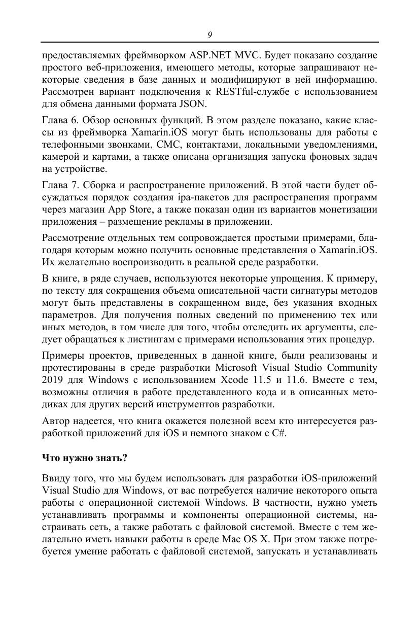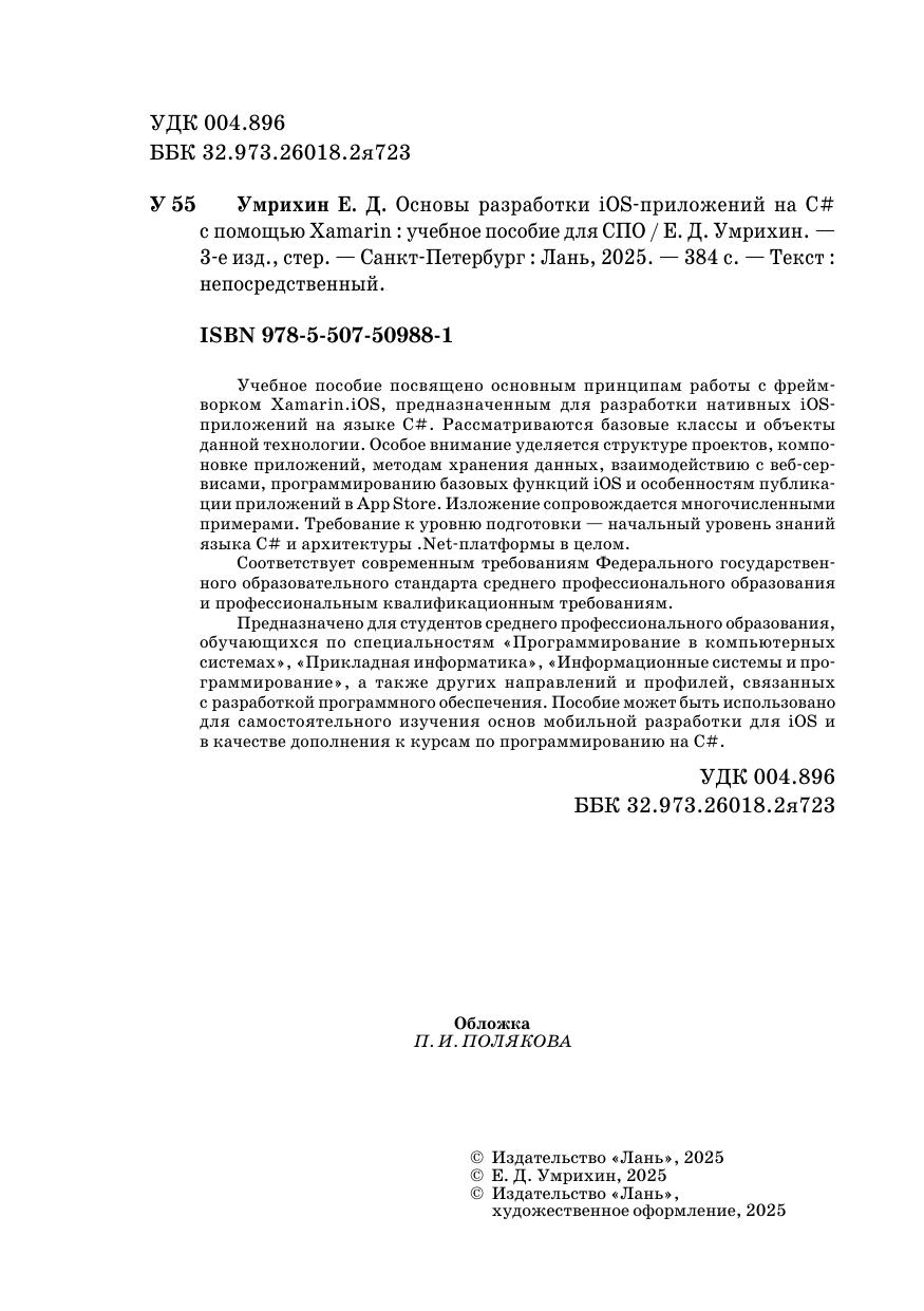 Учебное пособие посвящено основным принципам работы с фреймворком Xamarin.iOS, предназначенным для разработки нативных iOS-приложений на языке С#. Рассматриваются базовые классы и объекты данной технологии. Особое внимание уделяется структуре проектов, компоновке приложений, методам хранения данных, взаимодействию с веб-сервисами, программированию базовых функций iOS и особенностям публикации приложений в App Store. Изложение сопровождается многочисленными примерами. Требование к уровню подготовки — начальный уровень знаний языка C# и архитектуры .Net-платформы в целом. Предназначено для студентов среднего профессионального образования, обучающихся по специальностям «Программирование в компьютерных системах», «Прикладная информатика», «Информационные системы и программирование», а также других направлений и профилей, связанных с разработкой программного обеспечения. Пособие может быть использовано для самостоятельного изучения основ мобильной разработки для iOS и в качестве дополнения к курсам по программированию на C#. Соответствует современным требованиям Федерального государственного образовательного стандарта среднего профессионального образования и профессиональным квалификационным требованиям.