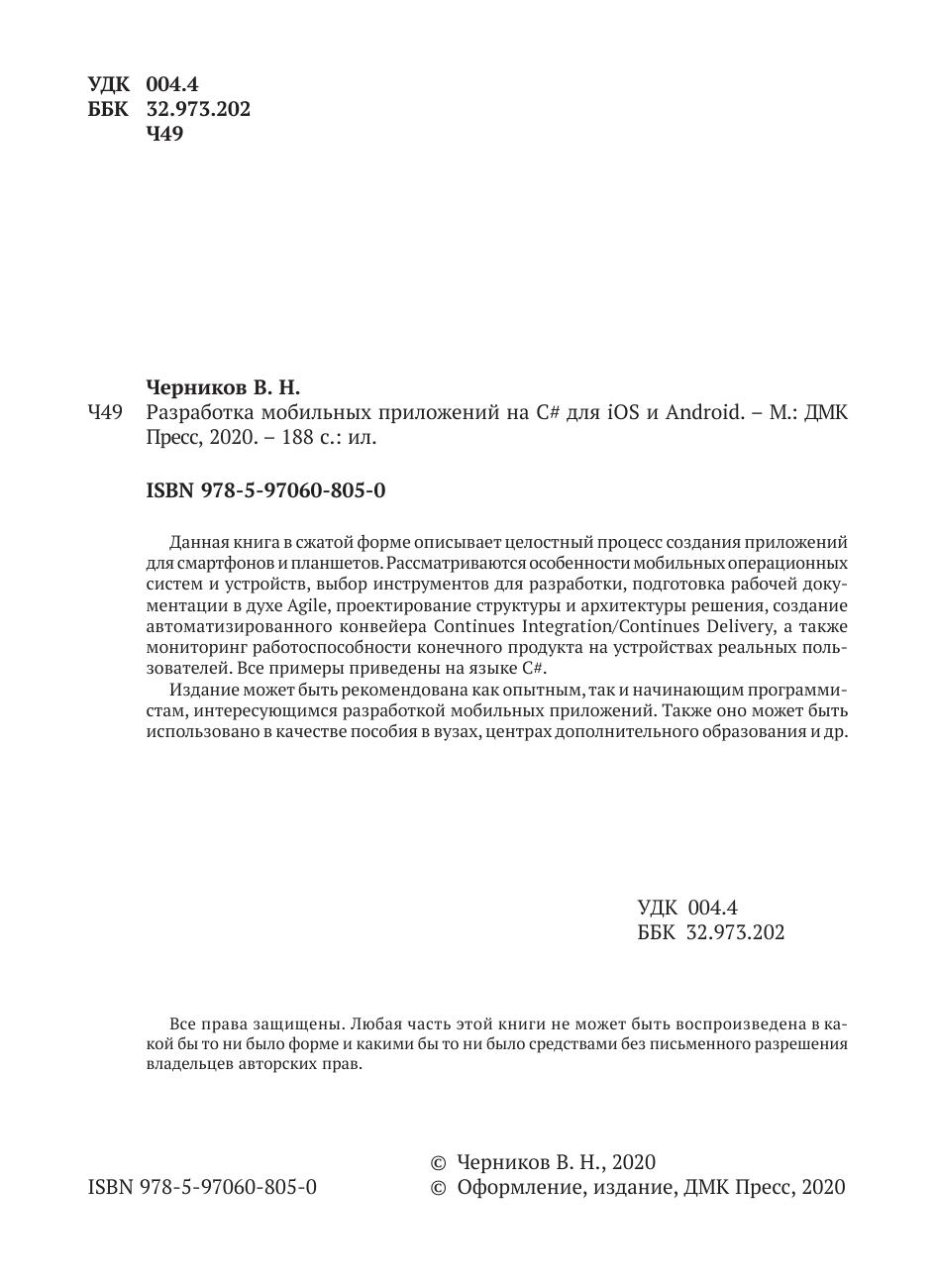 Данная книга в сжатой форме описывает целостный процесс создания приложений для смартфонов и планшетов. Рассматриваются особенности мобильных операционных систем и устройств, выбор инструментов для разработки, подготовка рабочей документации в духе Agile, проектирование структуры и архитектуры решения, создание автоматизированного конвейера Continues Integration/Continues Delivery, а также мониторинг работоспособности конечного продукта на устройствах реальных пользователей. Все примеры приведены на языке C#.