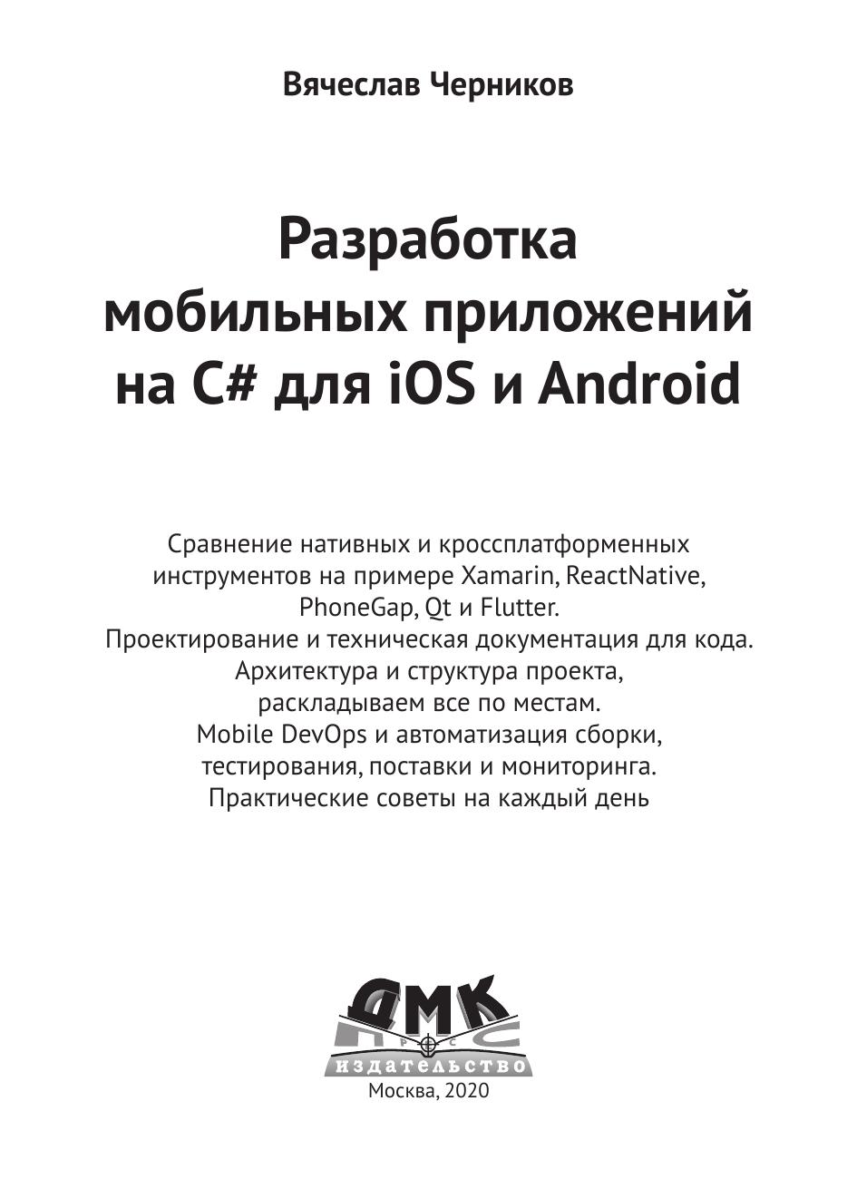 Данная книга в сжатой форме описывает целостный процесс создания приложений для смартфонов и планшетов. Рассматриваются особенности мобильных операционных систем и устройств, выбор инструментов для разработки, подготовка рабочей документации в духе Agile, проектирование структуры и архитектуры решения, создание автоматизированного конвейера Continues Integration/Continues Delivery, а также мониторинг работоспособности конечного продукта на устройствах реальных пользователей. Все примеры приведены на языке C#.