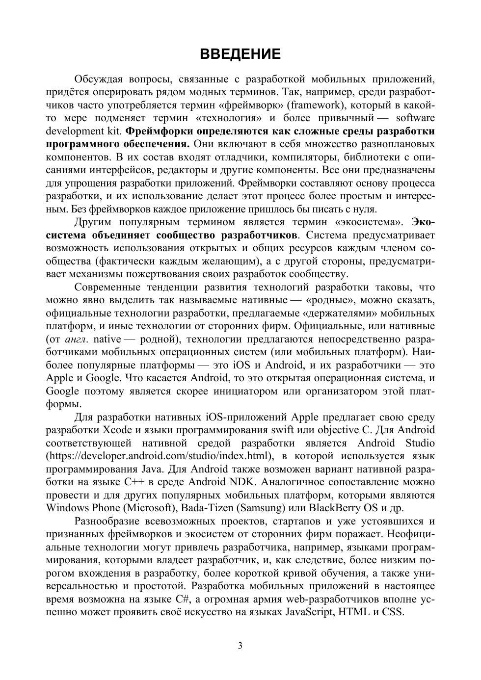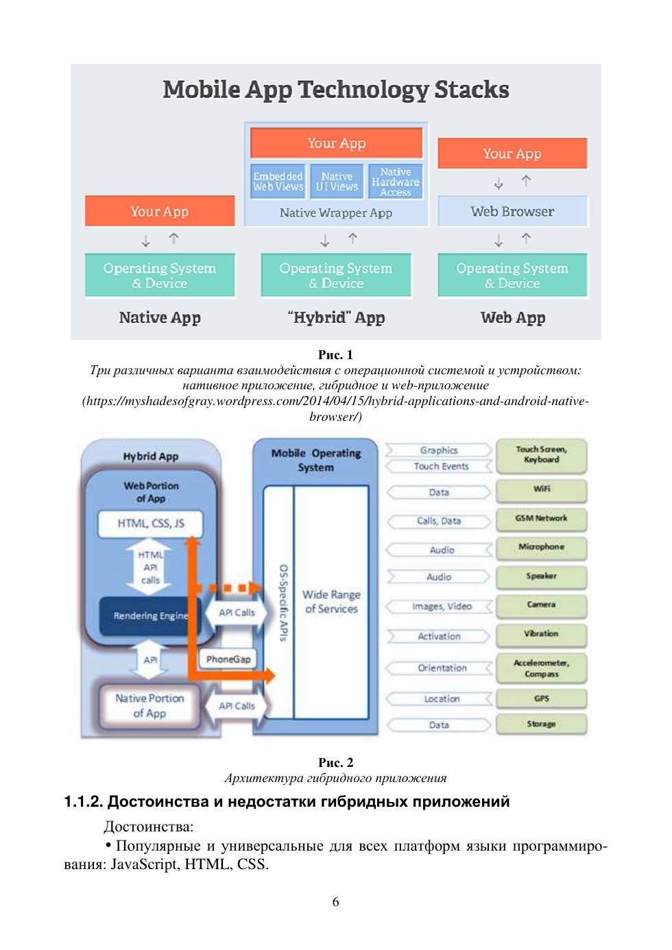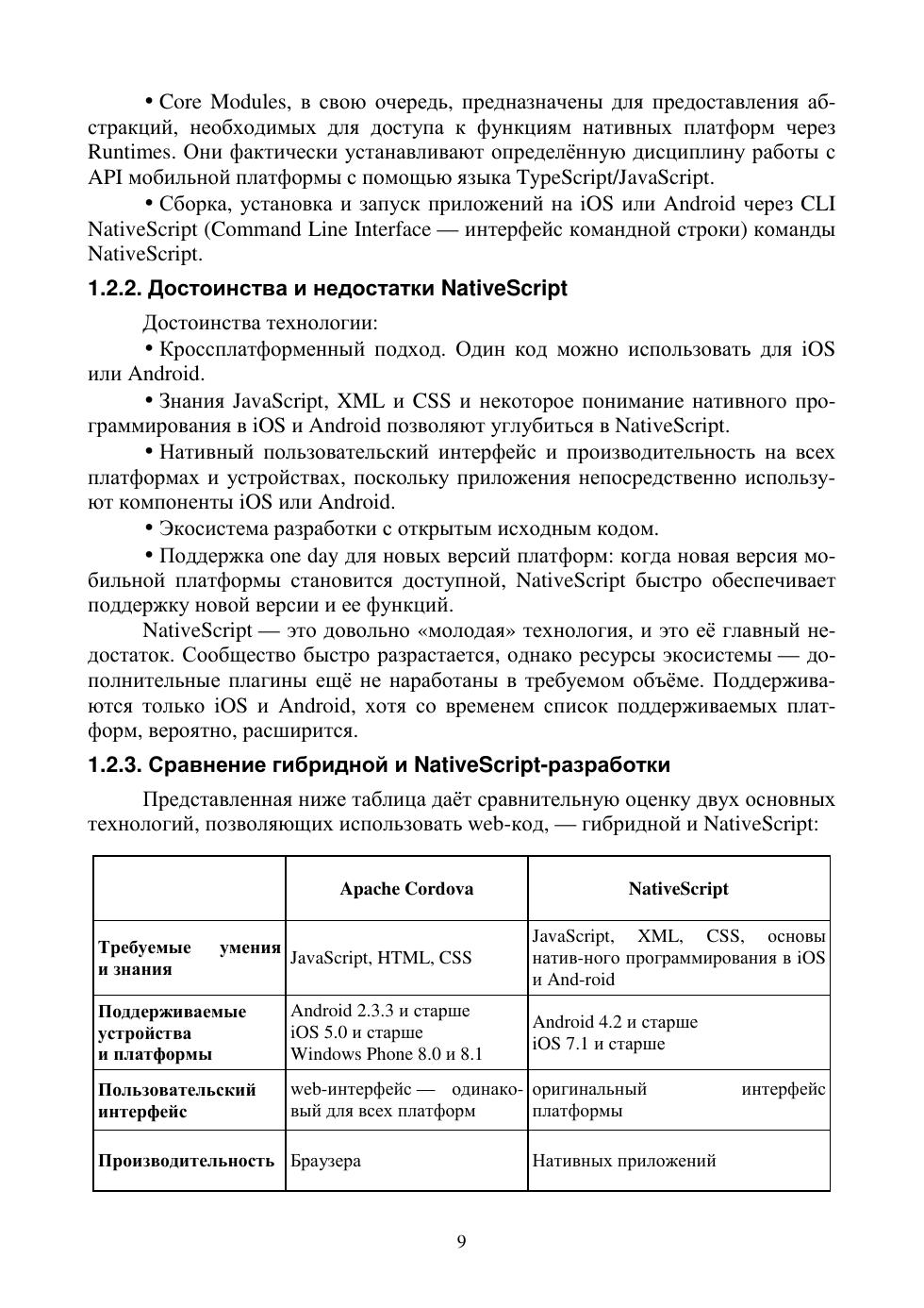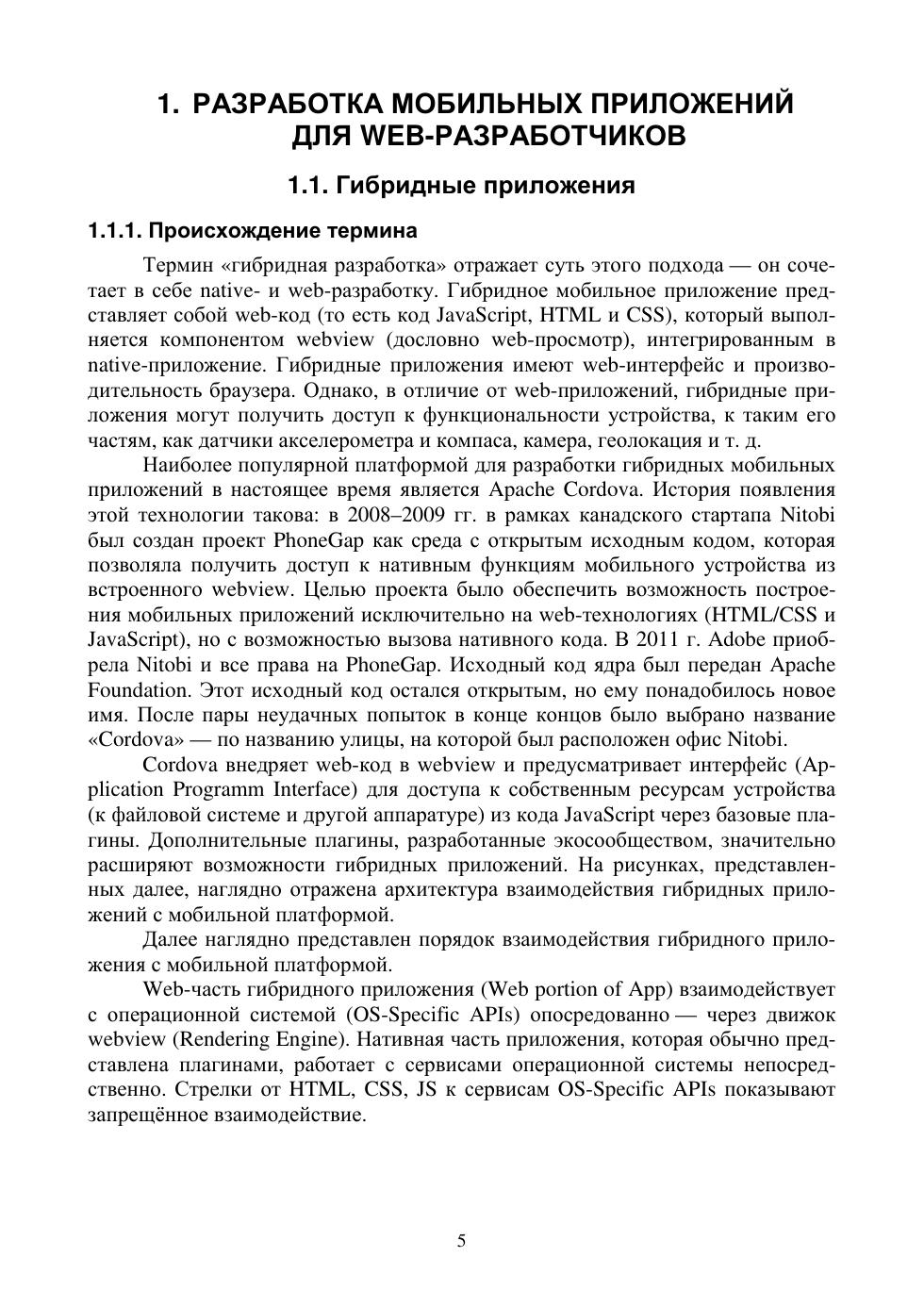 В пособии после изложения сущности гибридных приложений на основе Apache Cordova (ранее PhoneGap) и NativeScript, их особенностей, достоинств и недостатков обсуждается базовая технология Cordova, а в качестве примера строится простое приложение, использующее данные геолокации. Дан краткий обзор ряда наиболее известных библиотек JavaScript и фреймворков на их основе. Объяснено, как устанавливать и использовать инструменты командной строки для управления жизненным циклом приложения Sencha Ext JS Modern и интеграции его с Cordova. Полные листинги кодов представлены в приложении. Особое внимание уделено вопросам разработки гибридных приложений под iOS. Подробно рассматривается так называемое Ad Hoc-распространение приложений через защищённое соединение с web-сервером.