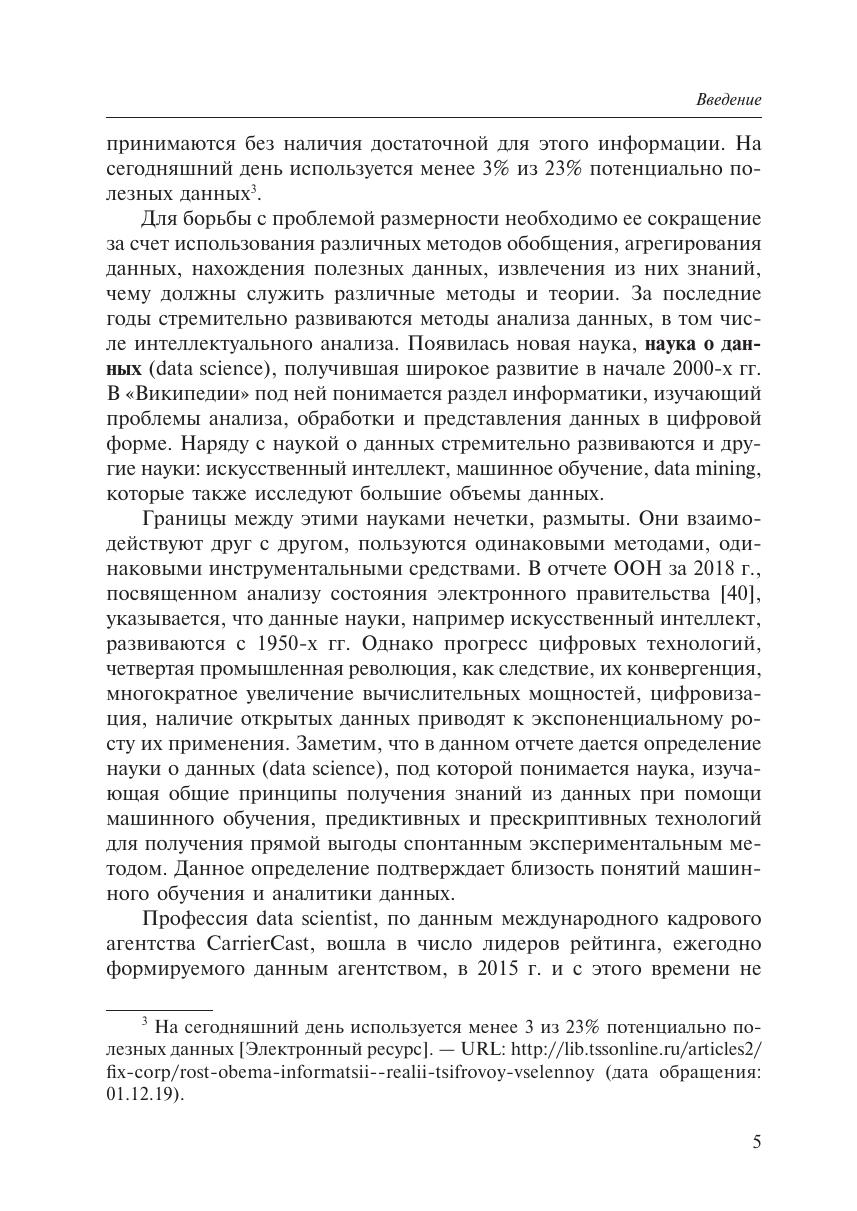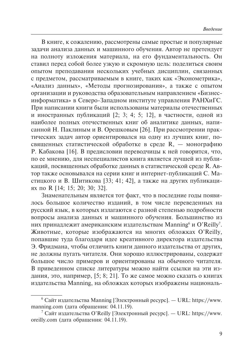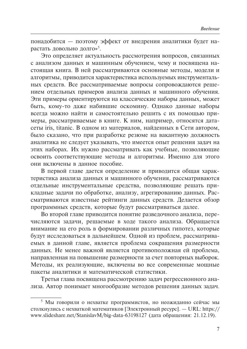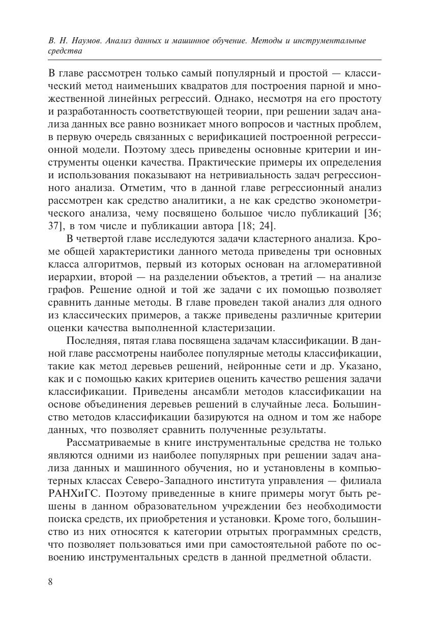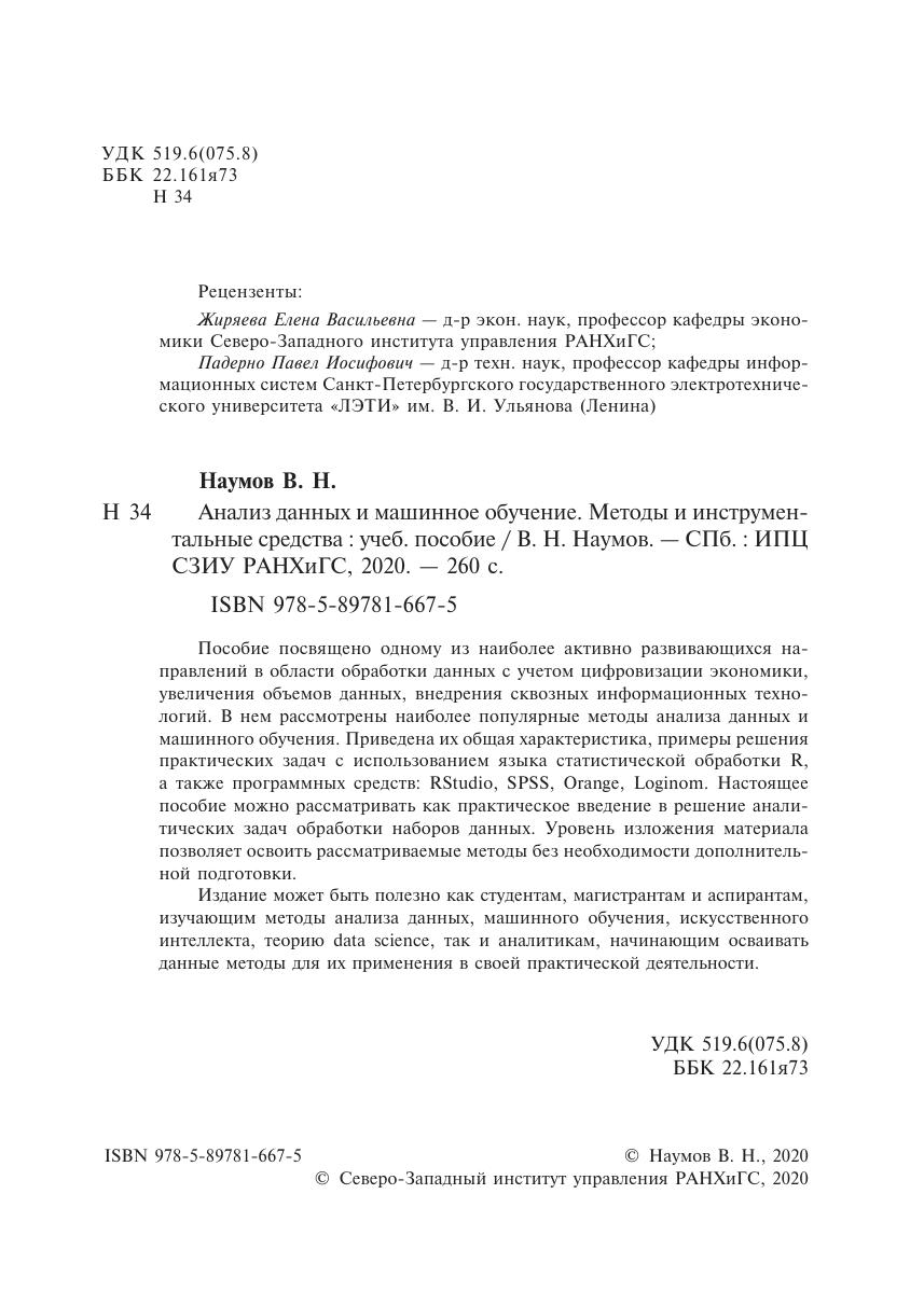 Пособие посвящено одному из наиболее активно развивающихся направлений в области обработки данных с учетом цифровизации экономики, увеличения объемов данных, внедрения сквозных информационных технологий. В нем рассмотрены наиболее популярные методы анализа данных и машинного обучения. Приведена их общая характеристика, примеры решения практических задач с использованием языка статистической обработки R, а также программных средств: RStudio, SPSS, Orange, Loginom. Настоящее пособие можно рассматривать как практическое введение в решение аналитических задач обработки наборов данных. Уровень изложения материала позволяет освоить рассматриваемые методы без необходимости дополнительной подготовки. Издание может быть полезно как студентам, магистрантам и аспирантам, изучающим методы анализа данных, машинного обучения, искусственного интеллекта, теорию data science, так и аналитикам, начинающим осваивать данные методы для их применения в своей практической деятельности.
