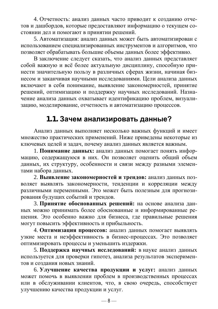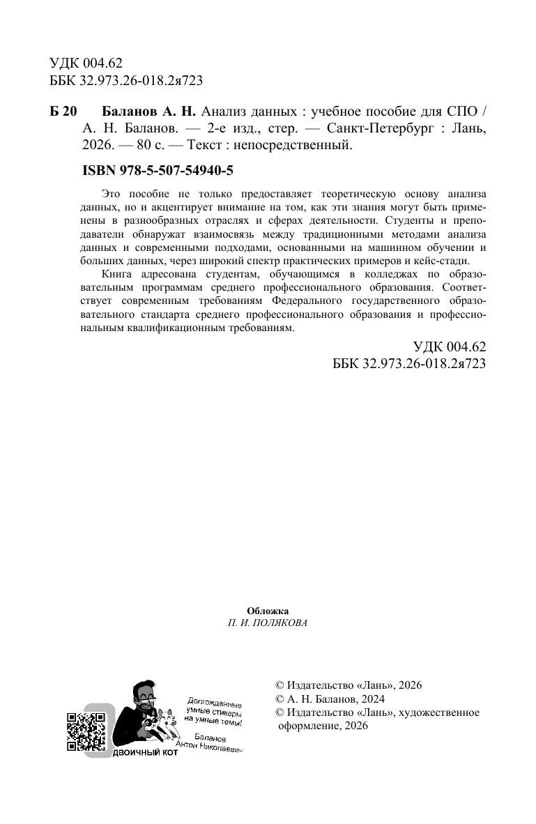 Это пособие не только предоставляет теоретическую основу анализа данных, но и акцентирует внимание на том, как эти знания могут быть применены в разнообразных отраслях и сферах деятельности. Студенты и преподаватели обнаружат взаимосвязь между традиционными методами анализа данных и современными подходами, основанными на машинном обучении и больших данных, через широкий спектр практических примеров и кейс-стади. Книга адресована студентам, обучающимся в колледжах по образовательным программам среднего профессионального образования. Соответствует современным требованиям Федерального государственного образовательного стандарта среднего профессионального образования и профессиональным квалификационным требованиям.