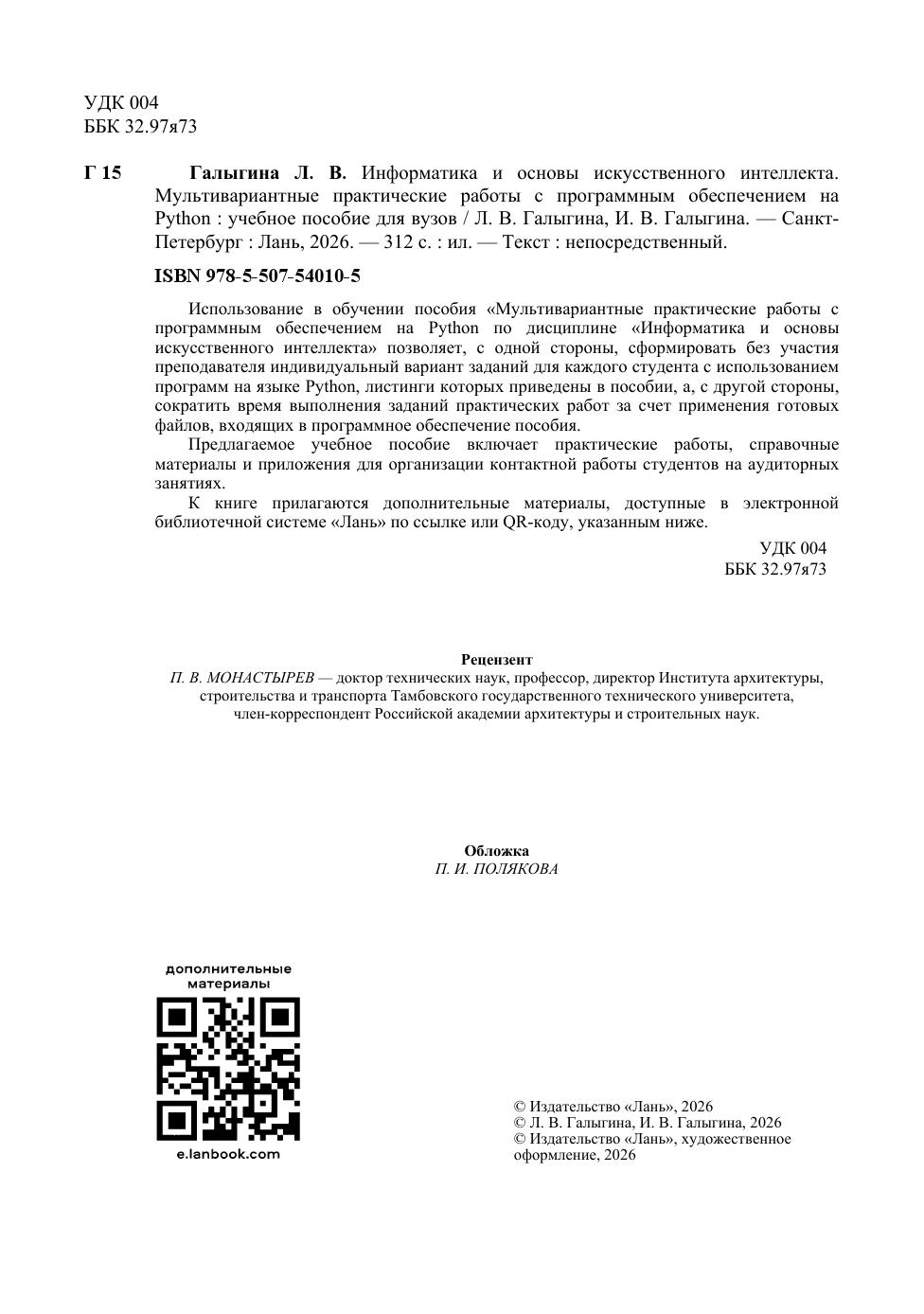 Использование в обучении пособия «Мультивариантные практические работы с программным обеспечением на Python по дисциплине «Информатика и основы искусственного интеллекта» позволяет, с одной стороны, сформировать без участия преподавателя индивидуальный вариант заданий для каждого студента с использованием программ на языке Python, листинги которых приведены в пособии, а, с другой стороны, сократить время выполнения заданий практических работ за счет применения готовых файлов, входящих в программное обеспечение пособия. Предлагаемое учебное пособие включает практические работы, справочные материалы и приложения для организации контактной работы студентов на аудиторных занятиях. К книге прилагаются дополнительные материалы, доступные в электронной библиотечной системе «Лань» по ссылке или QR-коду, указанным ниже.