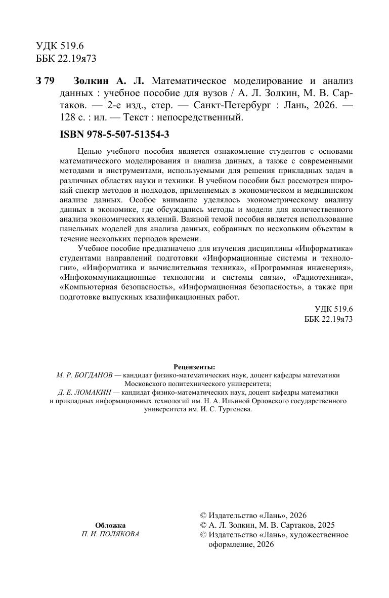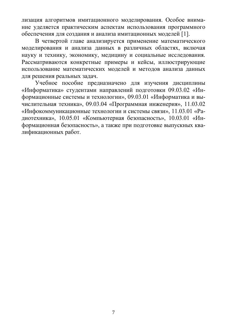 Целью учебного пособия является ознакомление студентов с основами математического моделирования и анализа данных, а также с современными методами и инструментами, используемыми для решения прикладных задач в различных областях науки и техники. В учебном пособии был рассмотрен широкий спектр методов и подходов, применяемых в экономическом и медицинском анализе данных. Особое внимание уделялось эконометрическому анализу данных в экономике, где обсуждались методы и модели для количественного анализа экономических явлений. Важной темой пособия является использование панельных моделей для анализа данных, собранных по нескольким объектам в течение нескольких периодов времени. Учебное пособие предназначено для изучения дисциплины «Информатика» студентами направлений подготовки «Информационные системы и технологии», «Информатика и вычислительная техника», «Программная инженерия», «Инфокоммуникационные технологии и системы связи», «Радиотехника», «Компьютерная безопасность», «Информационная безопасность», а также при подготовке выпускных квалификационных работ.