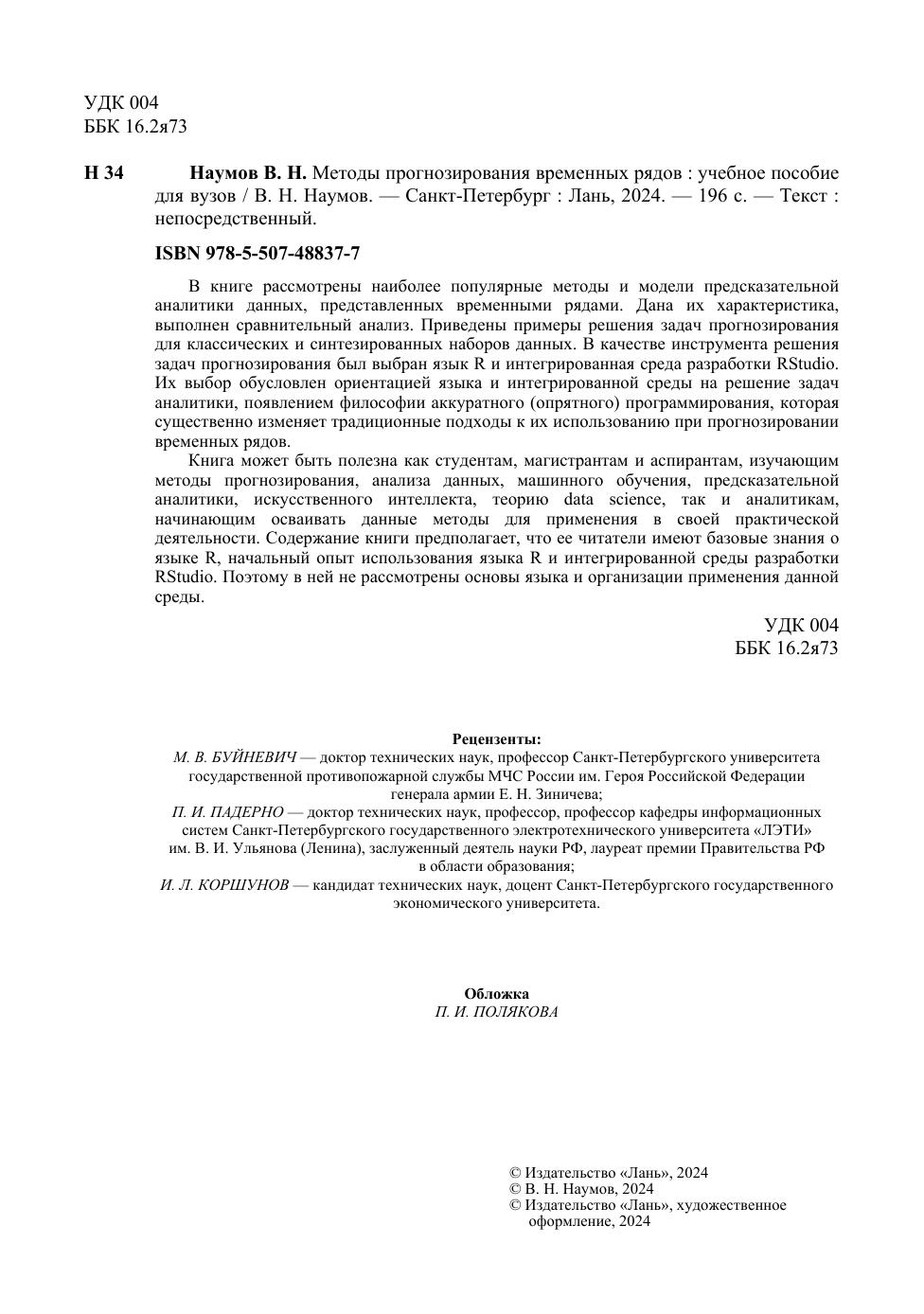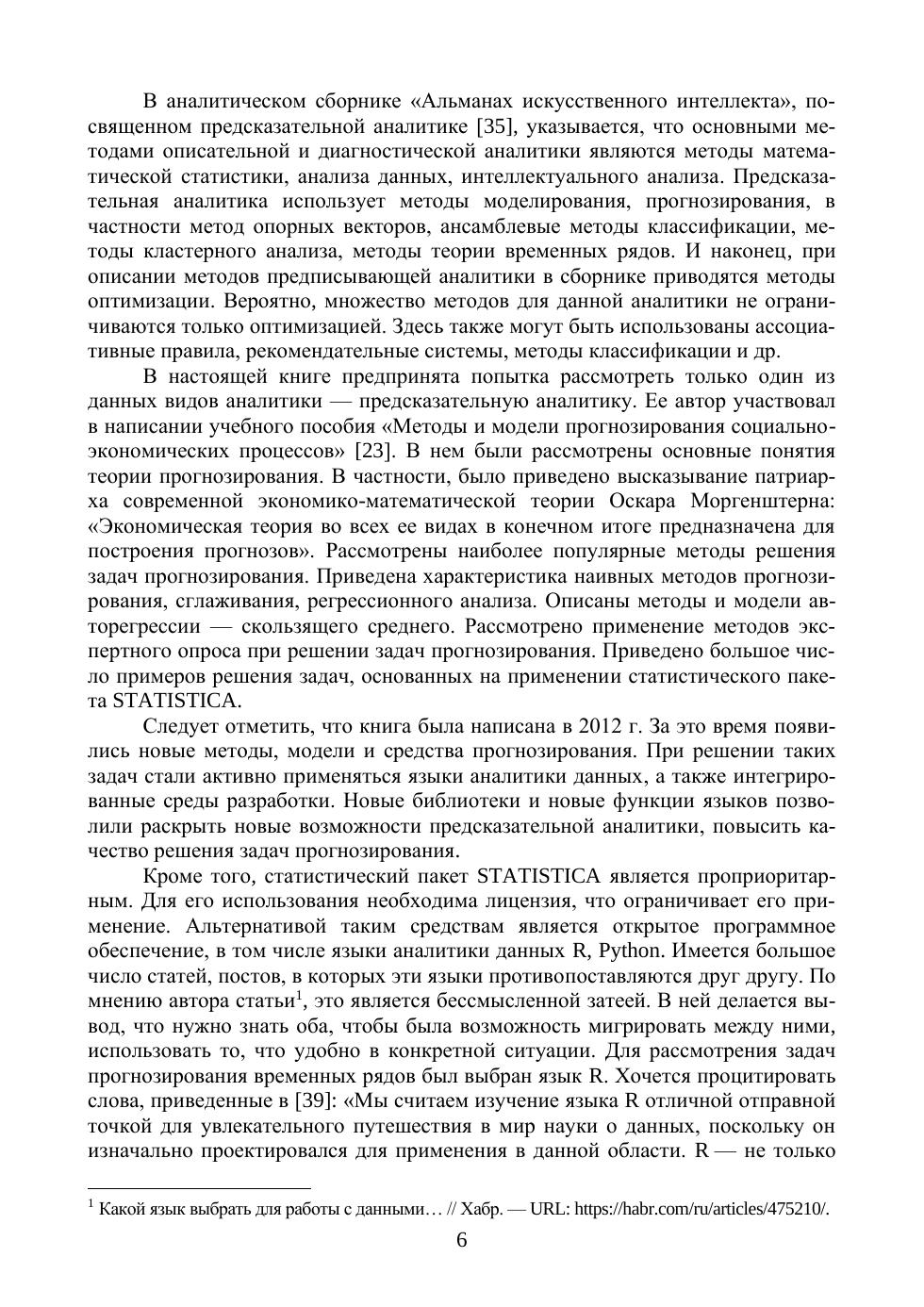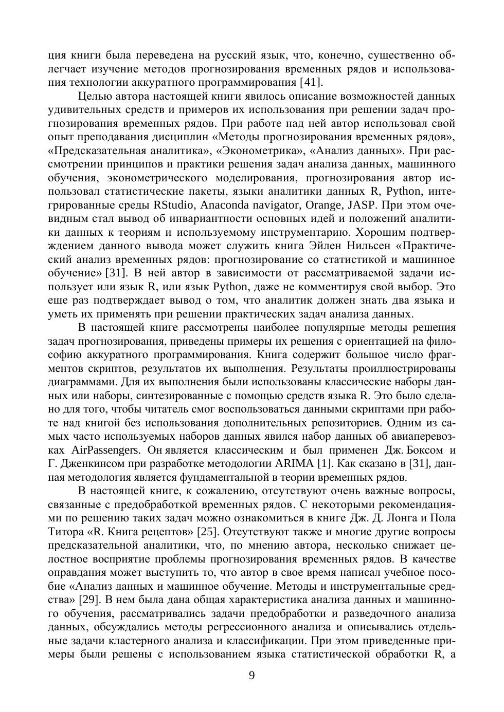 В книге рассмотрены наиболее популярные методы и модели предсказательной аналитики данных, представленных временными рядами. Дана их характеристика, выполнен сравнительный анализ. Приведены примеры решения задач прогнозирования для классических и синтезированных наборов данных. В качестве инструмента решения задач прогнозирования был выбран язык R и интегрированная среда разработки RStudio. Их выбор обусловлен ориентацией языка и интегрированной среды на решение задач аналитики, появлением философии аккуратного (опрятного) программирования, которая существенно изменяет традиционные подходы к их использованию при прогнозировании временных рядов. Книга может быть полезна как студентам, магистрантам и аспирантам, изучающим методы прогнозирования, анализа данных, машинного обучения, предсказательной аналитики, искусственного интеллекта, теорию data science, так и аналитикам, начинающим осваивать данные методы для применения в своей практической деятельности. Содержание книги предполагает, что ее читатели имеют базовые знания о языке R, начальный опыт использования языка R и интегрированной среды разработки RStudio. Поэтому в ней не рассмотрены основы языка и организации применения данной среды.