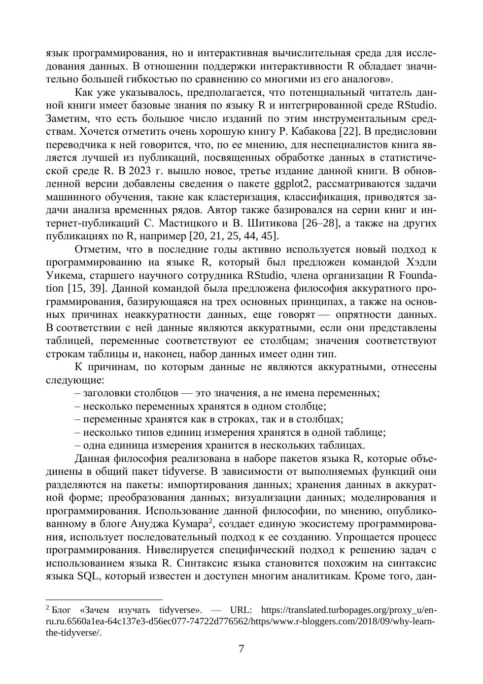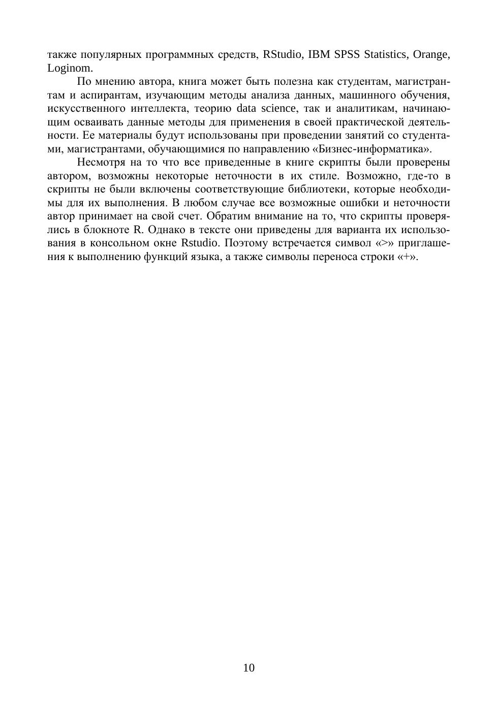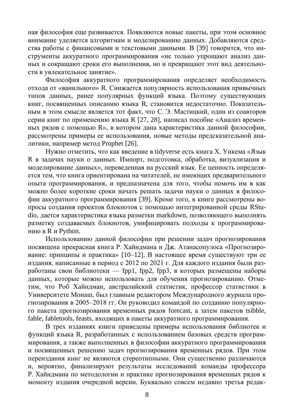 В книге рассмотрены наиболее популярные методы и модели предсказательной аналитики данных, представленных временными рядами. Дана их характеристика, выполнен сравнительный анализ. Приведены примеры решения задач прогнозирования для классических и синтезированных наборов данных. В качестве инструмента решения задач прогнозирования был выбран язык R и интегрированная среда разработки RStudio. Их выбор обусловлен ориентацией языка и интегрированной среды на решение задач аналитики, появлением философии аккуратного (опрятного) программирования, которая существенно изменяет традиционные подходы к их использованию при прогнозировании временных рядов. Книга может быть полезна как студентам, магистрантам и аспирантам, изучающим методы прогнозирования, анализа данных, машинного обучения, предсказательной аналитики, искусственного интеллекта, теорию data science, так и аналитикам, начинающим осваивать данные методы для применения в своей практической деятельности. Содержание книги предполагает, что ее читатели имеют базовые знания о языке R, начальный опыт использования языка R и интегрированной среды разработки RStudio. Поэтому в ней не рассмотрены основы языка и организации применения данной среды.
