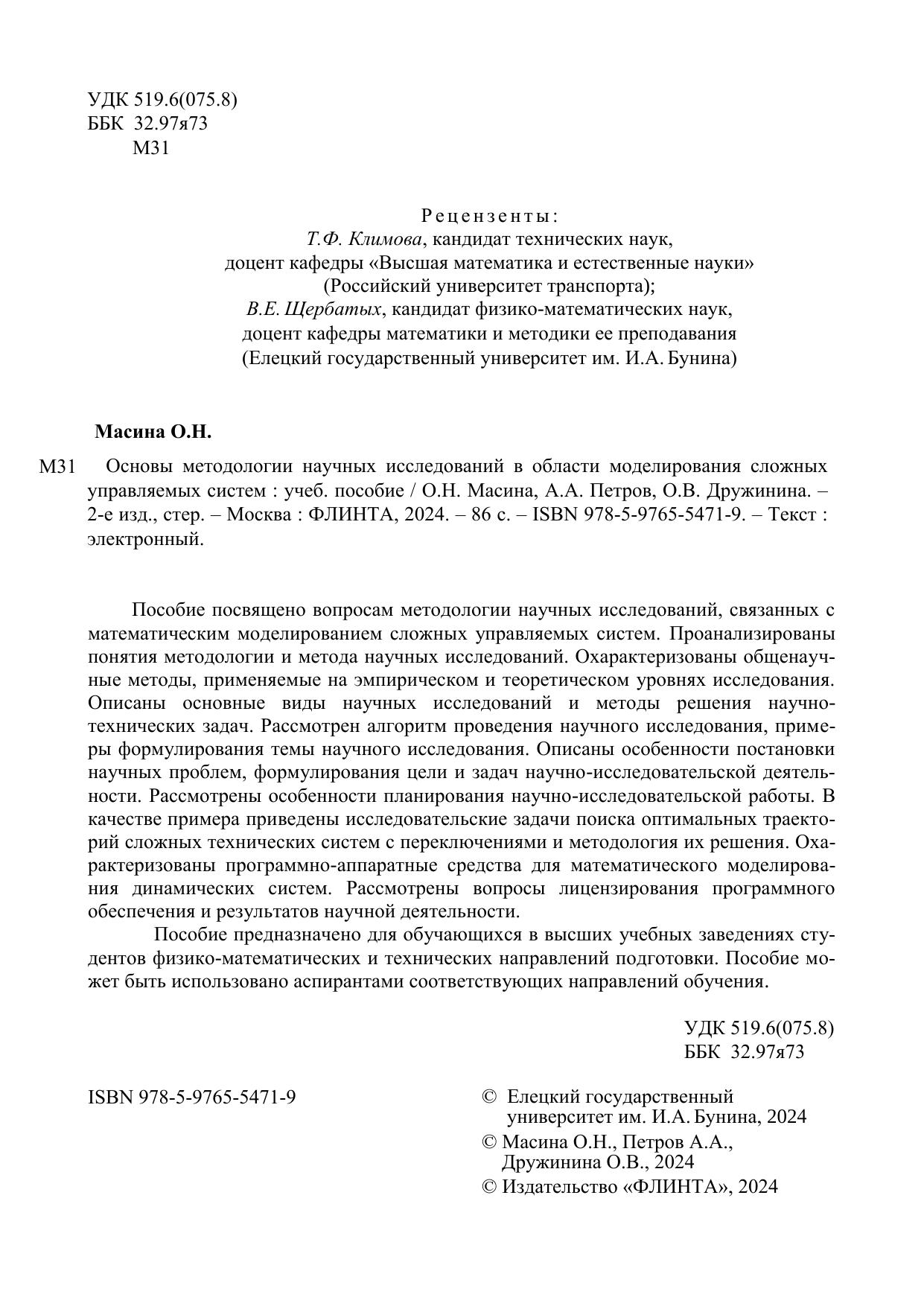 Пособие посвящено вопросам методологии научных исследований, связанных с математическим моделированием сложных управляемых систем. Проанализированы понятия методологии и метода научных исследований. Охарактеризованы общенаучные методы, применяемые на эмпирическом и теоретическом уровнях исследования. Описаны основные виды научных исследований и методы решения научно-технических задач. Рассмотрен алгоритм проведения научного исследования, примеры формулирования темы научного исследования. Описаны особенности постановки научных проблем, формулирования цели и задач научно-исследовательской деятельности. Рассмотрены особенности планирования научно-исследовательской работы. В качестве примера приведены исследовательские задачи поиска оптимальных траекторий сложных технических систем с переключениями и методология их решения. Оха-рактеризованы программно-аппаратные средства для математического моделирования динамических систем. Рассмотрены вопросы лицензирования программного обеспечения и результатов научной деятельности.