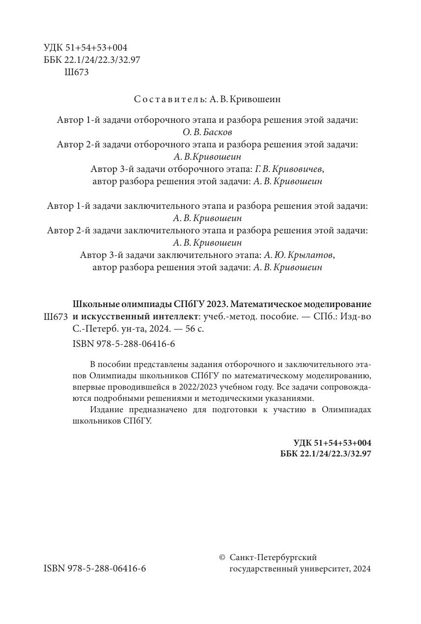В пособии представлены задания отборочного и заключительного этапов Олимпиады школьников СПбГУ по математическому моделированию, впервые проводившейся в 2022/2023 учебном году. Все задачи сопровождаются подробными решениями и методическими указаниями. Издание предназначено для подготовки к участию в Олимпиадах школьников СПбГУ.