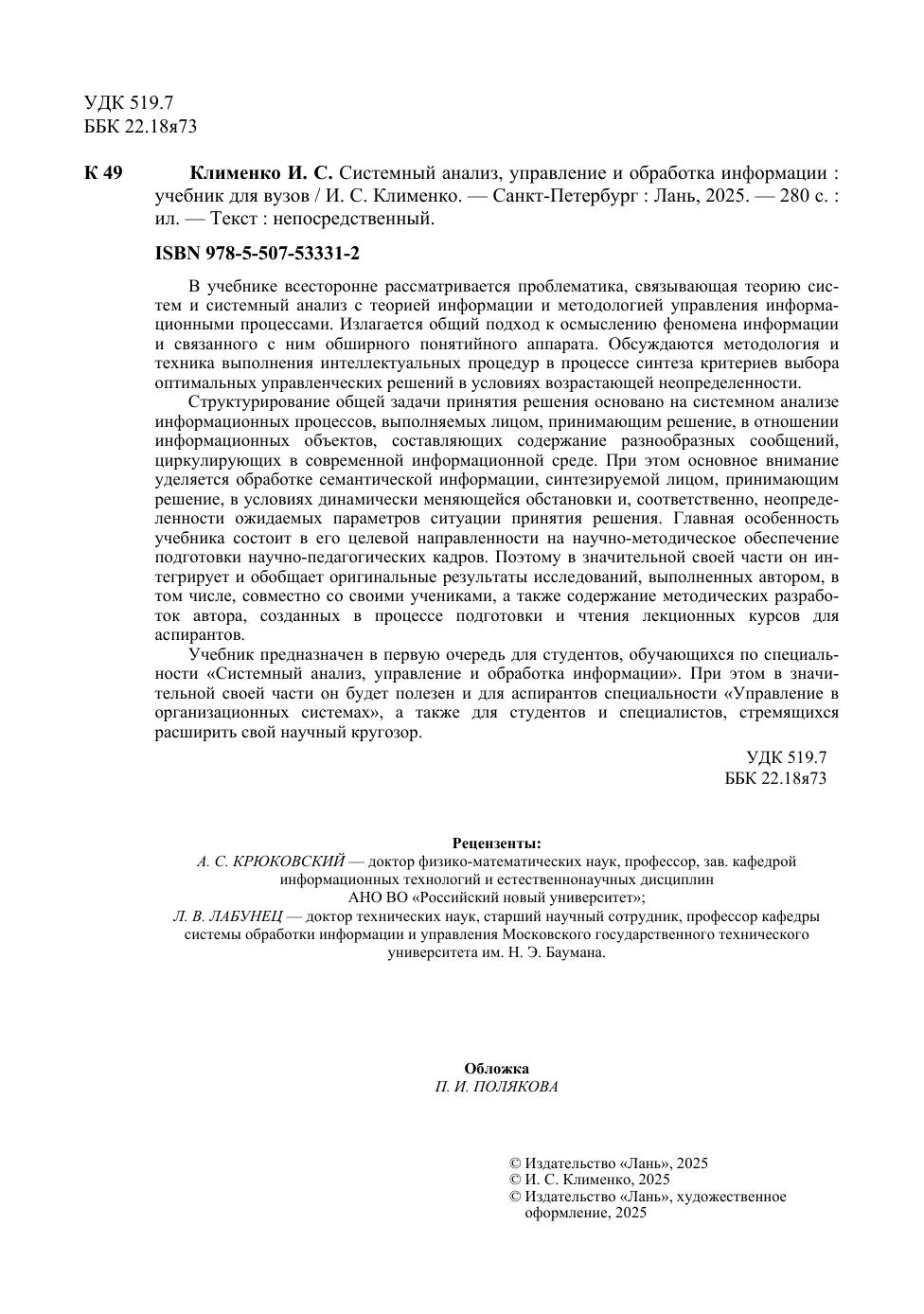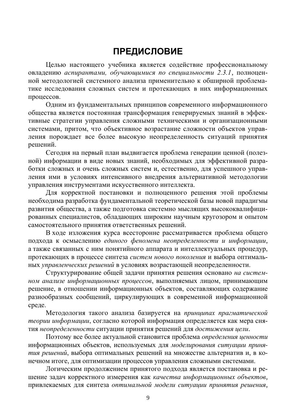 В учебнике всесторонне рассматривается проблематика, связывающая теорию систем и системный анализ с теорией информации и методологией управления информационными процессами. Излагается общий подход к осмыслению феномена информации и связанного с ним обширного понятийного аппарата. Обсуждаются методология и техника выполнения интеллектуальных процедур в процессе синтеза критериев выбора оптимальных управленческих решений в условиях возрастающей неопределенности. Структурирование общей задачи принятия решения основано на системном анализе информационных процессов, выполняемых лицом, принимающим решение, в отношении информационных объектов, составляющих содержание разнообразных сообщений, циркулирующих в современной информационной среде. При этом основное внимание уделяется обработке семантической информации, синтезируемой лицом, принимающим решение, в условиях динамически меняющейся обстановки и, соответственно, неопределенности ожидаемых параметров ситуации принятия решения. Главная особенность учебника состоит в его целевой направленности на научно-методическое обеспечение подготовки научно-педагогических кадров. Поэтому в значительной своей части он интегрирует и обобщает оригинальные результаты исследований, выполненных автором, в том числе, совместно со своими учениками, а также содержание методических разработок автора, созданных в процессе подготовки и чтения лекционных курсов для аспирантов. Учебник предназначен в первую очередь для студентов, обучающихся по специальности «Системный анализ, управление и обработка информации». При этом в значительной своей части он будет полезен и для аспирантов специальности «Управление в организационных системах», а также для студентов и специалистов, стремящихся расширить свой научный кругозор.