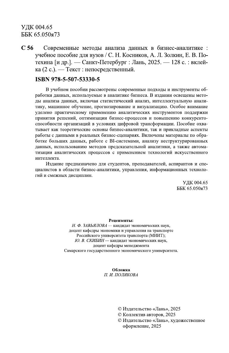 В учебном пособии рассмотрены современные подходы и инструменты обработки данных, используемые в аналитике бизнеса. В издании освещены методы анализа данных, включая статистический анализ, интеллектуальную аналитику, машинное обучение, прогнозирование и визуализацию. Особое внимание уделено практическому применению аналитических инструментов поддержки принятия решений, оптимизации бизнес-процессов и повышению конкурентоспособности организаций в условиях цифровой трансформации. Пособие охватывает как теоретические основы бизнес-аналитики, так и прикладные аспекты работы с данными в реальных бизнес-сценариях. Включены материалы по обработке больших данных, работе с BI-системами, анализу неструктурированных данных, использованию методов предсказательной аналитики, а также автоматизации аналитических процессов с применением технологий искусствен-ного интеллекта. Издание предназначено для студентов, преподавателей, аспирантов и специалистов в области бизнес-аналитики, управления, информационных технологий и смежных дисциплин.