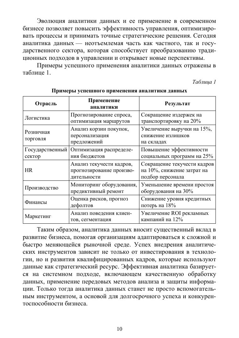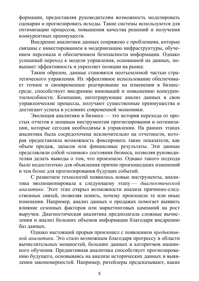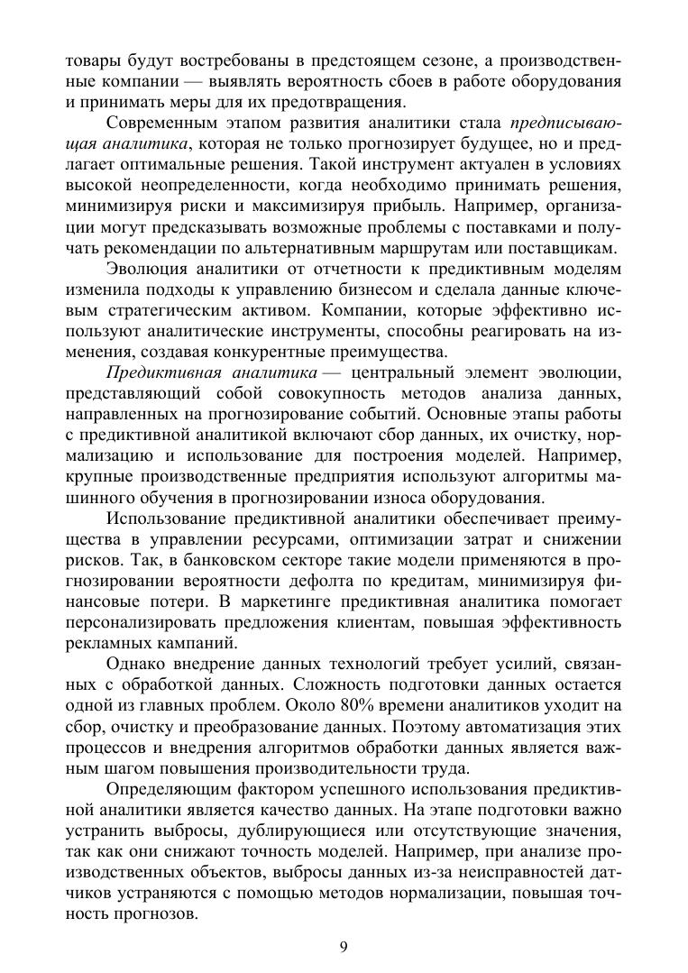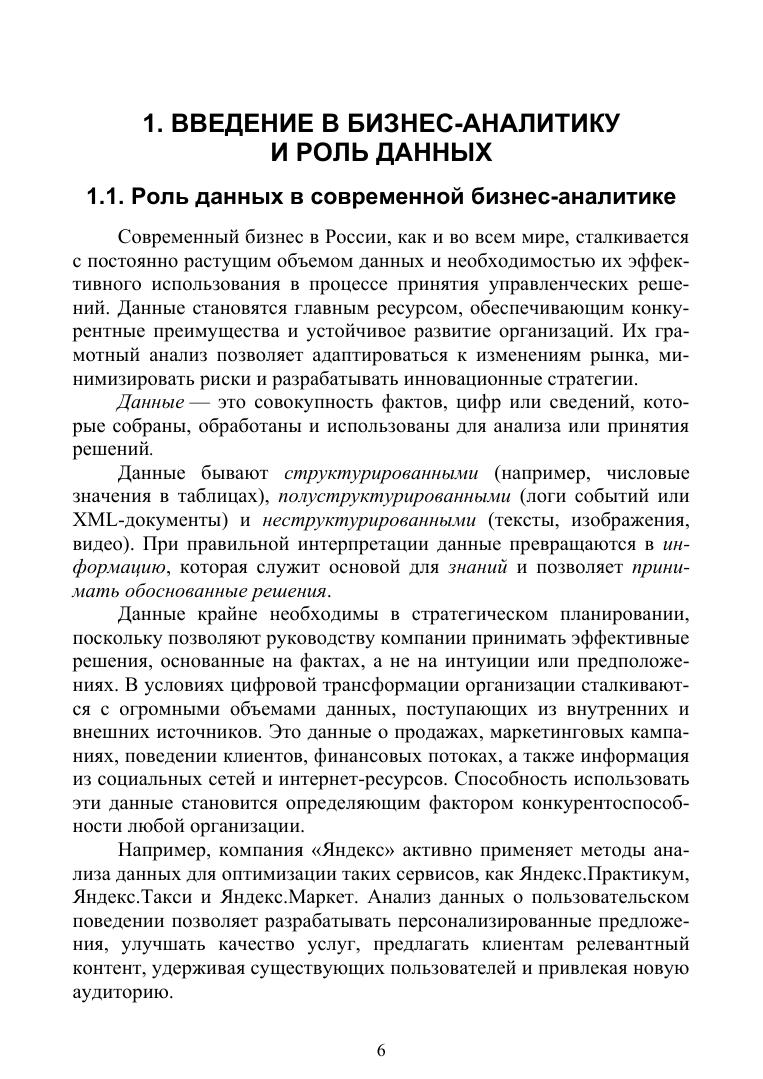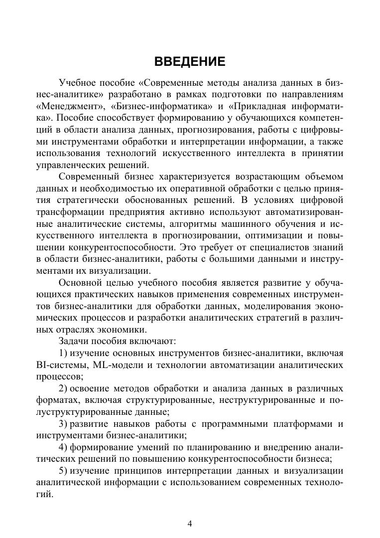 В учебном пособии рассмотрены современные подходы и инструменты обработки данных, используемые в аналитике бизнеса. В издании освещены методы анализа данных, включая статистический анализ, интеллектуальную аналитику, машинное обучение, прогнозирование и визуализацию. Особое внимание уделено практическому применению аналитических инструментов поддержки принятия решений, оптимизации бизнес-процессов и повышению конкурентоспособности организаций в условиях цифровой трансформации. Пособие охватывает как теоретические основы бизнес-аналитики, так и прикладные аспекты работы с данными в реальных бизнес-сценариях. Включены материалы по обработке больших данных, работе с BI-системами, анализу неструктурированных данных, использованию методов предсказательной аналитики, а также автоматизации аналитических процессов с применением технологий искусствен-ного интеллекта. Издание предназначено для студентов, преподавателей, аспирантов и специалистов в области бизнес-аналитики, управления, информационных технологий и смежных дисциплин.