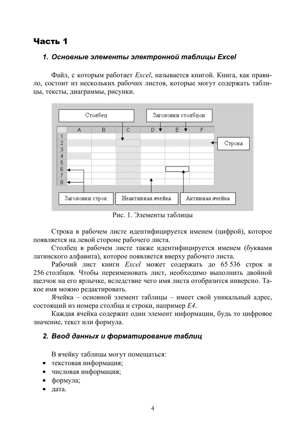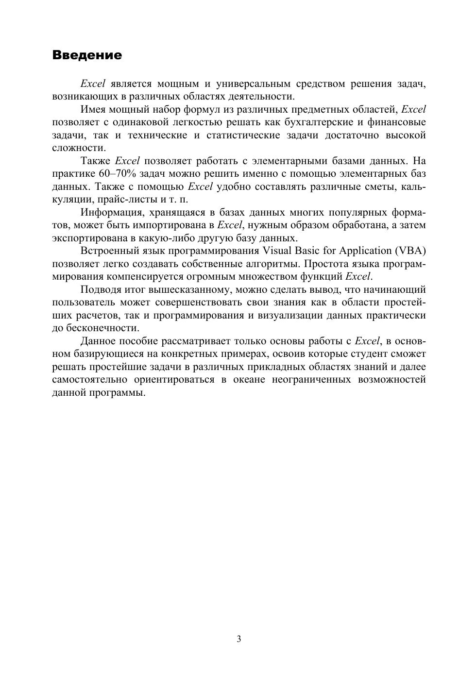 Пособие содержит четыре взаимосвязанных раздела: простейшие вычисления в таблицах, использование стандартных формул, построение графиков; работа с массивами данных, построение сводных таблиц данных, поиск решений, анализ «Что — если», решение оптимизационных задач; использование макрокоманд и основы программирования в VBA; разработка приложений с использованием визуальных компонентов, создание собственных интерфейсов.