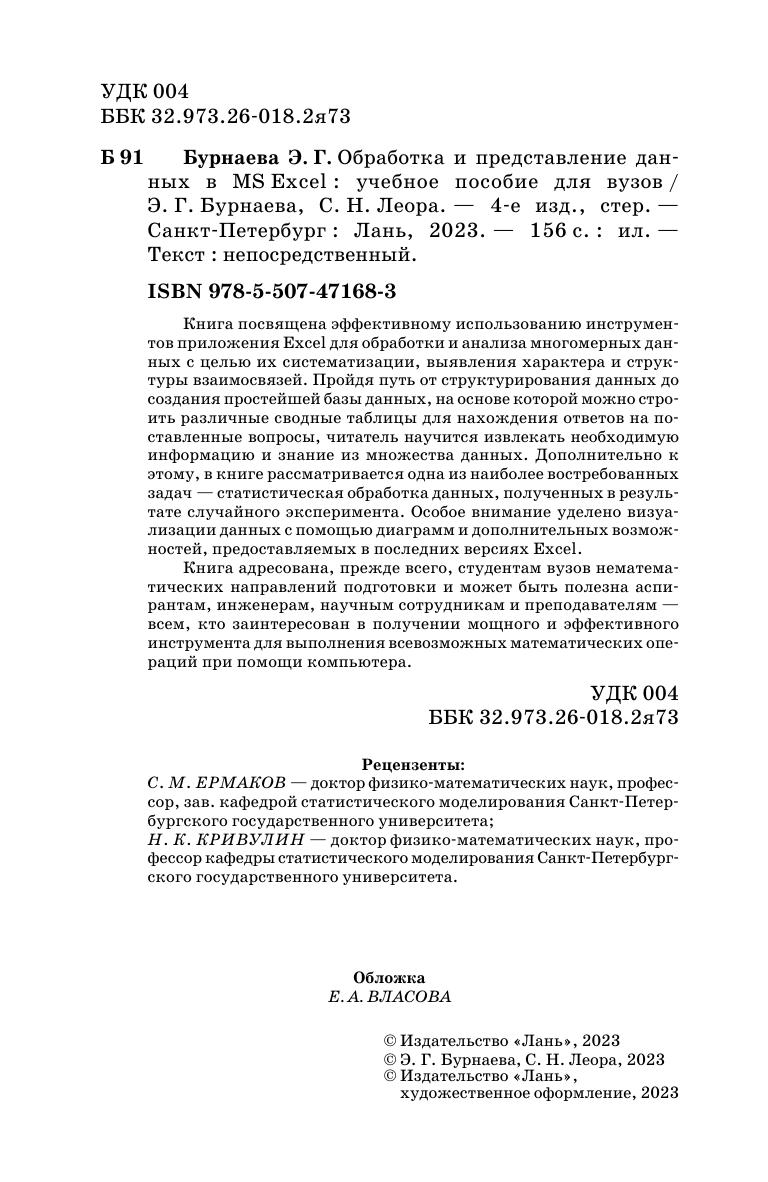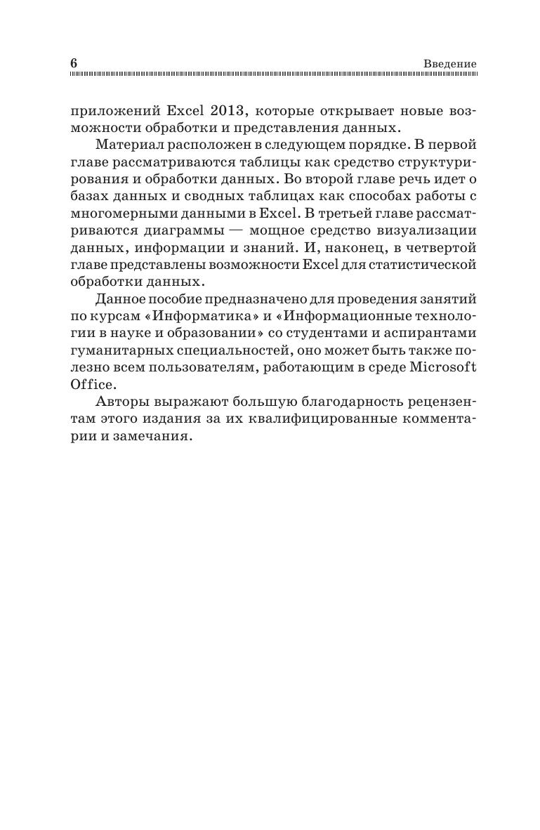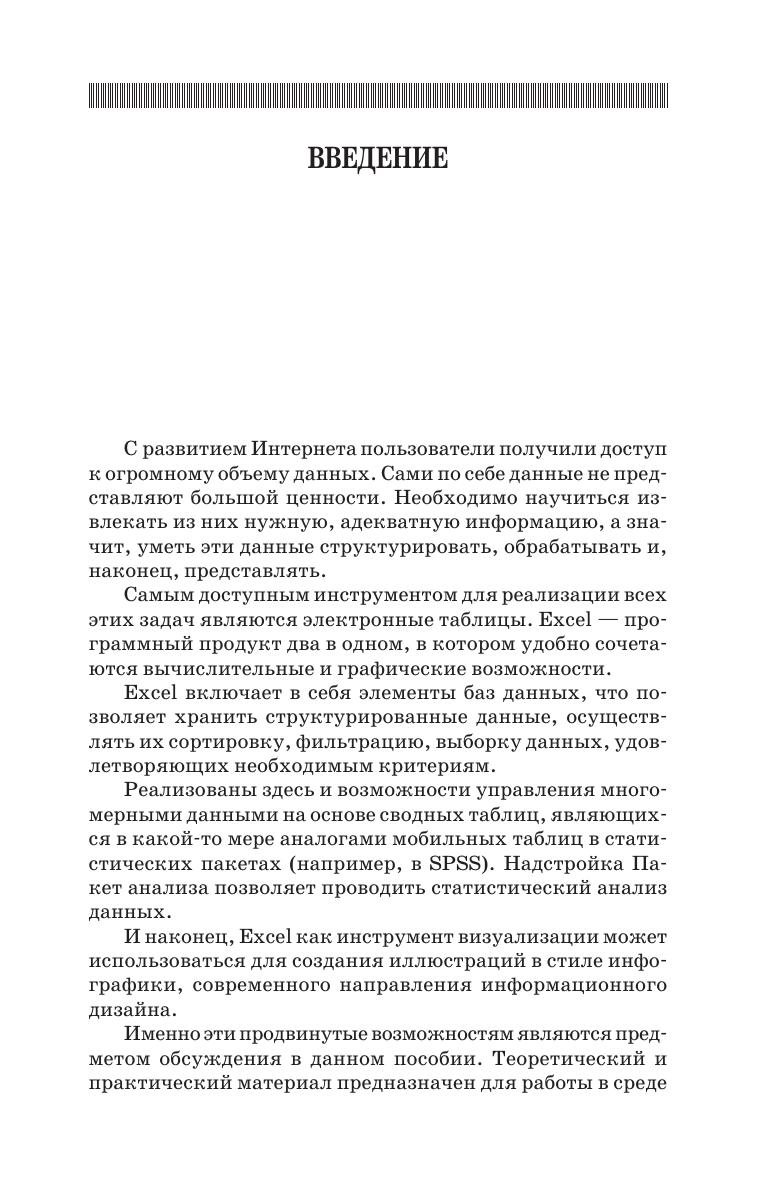 Книга посвящена эффективному использованию инструментов приложения Excel для обработки и анализа многомерных данных с целью их систематизации, выявления характера и структуры взаимосвязей. Пройдя путь от структурирования данных до создания простейшей базы данных, на основе которой можно строить различные сводные таблицы для нахождения ответов на поставленные вопросы, читатель научится извлекать необходимую информацию и знание из множества данных. Дополнительно к этому, в книге рассматривается одна из наиболее востребованных задач— статистическая обработка данных, полученных в результате случайного эксперимента. Особое внимание уделено визуализации данных с помощью диаграмм и дополнительных возможностей, предоставляемых в последних версиях Excel.Книга адресована, прежде всего, студентам нематематических направлений подготовки. Она может быть полезна также аспирантам, инженерам, научным сотрудникам и преподавателям — всем, кто заинтересован в получении мощного и эффективного инструмента для выполнения всевозможных математических операций при помощи компьютера.