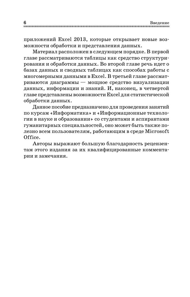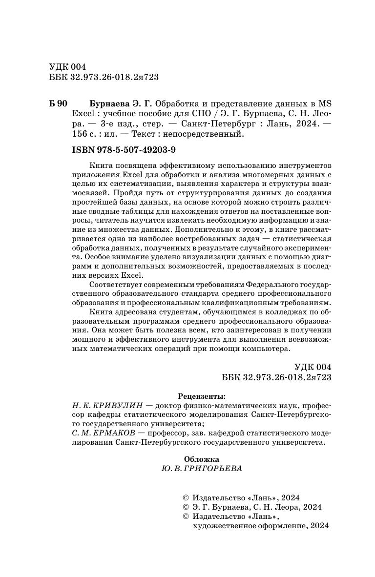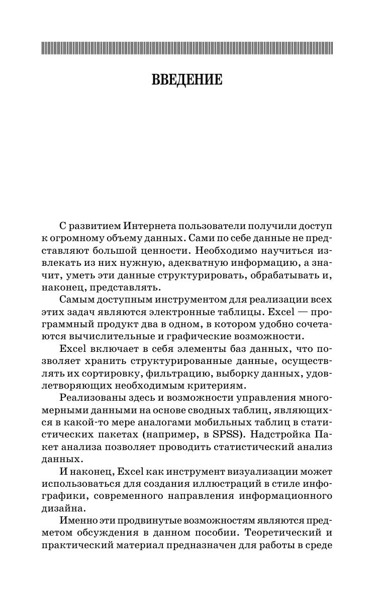 Книга посвящена эффективному использованию инструментов приложения Excel для обработки и анализа многомерных данных, с целью их систематизации, выявления характера и структуры взаимосвязей. Пройдя путь от структурирования данных до создания простейшей базы данных, на основе которой можно строить различные сводные таблицы для нахождения ответов на поставленные вопросы, читатель научится извлекать необходимую информацию и знание из множества данных. Дополнительно к этому, в книге рассматривается одна из наиболее востребованных задач – статистическая обработка данных, полученных в результате случайного эксперимента. Особое внимание уделено визуализации данных с помощью диаграмм и дополнительных возможностей, предоставляемых в последних версиях Excel. Книга адресована студентам обучающимся в колледжах по образовательным программам среднего профессионального образования. Она может быть полезна всем, кто заинтересован в получении мощного и эффективного инструмента для выполнения всевозможных математических операций при помощи компьютера. Соответствует современным требованиям Федерального государственного образовательного стандарта среднего профессионального образования и профессиональным квалификационным требованиям.