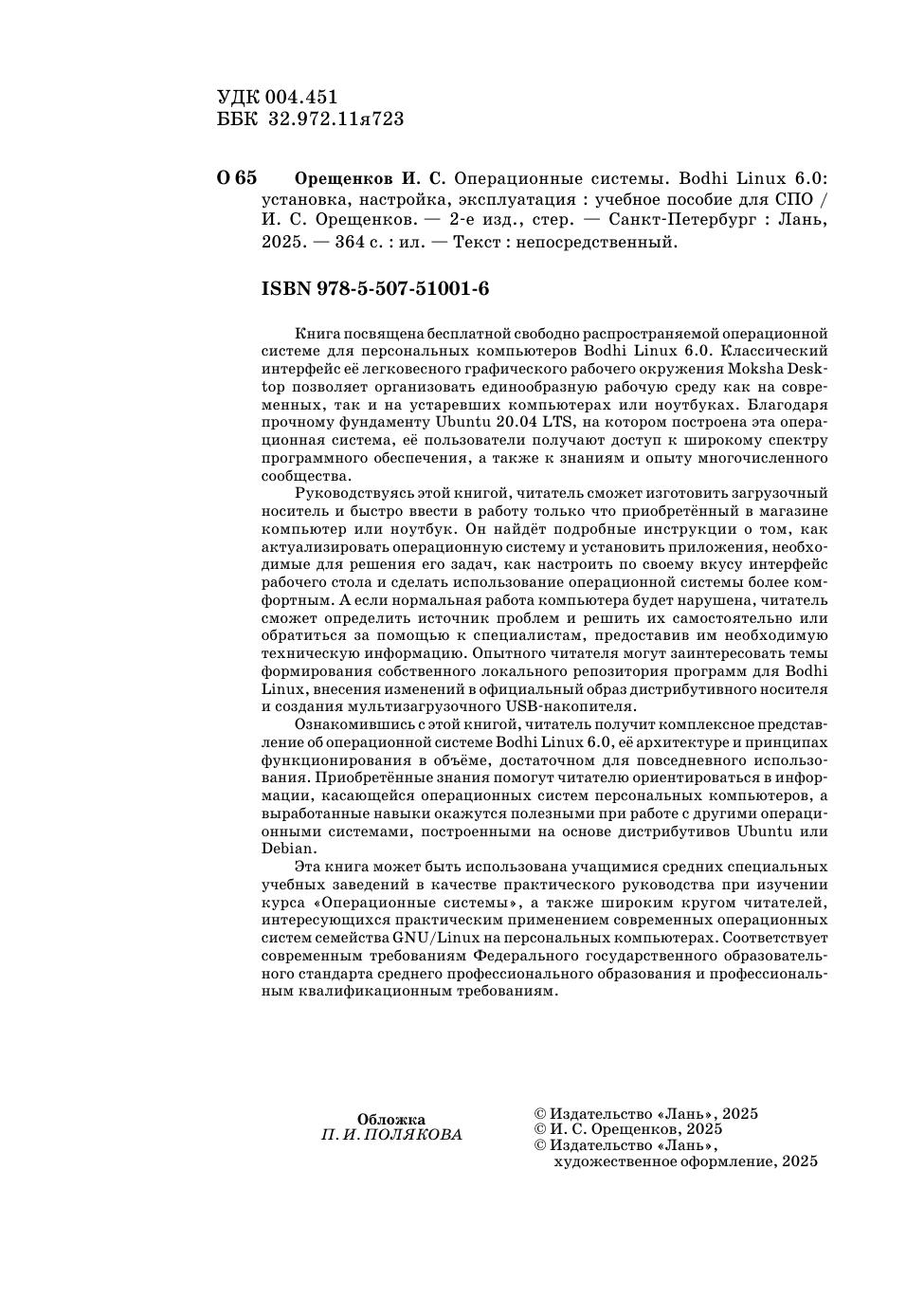 Книга посвящена бесплатной свободно распространяемой операционной системе для персональных компьютеров Bodhi Linux 6.0. Классический интерфейс её легковесного графического рабочего окружения Moksha Desktop позволяет организовать единообразную рабочую среду как на современных, так и на устаревших компьютерах или ноутбуках. Благодаря прочному фундаменту Ubuntu 20.04 LTS, на котором построена эта операционная система, её пользователи получают доступ к широкому спектру программного обеспечения, а также к знаниям и опыту многочисленного сообщества. Руководствуясь этой книгой, читатель сможет изготовить загрузочный носитель и быстро ввести в работу только что приобретённый в магазине компьютер или ноутбук. Он найдёт подробные инструкции о том, как актуализировать операционную систему и установить приложения, необходимые для решения его задач, как настроить по своему вкусу интерфейс рабочего стола и сделать использование операционной системы более комфортным. А если нормальная работа компьютера будет нарушена, читатель сможет определить источник проблем и решить их самостоятельно или обратиться за помощью к специалистам, предоставив им необходимую техническую информацию. Опытного читателя могут заинтересовать темы формирования собственного локального репозитория программ для Bodhi Linux, внесения изменений в официальный образ дистрибутивного носителя и создания мультизагрузочного USB-накопителя. Ознакомившись с этой книгой, читатель получит комплексное представление об операционной системе Bodhi Linux 6.0, её архитектуре и принципах функционирования в объёме, достаточном для повседневного использования. Приобретённые знания помогут читателю ориентироваться в информации, касающейся операционных систем персональных компьютеров, а выработанные навыки окажутся полезными при работе с другими операционными системами, построенными на основе дистрибутивов Ubuntu или Debian. Эта книга может быть использована учащимися средних специальных учебных заведений в качестве практического руководства при изучении курса «Операционные системы», а также широким кругом читателей, интересующихся практическим применением современных операционных систем семейства GNU/Linux на персональных компьютерах. Соответствует современным требованиям Федерального государственного образовательного стандарта среднего профессионального образования и профессиональным квалификационным требованиям.