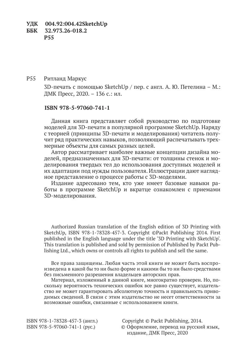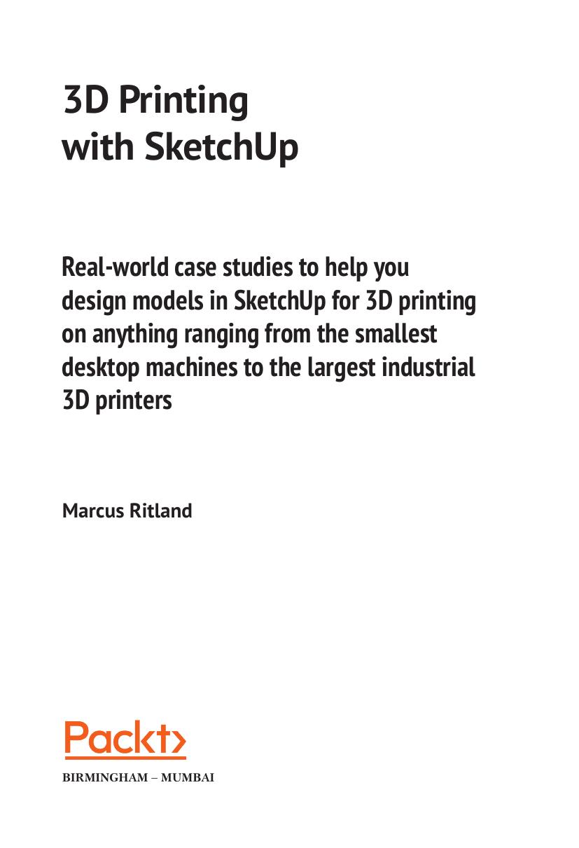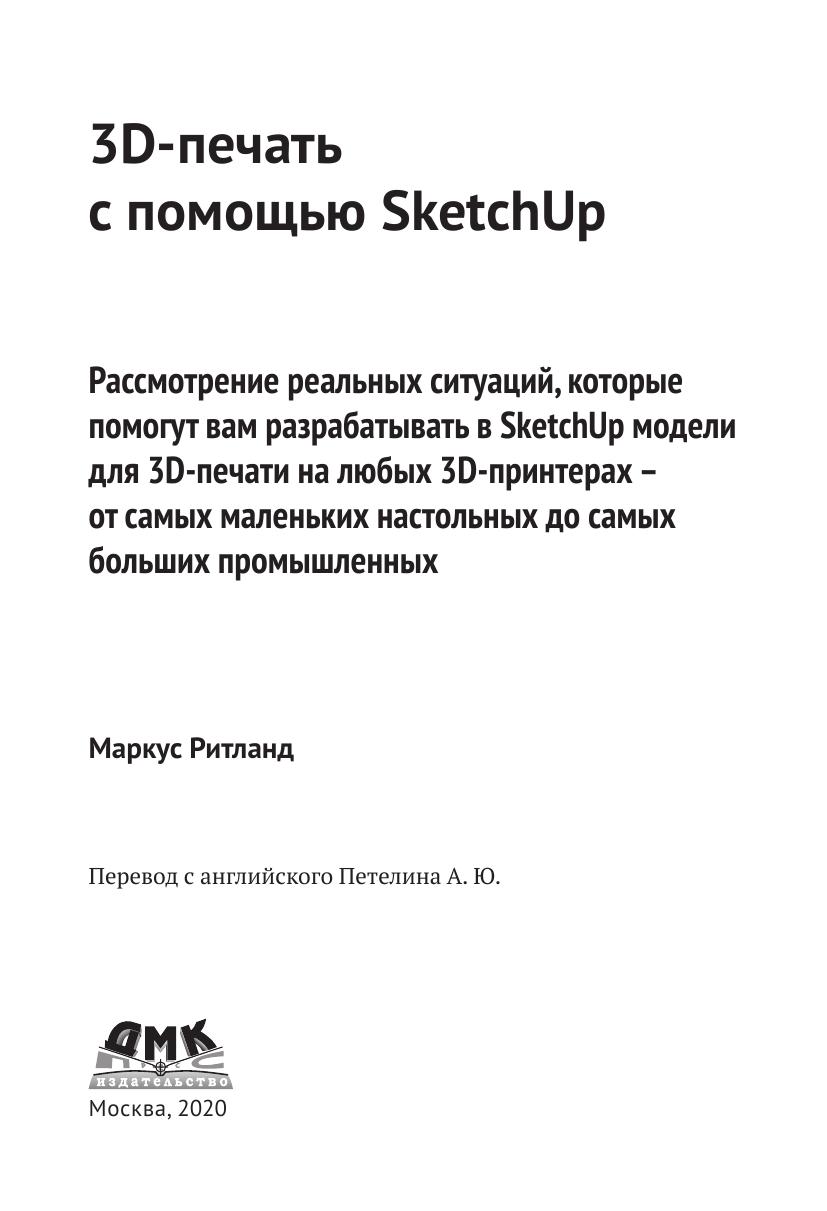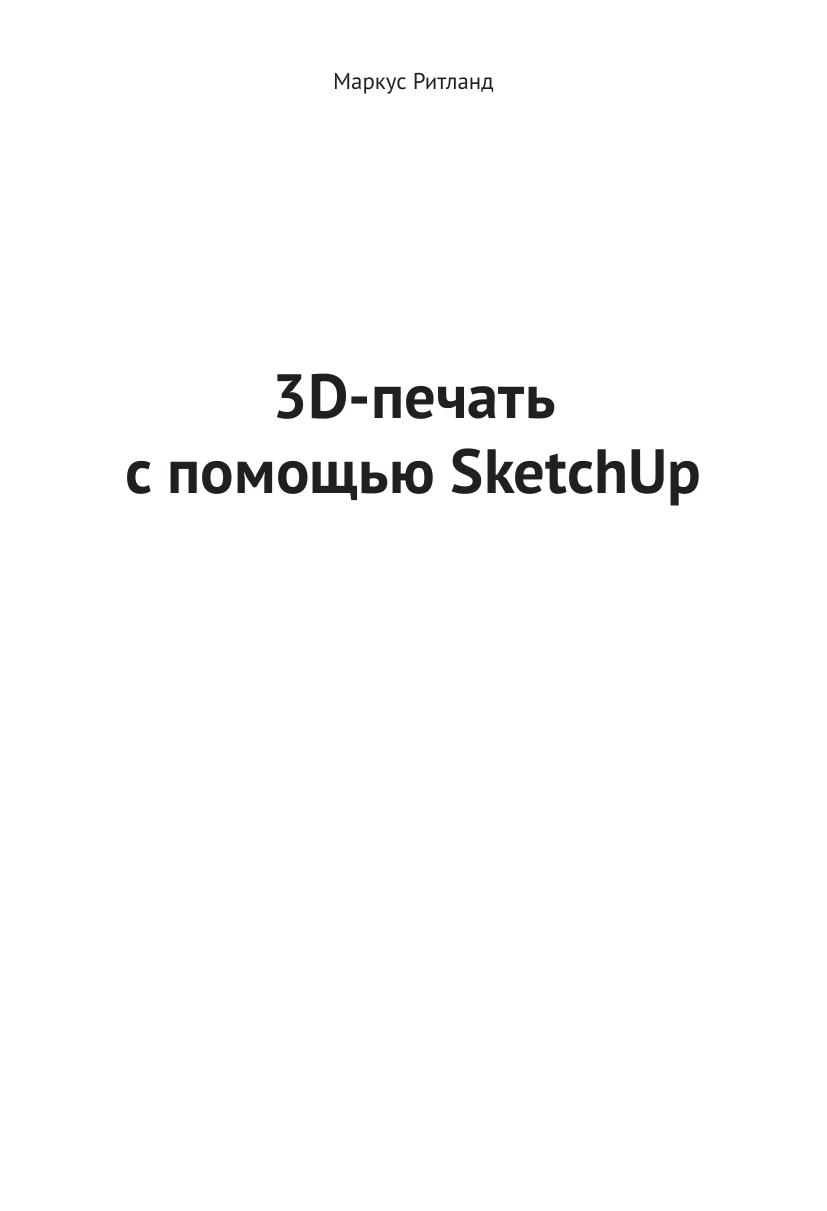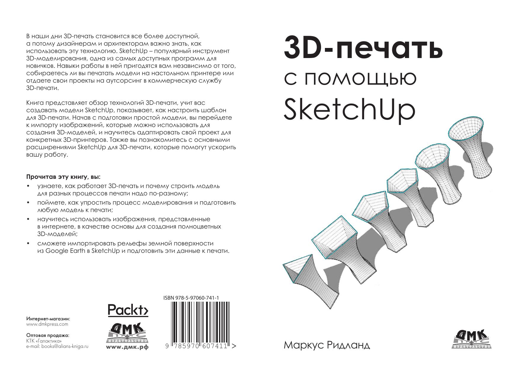 Данная книга представляет собой руководство по подготовке моделей для 3D-печати в популярной программе SketchUp. Наряду с теорией (принципы 3D-печати и моделирования) читатель получит ряд практических навыков, позволяющий распечатывать трехмерные объекты для самых разных целей.