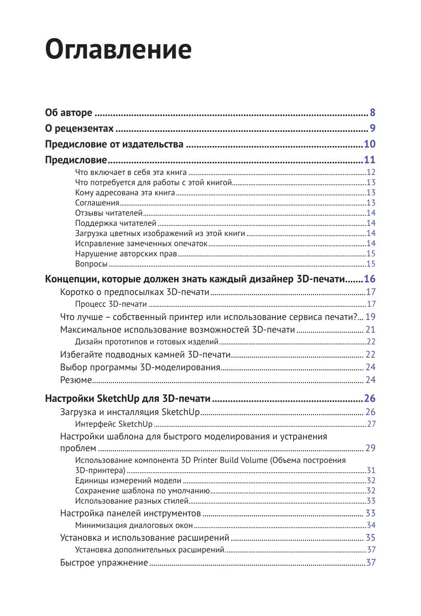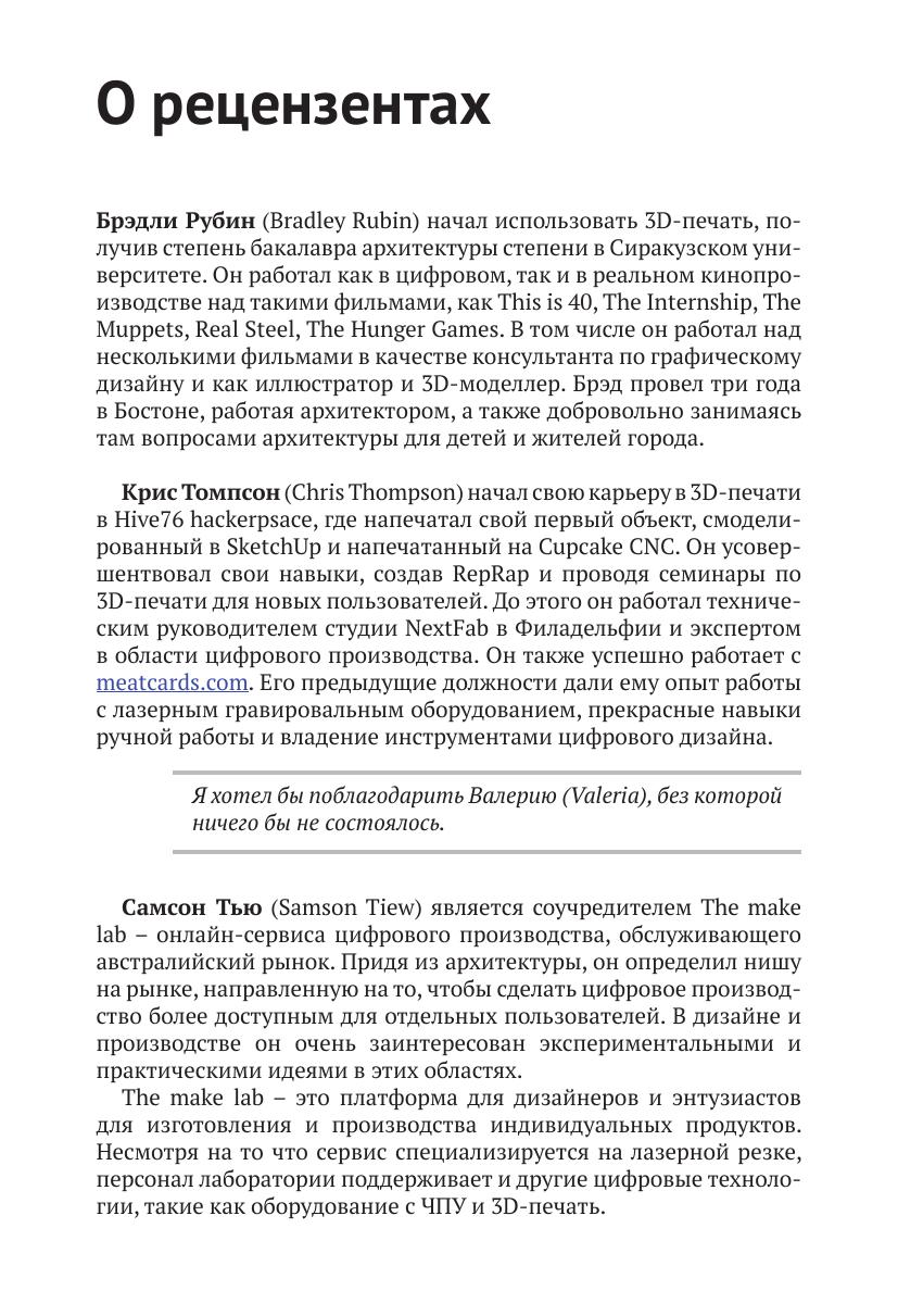 Автор рассматривает наиболее важные концепции дизайна моделей, предназначенных для 3D-печати: от толщины стенок и моделирования твердых тел до использования доступных моделей и их адаптации под нужды пользователя. Иллюстрации дают наглядное представление о процессе работы с 3D-моделями.