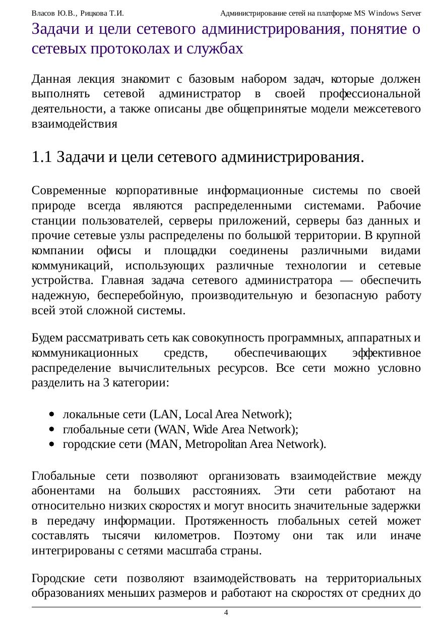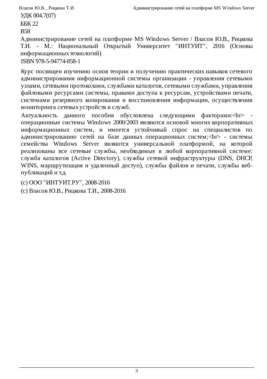 Курс посвящен изучению основ теории и получению практических навыков сетевого администрирования информационной системы организации - управления сетевыми узлами, сетевыми протоколами, службами каталогов, сетевыми службами, управления файловыми ресурсами системы, правами доступа к ресурсам, устройствами печати, системами резервного копирования и восстановления информации, осуществления мониторинга сетевых устройств и служб.