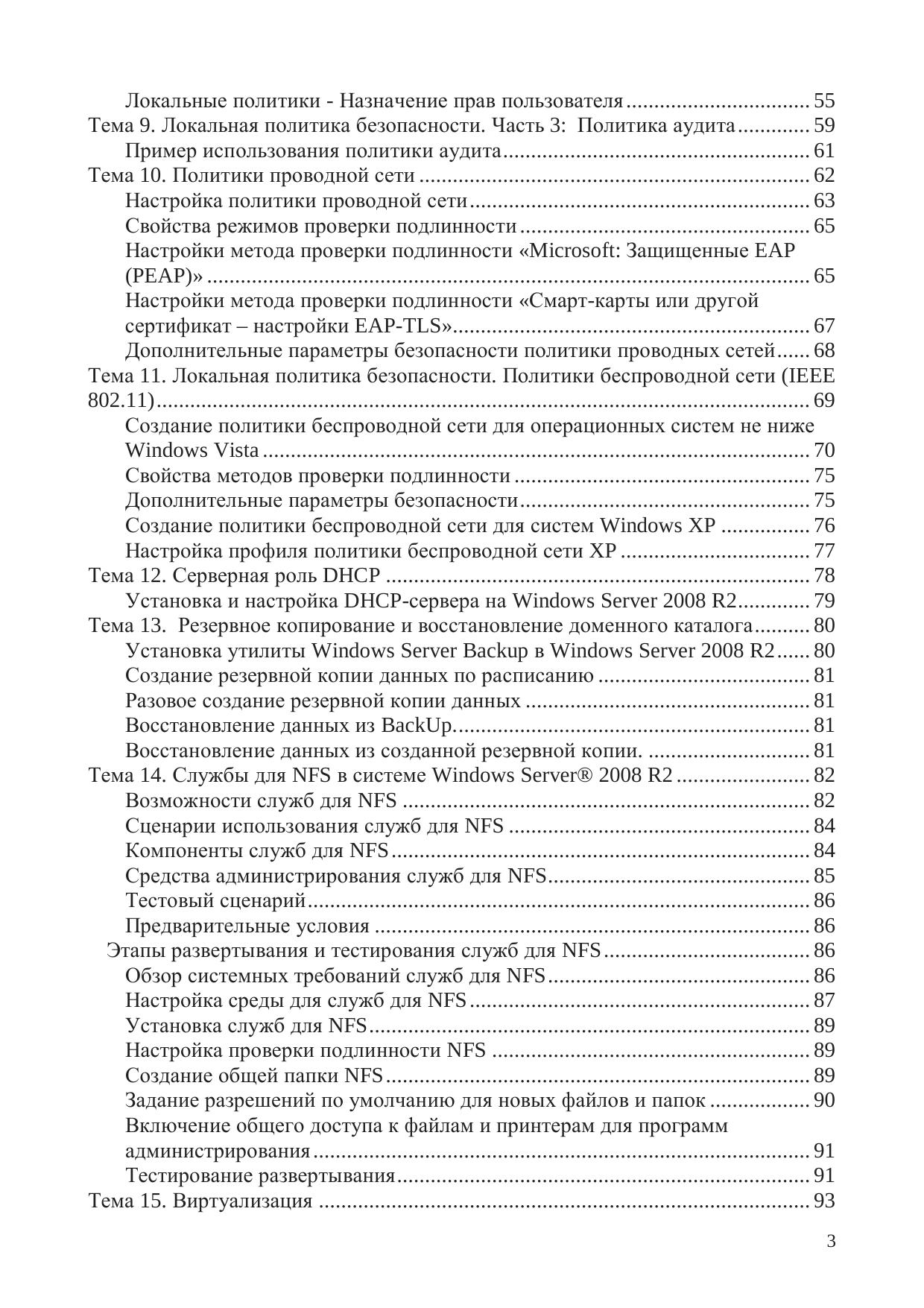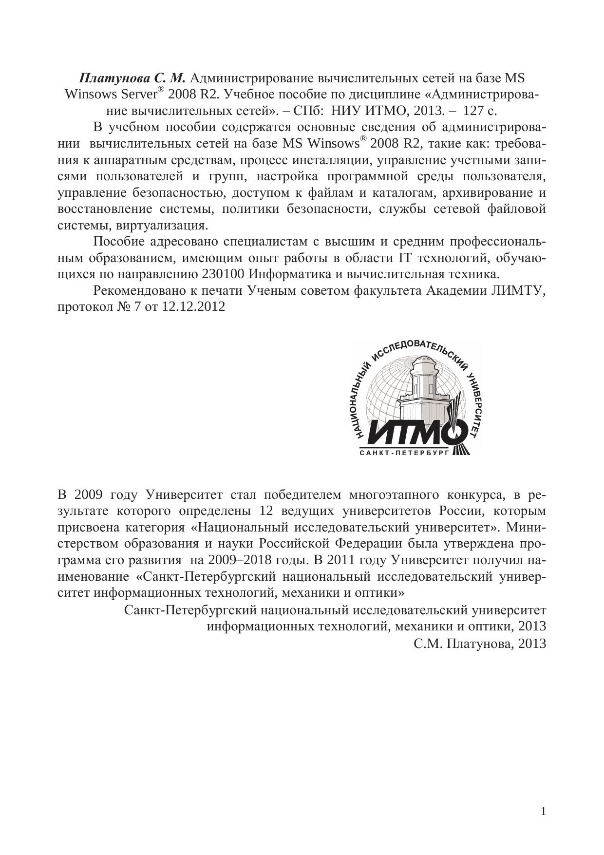 В учебном пособии содержатся основные сведения об администрировании вычислительных сетей на базе MS Winsows ® 2008 R2, такие как: требования к аппаратным средствам, процесс инсталляции, управление учетными записями пользователей и групп, настройка программной среды пользователя, управление безопасностью, доступом к файлам и каталогам, архивирование и восстановление системы, политики безопасности, службы сетевой файловой системы, виртуализация. Пособие адресовано специалистам с высшим и средним профессиональным образованием, имеющим опыт работы в области IT технологий, обучающихся по направлению 230100 Информатика и вычислительная техника.