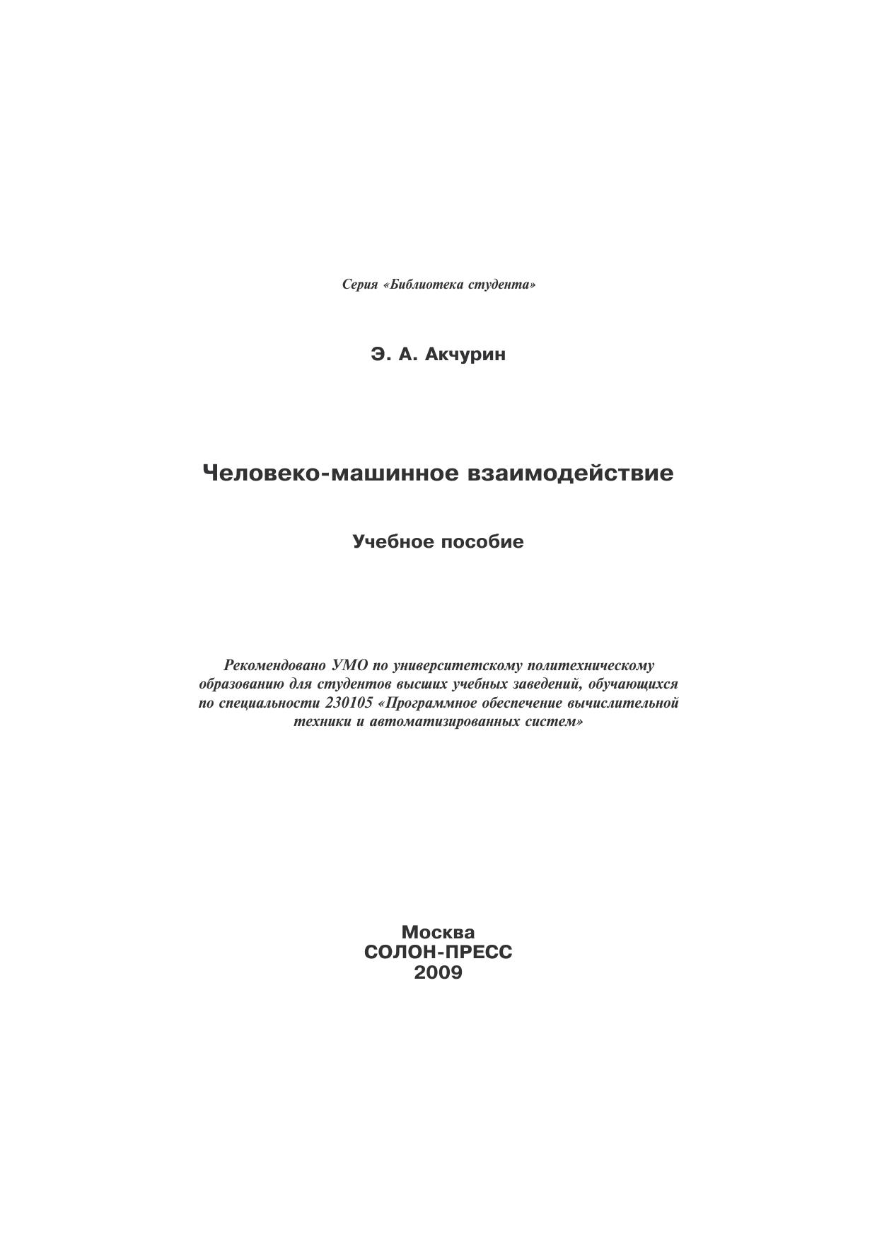 Книга представляет собой учебное пособие по дисциплине «Человеко-машинное взаимодействие», входящей в федеральный список дисциплин направления подготовки 230105.В книге рассматриваются все основные аспекты человеко-машинного взаимодействия, которые должны учитываться при разработке современного программного обеспечения. Она предназначена для студентов, аспирантов и технических специалистов, которые хотят получить базовые знания о концепциях разработки ориентированных на пользователя программных продуктов.