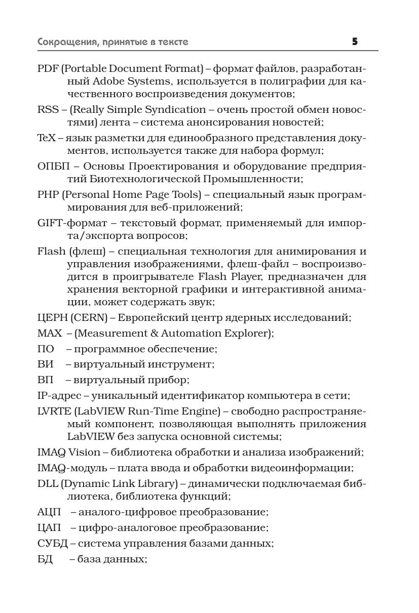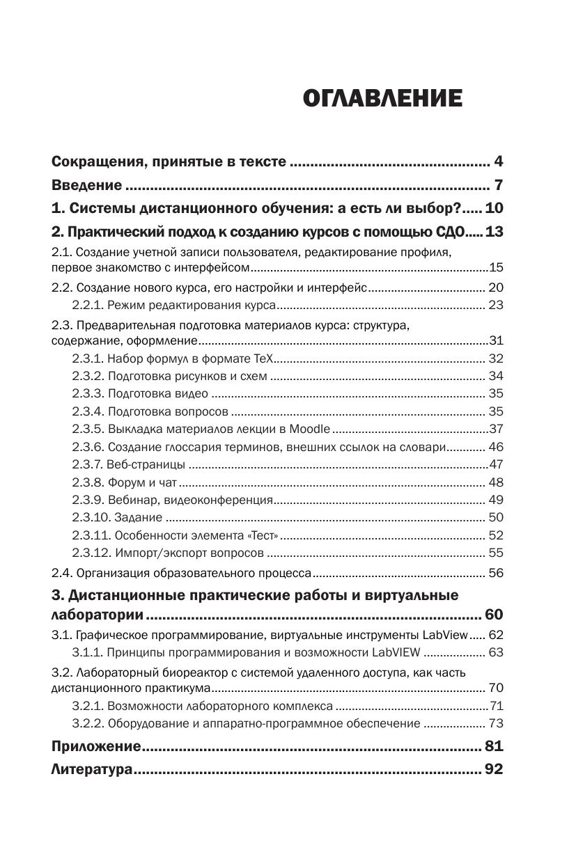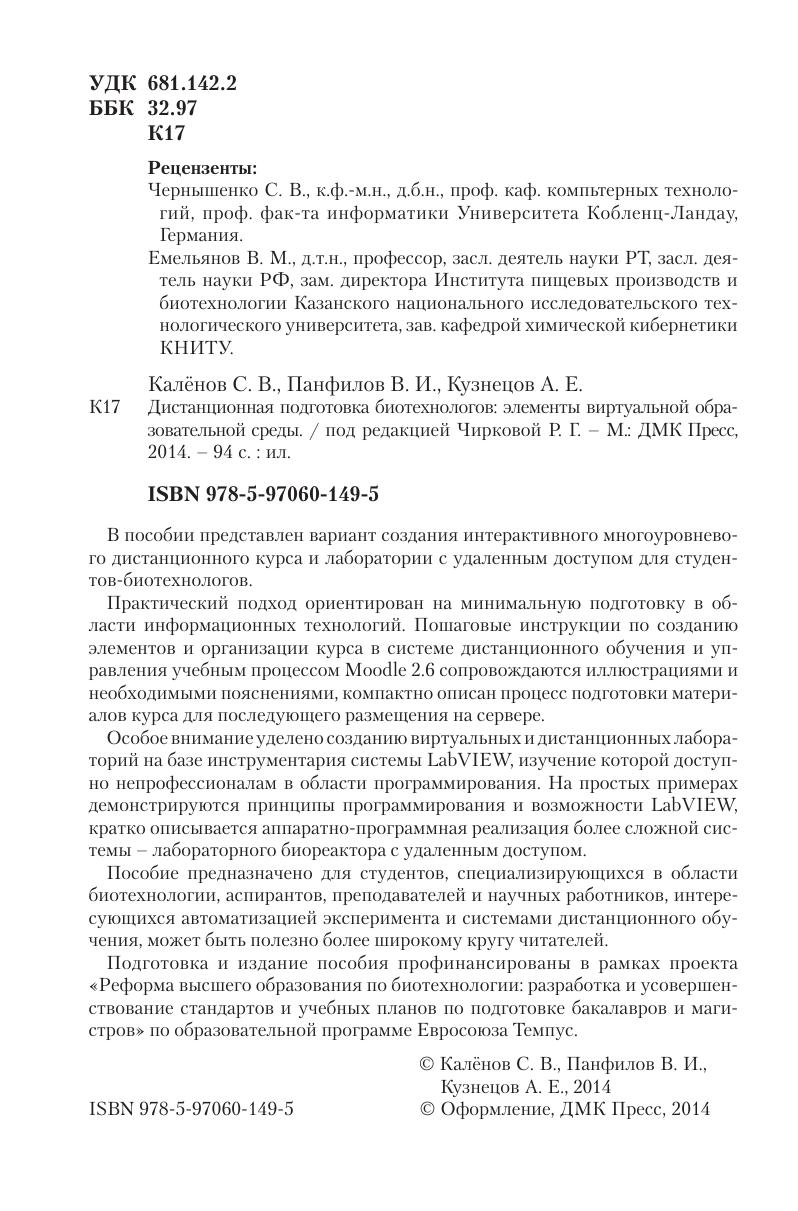 В пособии представлен вариант создания интерактивного многоуровневого дистанционного курса и лаборатории с удаленным доступом для студентов-биотехнологов. Практический подход ориентирован на минимальную подготовку в области информационных технологий. Пошаговые инструкции по созданию элементов и организации курса в системе дистанционного обучения и управления учебным процессом Moodle 2.6 сопровождаются иллюстрациями и необходимыми пояснениями, компактно описан процесс подготовки материалов курса для последующего размещения на сервере. Особое внимание уделено созданию виртуальных и дистанционных лабораторий на базе инструментария системы LabVIEW, изучение которой доступно непрофессионалам в области программирования. На простых примерах демонстрируются принципы программирования и возможности LabVIEW, кратко описывается аппаратно-программная реализация более сложной системы – лабораторного биореактора с удаленным доступом. Пособие предназначено для студентов, специализирующихся в области биотехнологии, аспирантов, преподавателей и научных работников, интересующихся автоматизацией эксперимента и системами дистанционного обучения, может быть полезно более широкому кругу читателей.