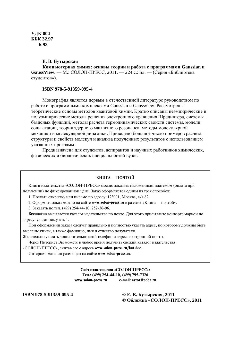 Монография является первым в отечественной литературе руководством по работе с программными комплексами Gaussian и Gaussview. Рассмотрены теоретические основы методов квантовой химии. Кратко описаны неэмпирические и полуэмпирические методы решения электронного уравнения Шредингера, системы базисных функций, методы расчета термодинамических свойств системы, модели сольватации, теория ядерного магнитного резонанса, методы молекулярной механики и молекулярной динамики. Приведено большое число примеров расчета структуры и свойств молекул и анализа полученных результатов с использованием указанных программ.Предназначена для студентов, аспирантов и научных работников химических, физических и биологических специальностей вузов.