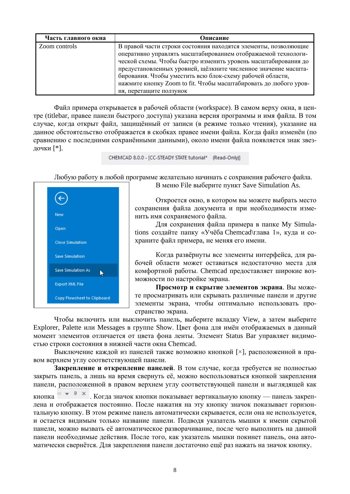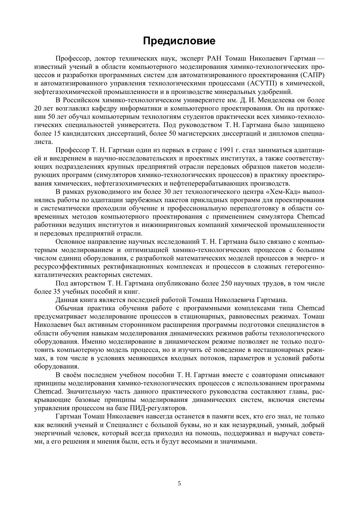 Практическое руководство по работе с программой CHEMCAD на конкретных примерах демонстрирует принципы компьютерного моделирования разнородного технологического оборудования (теплообменники, реакторы, колонны и пр.). Рассмотрены принципы моделирования как статических, так и динамических режимов работы технологического моделирования, в том числе моделирование ПИД-контроллеров. Материал учебного пособия разбит на главы, последовательно раскрывающие отдельные приёмы работы с программой CHEMCAD. Учебное пособие предназначено для практического изучения методов компьютерного моделирования химико-технологических процессов с использованием программы CHEMCAD, в том числе на курсах повышения квалификации, и может быть рекомендовано инженерам, химикам-технологам, занимающимся разработкой процессов и решением задач расчётно-технологического проектирования, а также студентам, магистрам и аспирантам, желающим получить навыки компьютерного моделирования химико-технологических процессов. Изложенные принципы моделирования применимы как при создании новых, так и при оптимизации существующих производств. Предлагаемого практического руководства достаточно для успешного освоения программы CHEMCAD v.8 на базовом уровне. Для более полного понимания основ программы CHEMCAD рекомендуется дополнительно освоить материалы внутренней справочной системы.