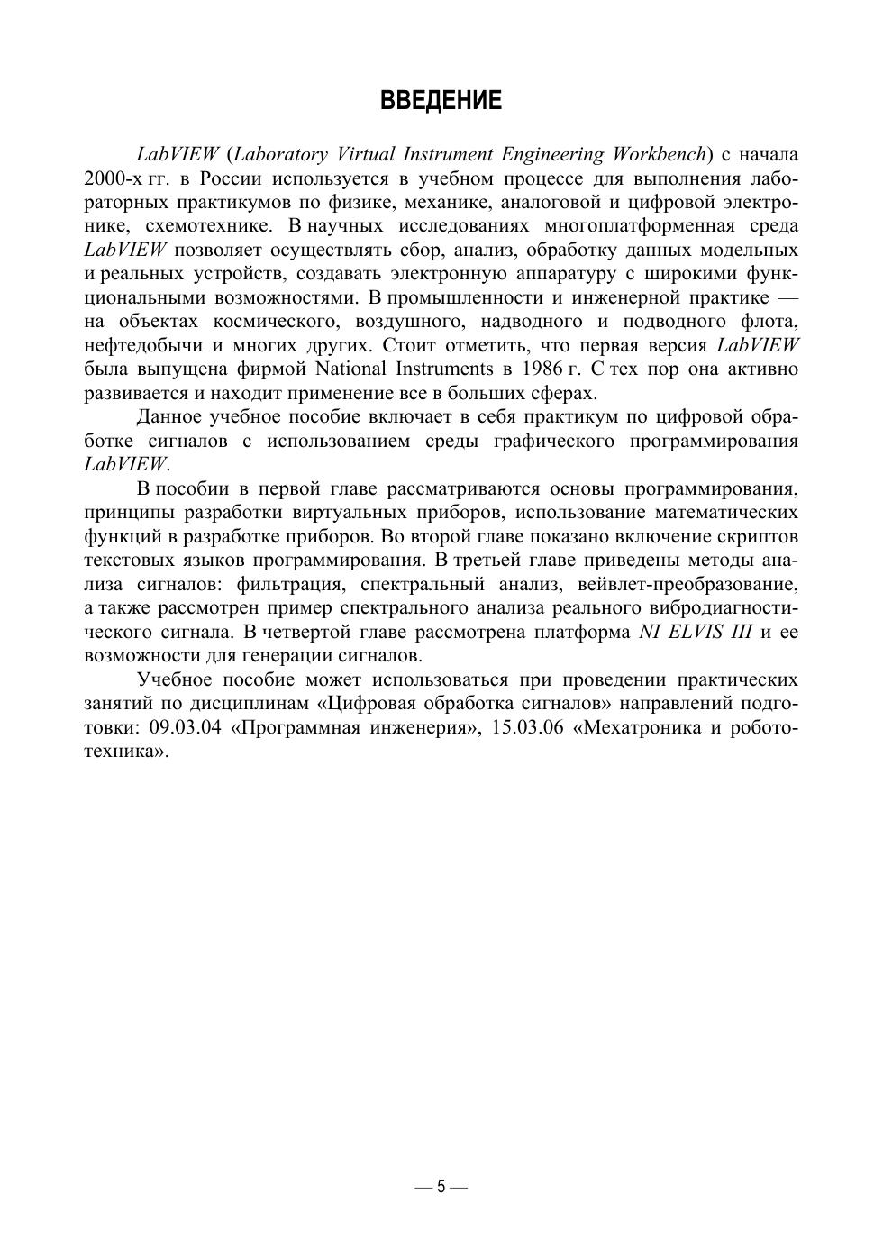 Данное пособие включает в себя практикум по цифровой обработке сигналов с использованием среды графического программирования LabVIEW. В пособии изложены теоретические основы создания виртуальных приборов в среде LabVIEW, приведены практические примеры разработки виртуальных приборов, рассмотрены методы анализа сигналов: фильтрация, спектральный анализ, вейвлет-преобразование. Учебное пособие предназначено для студентов вузов, аспирантов и преподавателей.