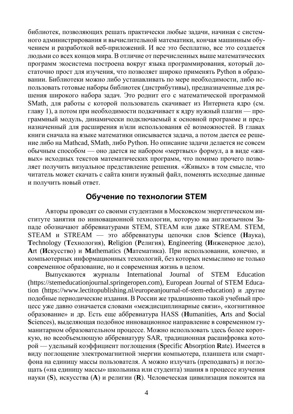 Учебное пособие содержит материалы, необходимые для проведения инженерных расчетов с опорой на междисциплинарный подход STEM (русский термин МИТ — математика, информатика, техника). Изложение базируется на наглядных примерах из различных технических учебных дисциплин с использованием программ из группы Math CAD (Mathcad, Maple, Mathematica и SMath), а также экосистемы Python. Для широкого круга читателей, включая преподавателей, студентов и аспирантов высших технических учебных заведений, а также для школьников инженерных классов.