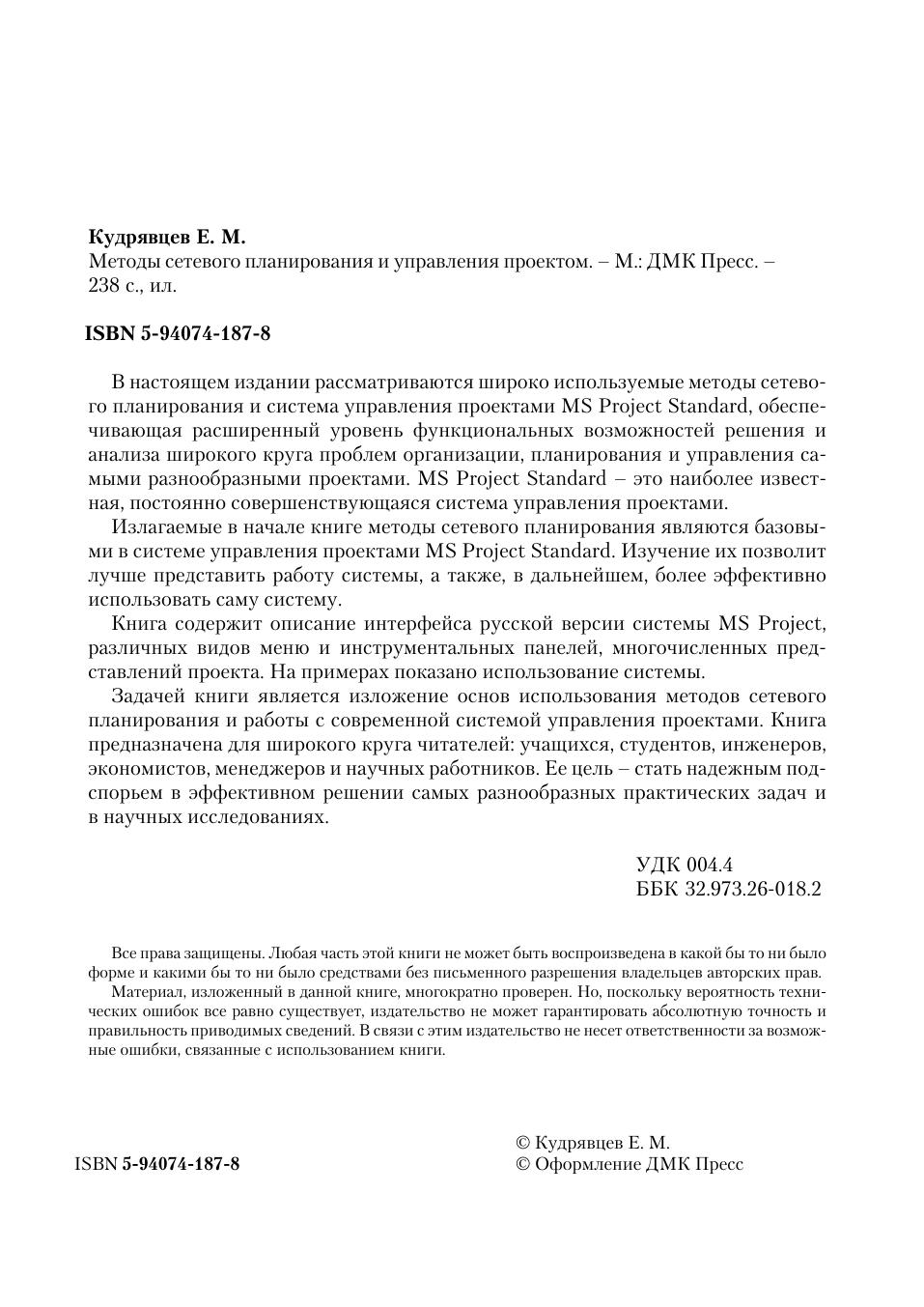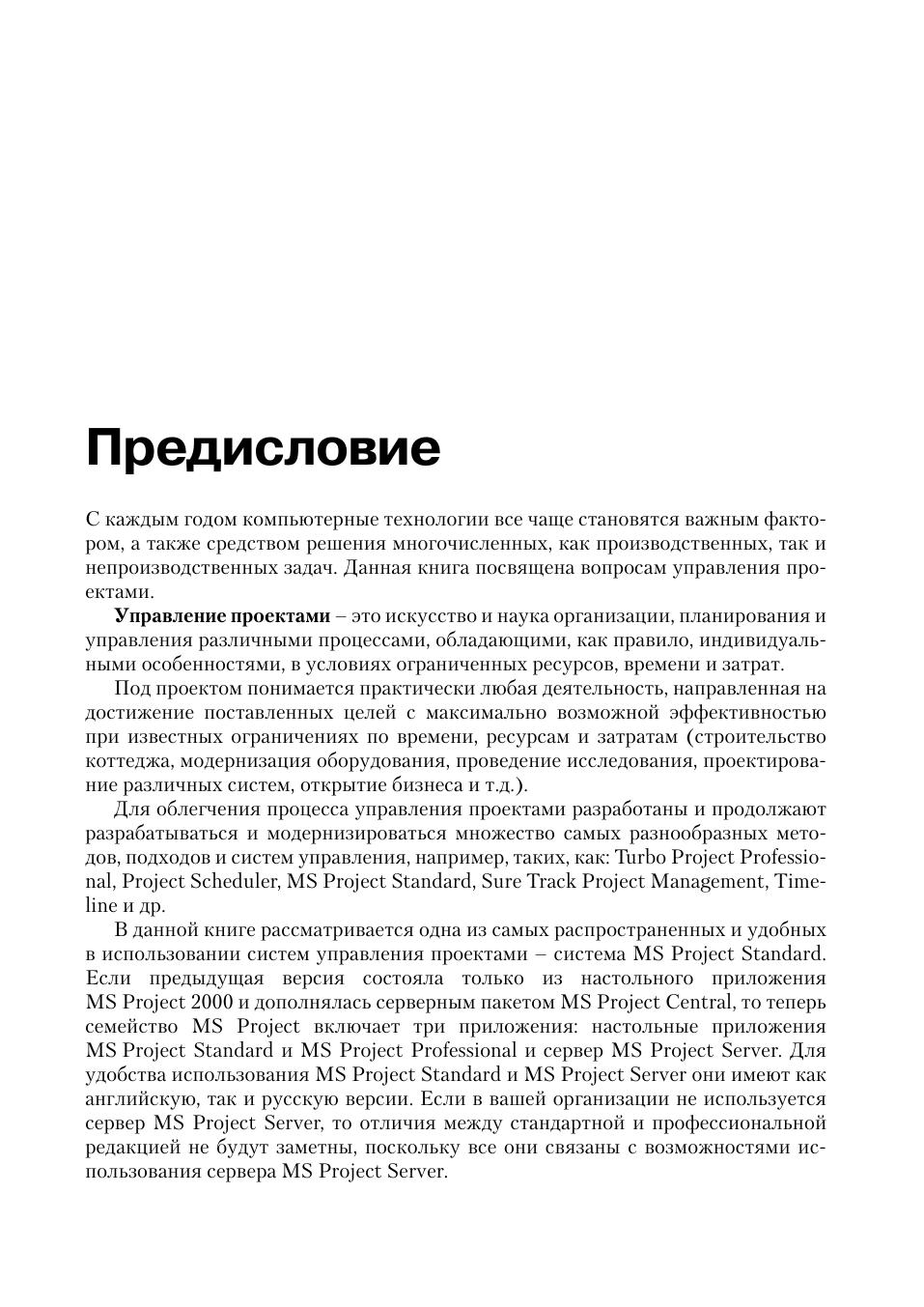 В настоящем издании рассматриваются широко используемые методы сетевого планирования и система управления проектами MS Project Standard, обеспечивающая расширенный уровень функциональных возможностей решения и анализа широкого круга проблем организации, планирования и управления самыми разнообразными проектами. MS Project Standard – это наиболее известная, постоянно совершенствующаяся система управления проектами. Излагаемые в начале книге методы сетевого планирования являются базовыми в системе управления проектами MS Project Standard. Изучение их позволит лучше представить работу системы, а также, в дальнейшем, более эффективно использовать саму систему. Книга содержит описание интерфейса русской версии системы MS Project, различных видов меню и инструментальных панелей, многочисленных представлений проекта. На примерах показано использование системы. Задачей книги является изложение основ использования методов сетевого планирования и работы с современной системой управления проектами. Книга предназначена для широкого круга читателей: учащихся, студентов, инженеров, экономистов, менеджеров и научных работников. Ее цель – стать надежным подспорьем в эффективном решении самых разнообразных практических задач и в научных исследованиях.