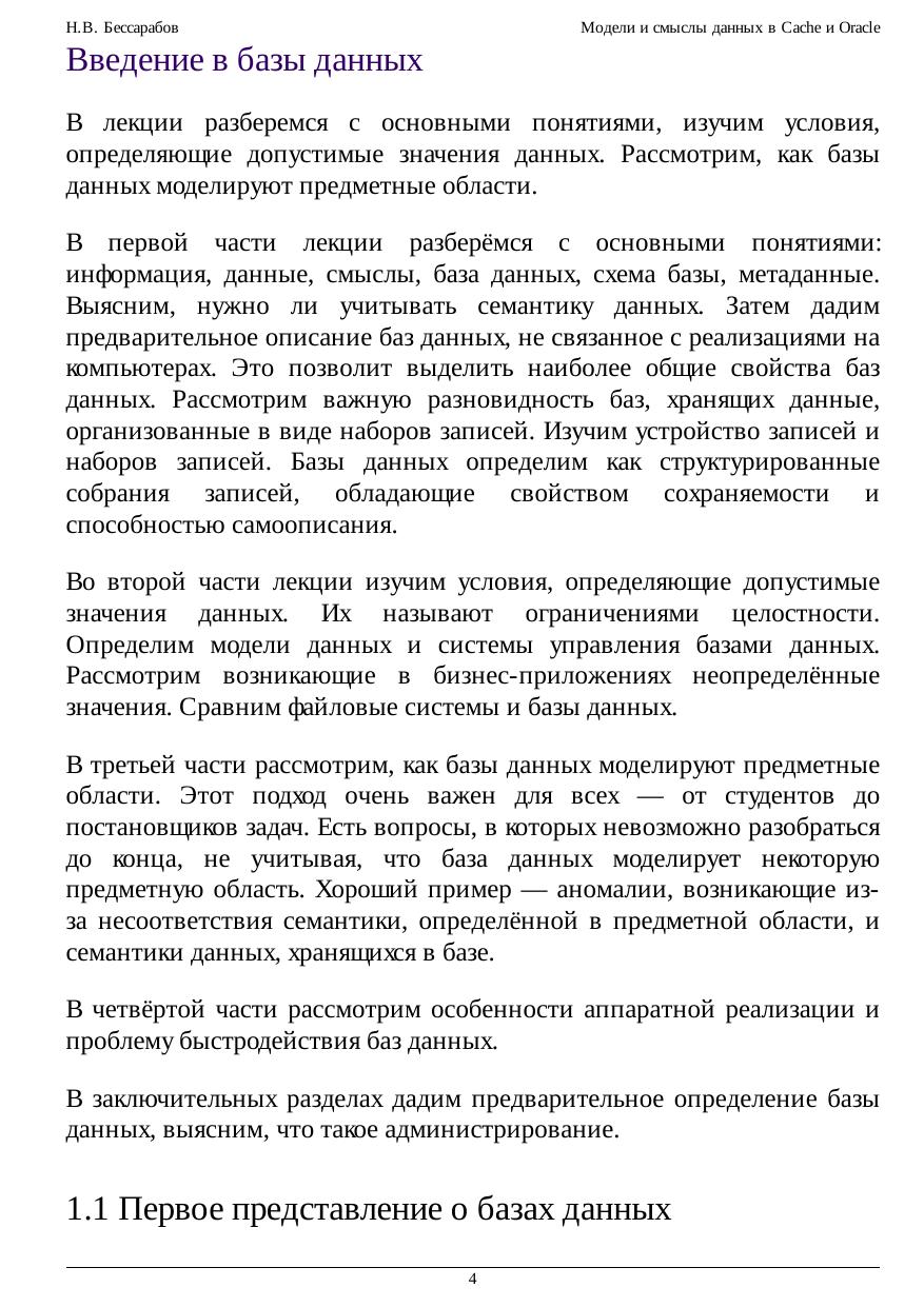 Излагаются основы баз данных. Рассматриваются иерархические, реляционные, объектные и многие другие модели данных, а также отображения между ними. Изучаются языки, основанные на реляционной алгебре и реляционных исчислениях, в том числе SQL и QBE. Много внимания уделяется семантике данных и семантическим расширениям баз данных.