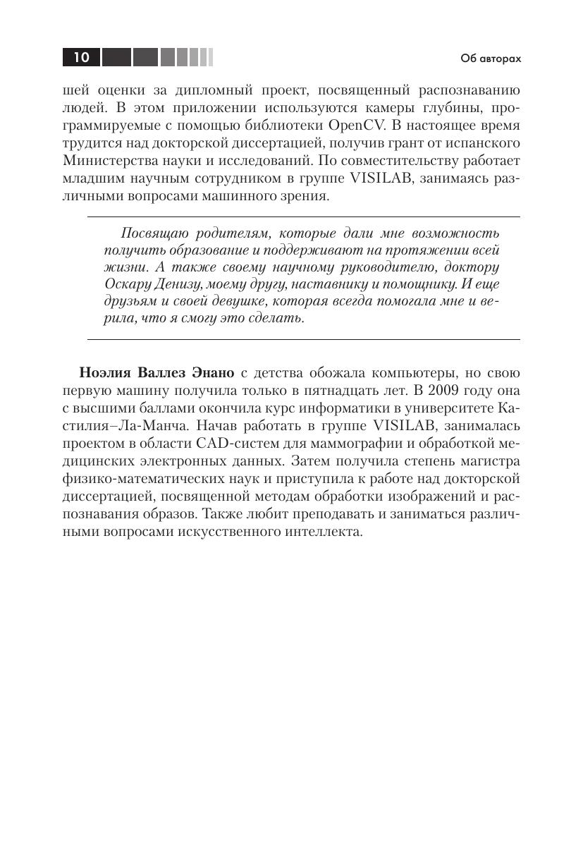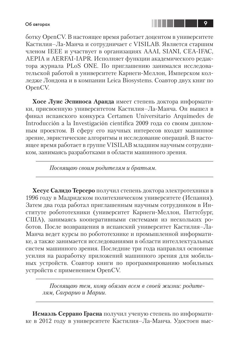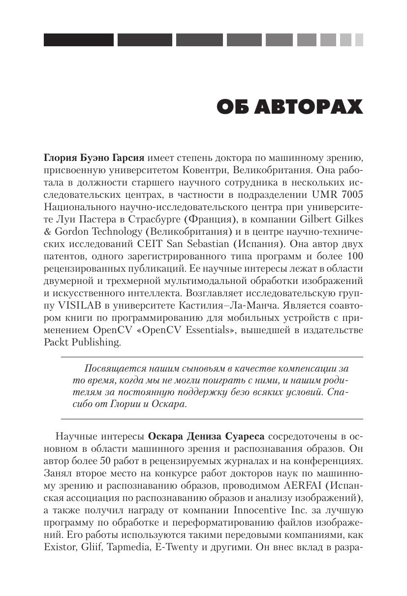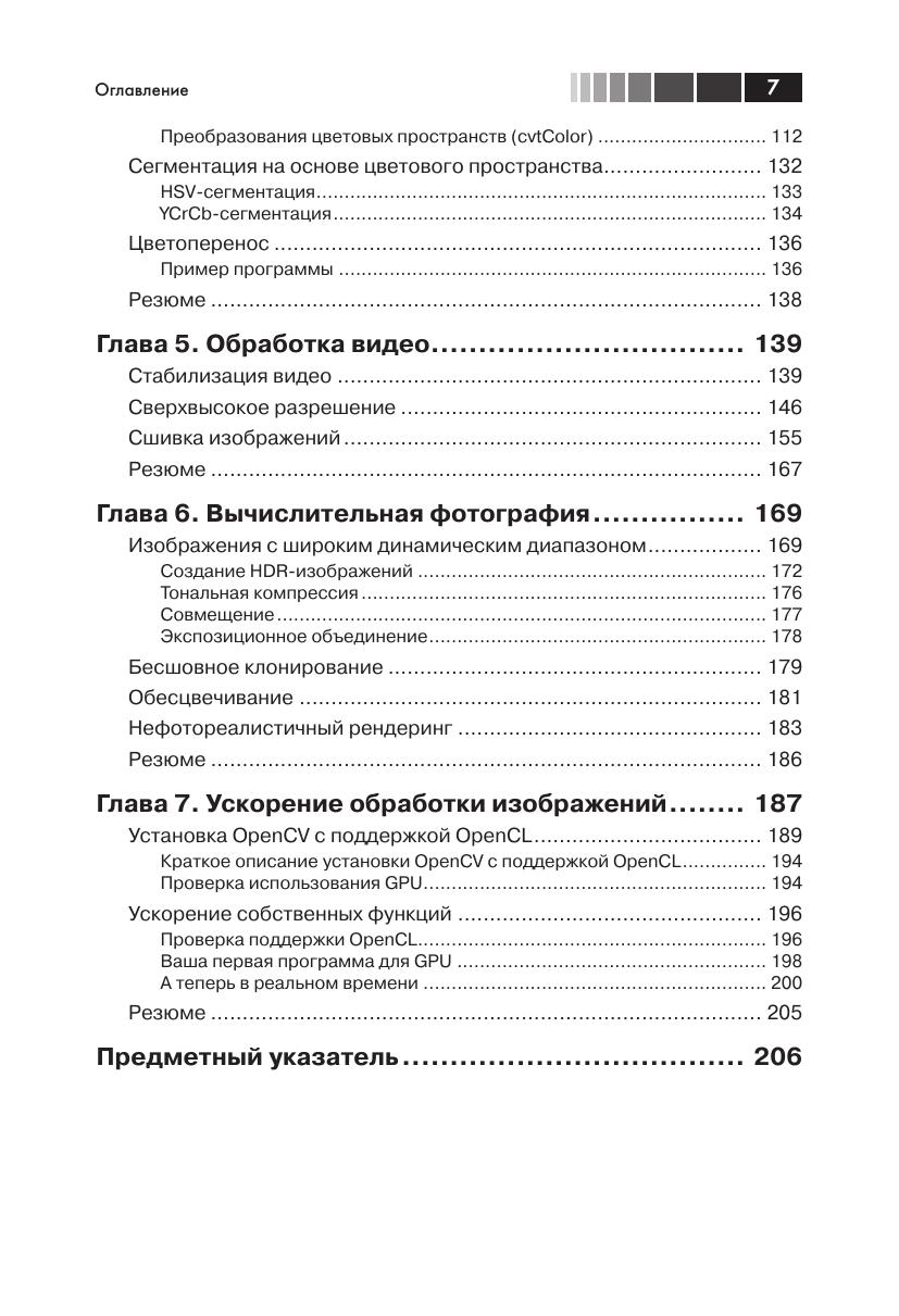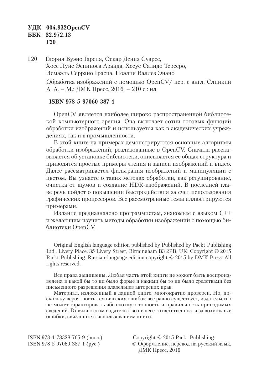 OpenCV является наиболее широко распространенной библиотекой компьютерного зрения. Она включает сотни готовых функций обработки изображений и используется как в академических учреждениях, так и в промышленности. В этой книге на примерах демонстрируются основные алгоритмы обработки изображений, реализованные в OpenCV. Сначала рассказывается об установке библиотеки, описывается ее общая структура и приводятся простые примеры чтения и записи изображений и видео. Далее рассматривается фильтрация изображений и манипуляции с цветом. Вы узнаете о таких методах обработки, как ретуширование, очистка от шумов и создание HDR-изображений. В последней главе речь пойдет о повышении быстродействия за счет использования графических процессоров. Все рассмотренные темы иллюстрируются примерами. Издание предназначено программистам, знакомым с языком С++ и желающим изучить методы обработки изображений с помощью библиотеки OpenCV.