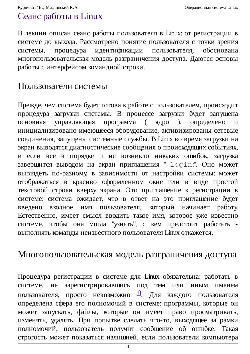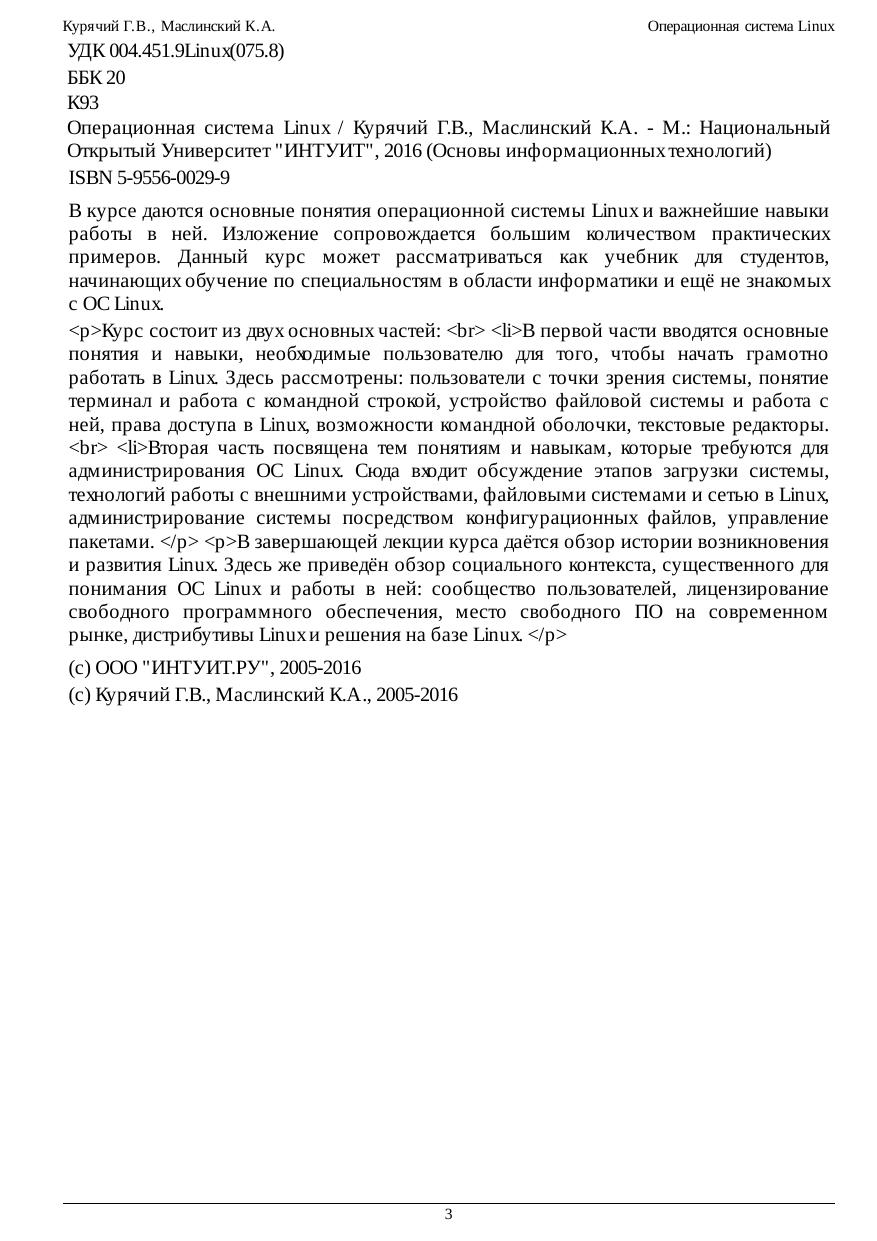 начинающих обучение по специальностям в области информатики и ещё не знакомых с ОС Linux. Курс состоит из двух основных частей: В первой части вводятся основные понятия и навыки, необходимые пользователю для того, чтобы начать грамотно
