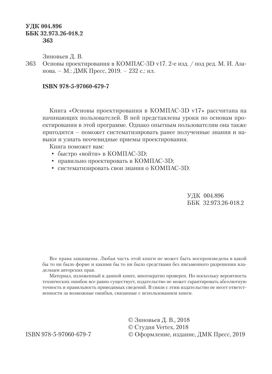 Книга «Основы проектирования в КОМПАС-3D v17» рассчитана на начинающих пользователей. В ней представлены уроки по основам проектирования в этой программе. Однако опытным пользователям она также пригодится – поможет систематизировать ранее полученные знания и навыки и узнать неочевидные приемы проектирования. Книга поможет вам:• быстро «войти» в КОМПАС-3D;• правильно проектировать в КОМПАС-3D;• систематизировать свои знания о КОМПАС-3D.