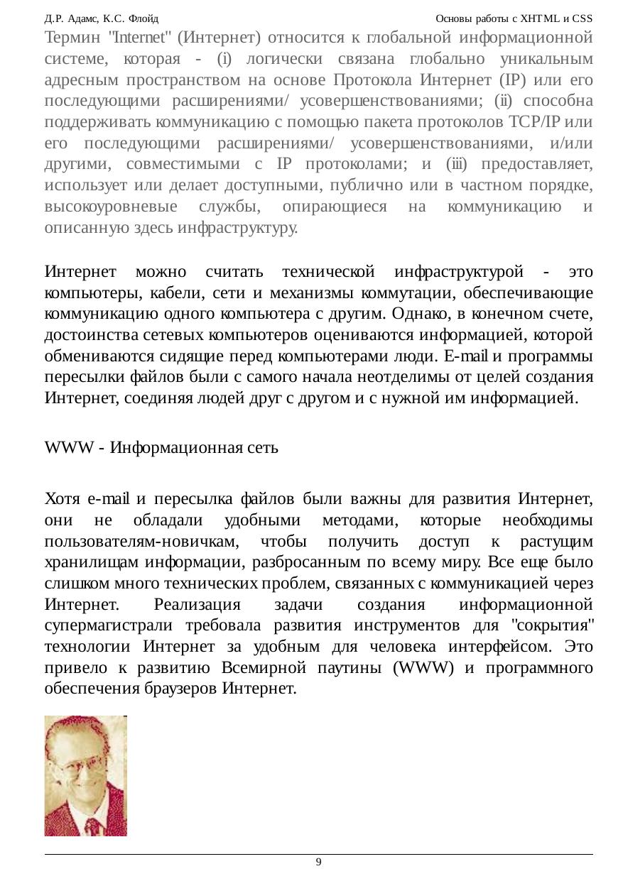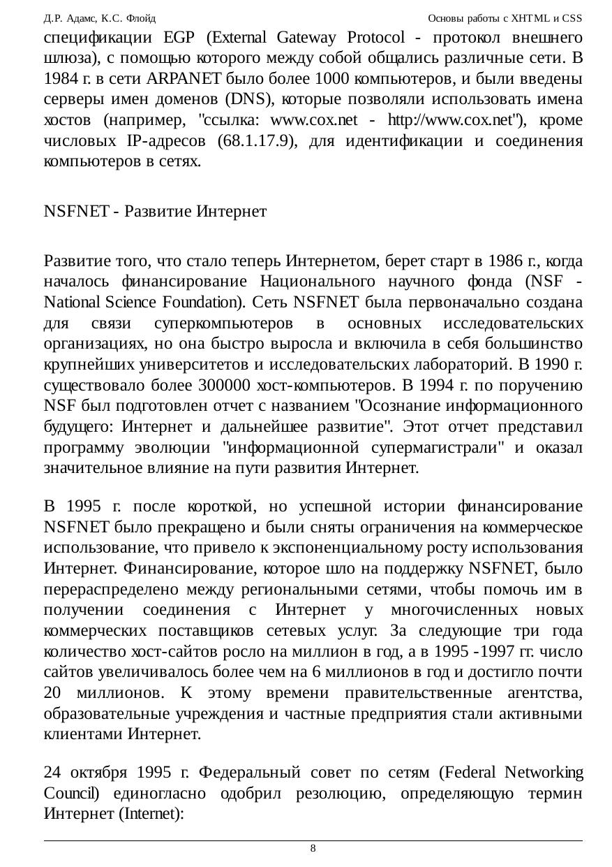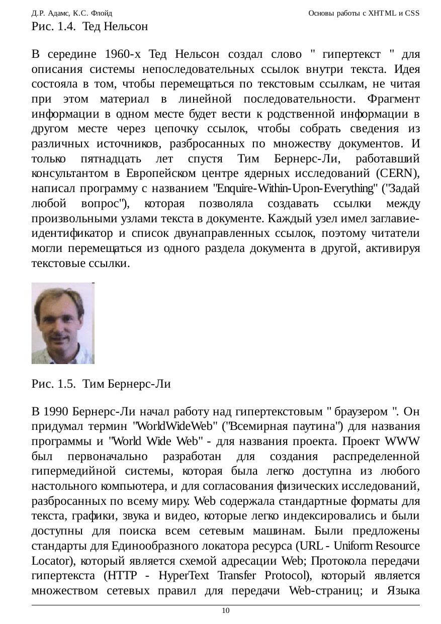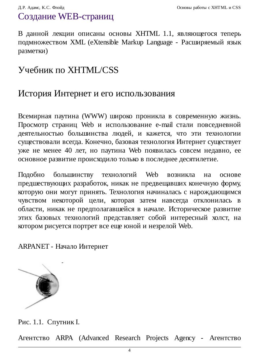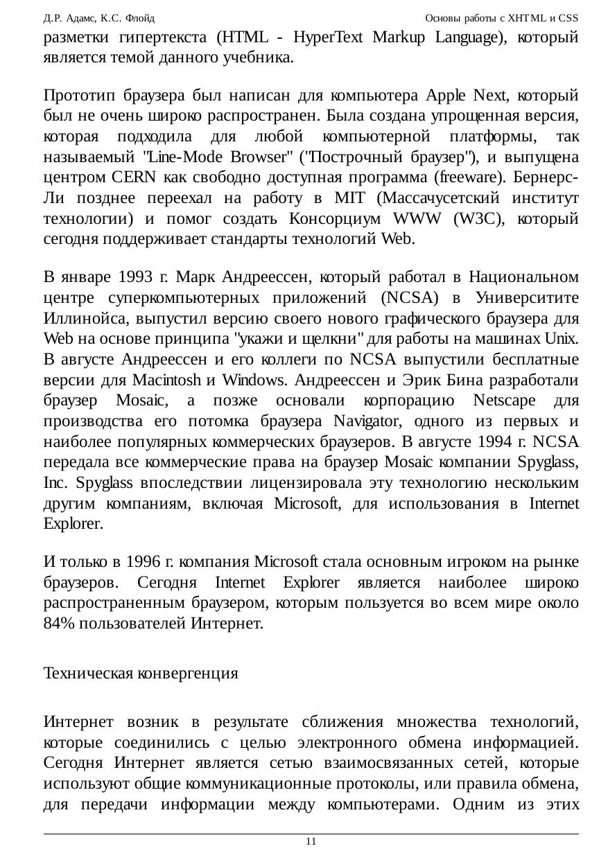 Этот курс предназначен для студентов начального уровня, изучающих разработку приложений Web. Представленные элементы языка соответствуют последним стандартам XHTML (eXtensible HyperText Markup Language - Расширяемый язык разметки гипертекста), опубликованным консорциумом WWW и реализованным в программном обеспечении современных браузеров Web. Подробное рассмотрение XHTML и каскадных таблиц стилей (CSS) знакомит с элементами языка, которые необходимы для создания большинства типов страниц Web с различными широко используемыми свойствами. Материал охватывает XHTML 1.1, последнюю опубликованную реализацию языка, являющуюся теперь подмножеством XML (eXtensible Markup Language - Расширяемый язык разметки). Многие элементы предыдущих версий HTML и XHTML были удалены или заменены новыми методами создания разметки для структурирования и задания стиля страниц Web. Однако многие элементы языка, которые не поддерживаются в версии 1.1, представлены в этом учебнике для совместимости с традиционными методами. Они могут встречаться на существующих страницах, пока не будут вытеснены новыми методами вновь создаваемых страниц.