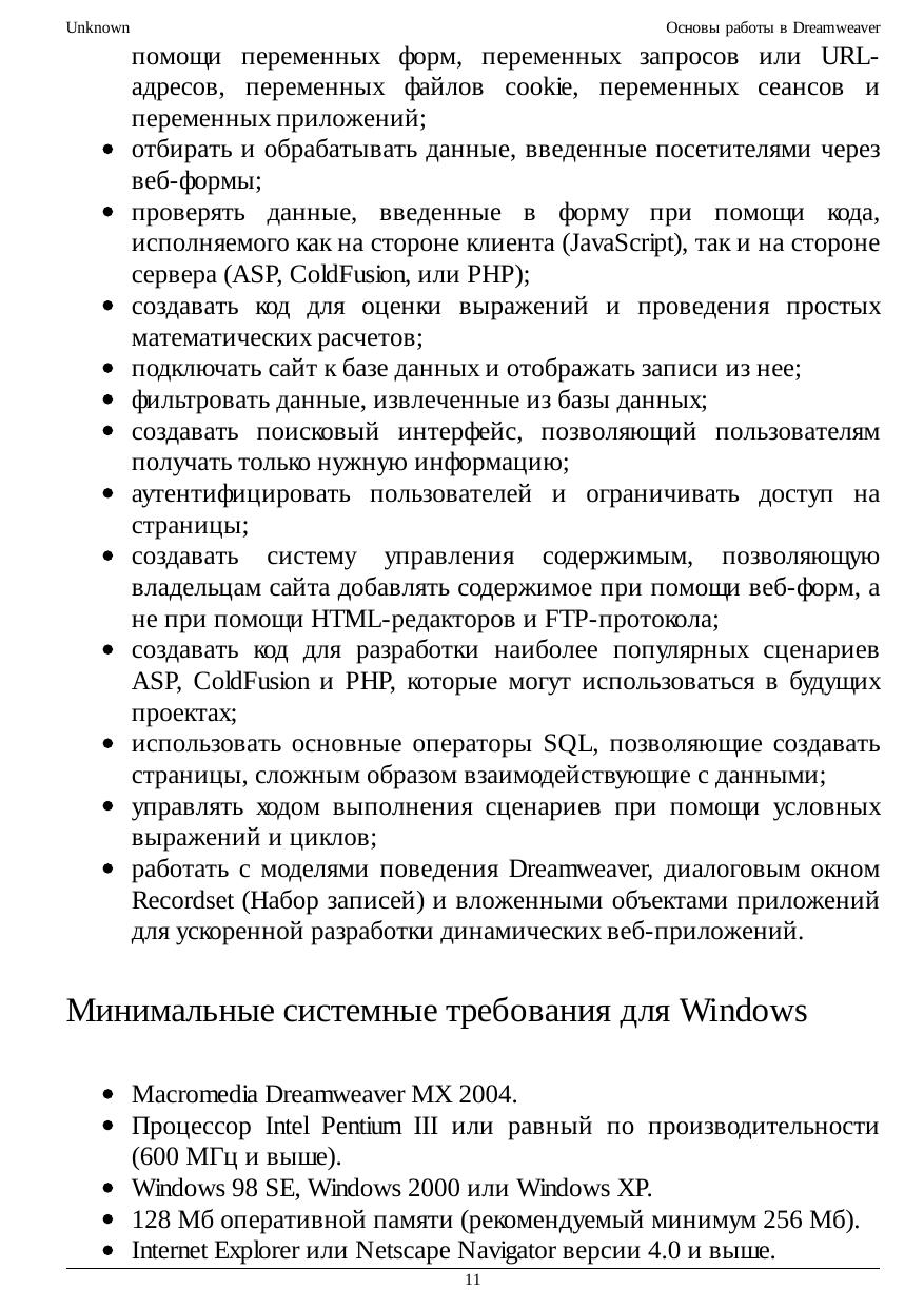 Macromedia Dreamweaver MX. Macromedia Dreamweaver в течение многих лет является лидером на рынке визуальных HTML-редакторов. В программе сочетаются мощь, необычно высокое качество генерации кода и простота использования. Без ущерба для простоты использования или качества генерируемого кода, которые всегда являлись отличительными чертами программы Dreamweaver компании Macromedia, данная программа впитала эти технологии, тем самым предоставив возможность не только работать с каждой из них по отдельности, но и создавать высокоэффективные приложения путем сочетания нескольких.