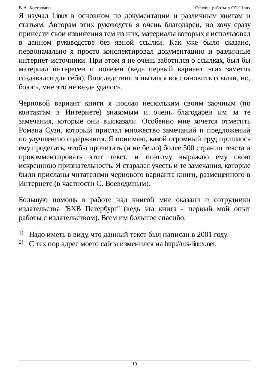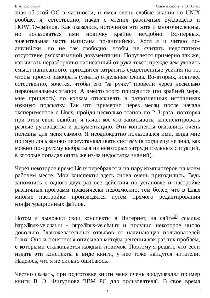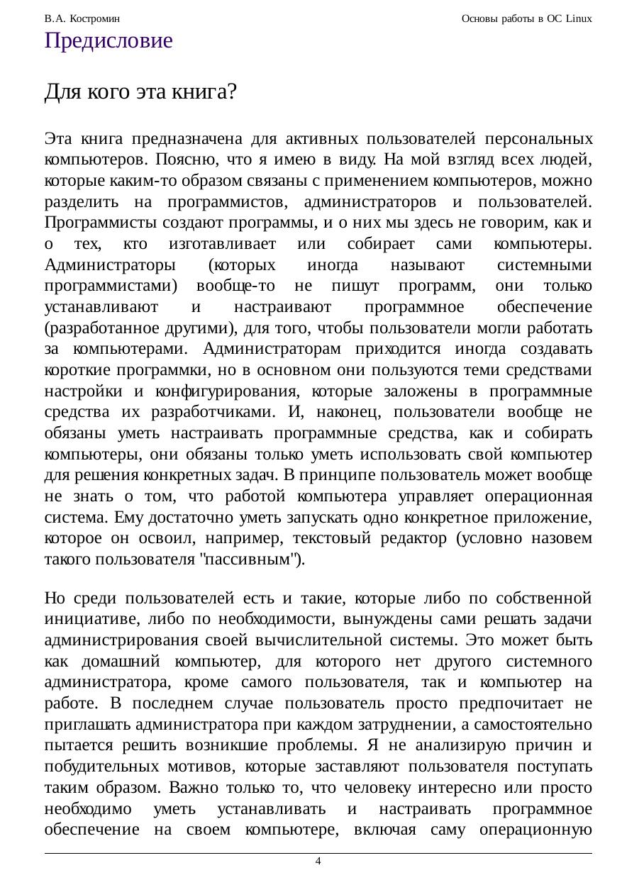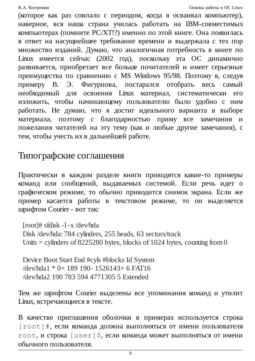 Курс охватывает все аспекты работы с системой - от выбора дистрибутива до тонкой настройки оборудования и использования VMWare. Для активных пользователей, делающих первые шаги в мире Linux. В курсе рассказывается об установке и настройке программного обеспечения на IBM-совместимом персональном компьютере, работающем под управлением операционной системы версий Linux, основанных на дистрибутиве Red Hat: Black Cat Linux версий 5.2 и 6.02, Red Hat версий 6.0, 6.2, 7.1 и 7.2 (русифицированной), ASPLinux 7.1 и ALTLinux Junior 1.0 и 1.1.