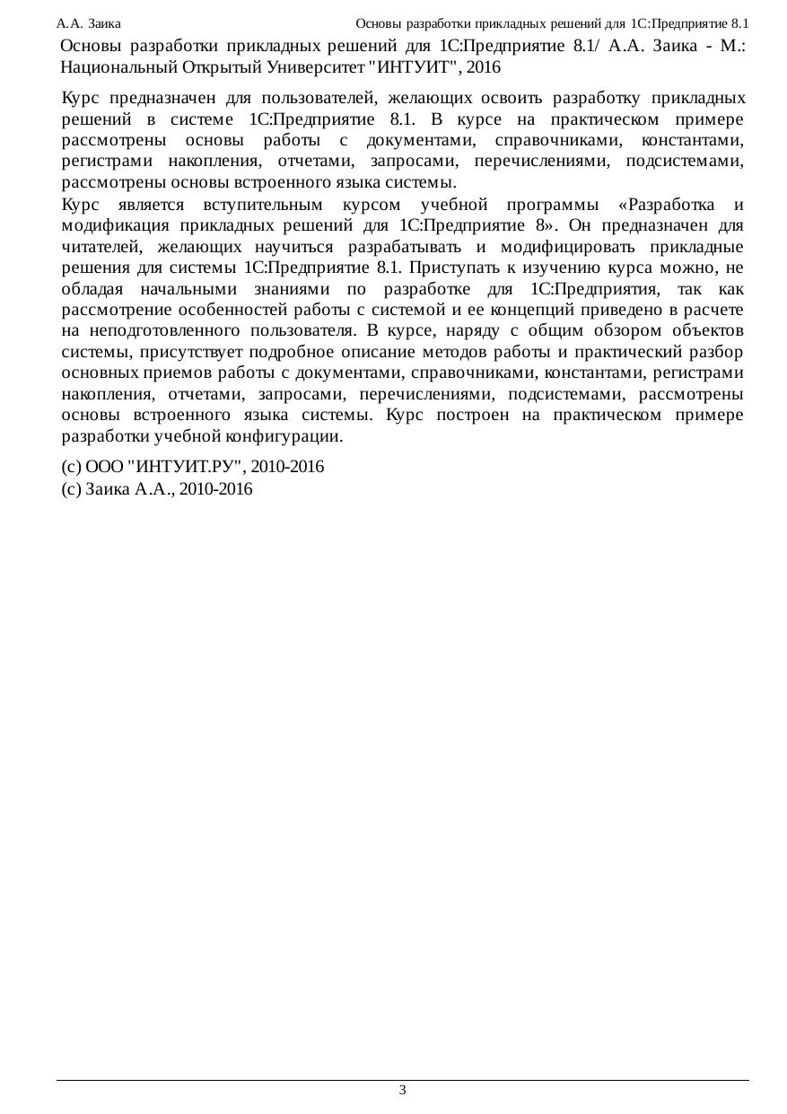 Курс предназначен для пользователей, желающих освоить разработку прикладных решений в системе 1С:Предприятие 8.1. В курсе на практическом примере рассмотрены основы работы с документами, справочниками, константами, регистрами накопления, отчетами, запросами, перечислениями, подсистемами, рассмотрены основы встроенного языка системы. Курс является вступительным курсом учебной программы «Разработка и модификация прикладных решений для 1С:Предприятие 8». Он предназначен для читателей, желающих научиться разрабатывать и модифицировать прикладные решения для системы 1С:Предприятие 8.1. Приступать к изучению курса можно, не обладая начальными знаниями по разработке для 1С:Предприятия, так как рассмотрение особенностей работы с системой и ее концепций приведено в расчете на неподготовленного пользователя. В курсе, наряду с общим обзором объектов системы, присутствует подробное описание методов работы и практический разбор основных приемов работы с документами, справочниками, константами, регистрами накопления, отчетами, запросами, перечислениями, подсистемами, рассмотрены основы встроенного языка системы. Курс построен на практическом примере разработки учебной конфигурации.