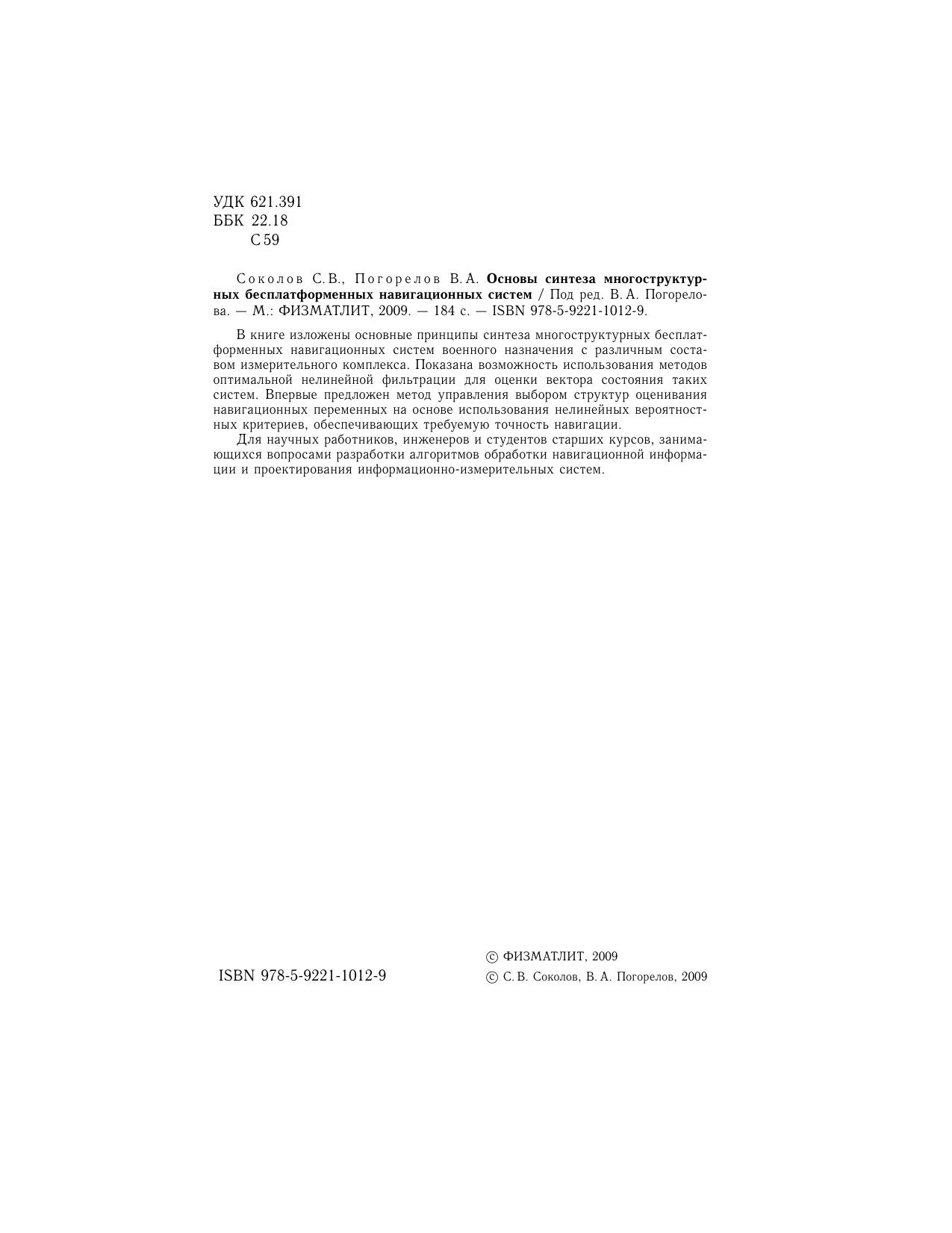 В книге изложены основные принципы синтеза многоструктурных бесплатформенных навигационных систем военного назначения с различным составом измерительного комплекса. Показана возможность использования методов оптимальной нелинейной фильтрации для оценки вектора состояния таких систем. Впервые предложен метод управления выбором структур оценивания навигационных переменных на основе использования нелинейных вероятностных критериев, обеспечивающих требуемую точность навигации. Для научных работников, инженеров и студентов старших курсов, занимающихся вопросами разработки алгоритмов обработки навигационной информации и проектирования информационно-измерительных систем.